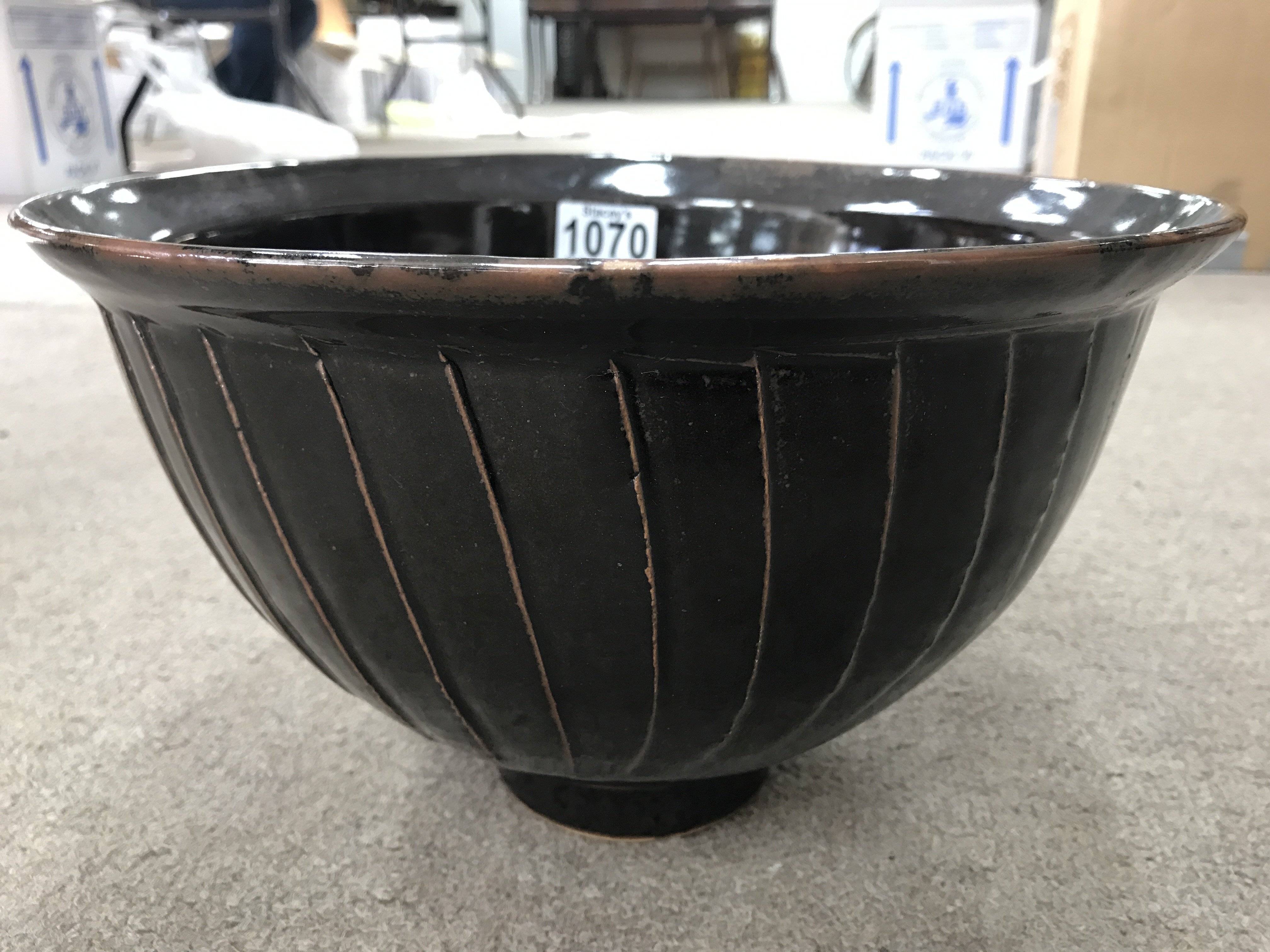 A David Leach stoneware bowl with brown glaze and incised panel decoration. NO RESERVE