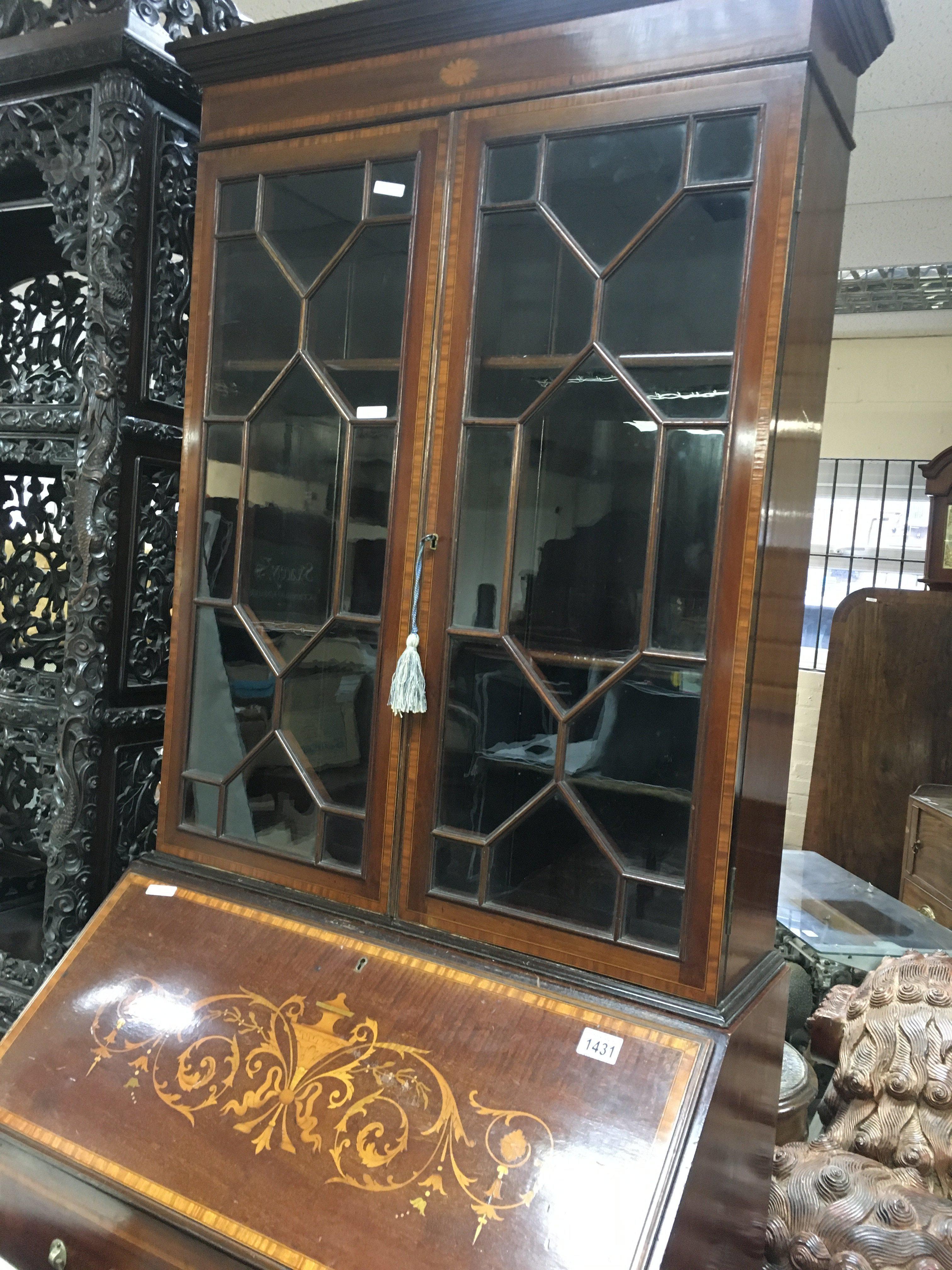 A Edwardian mahogany inlaid bureau bookcase with a pair of glazed doors above a fall front with three drawers under. NO RESERVE