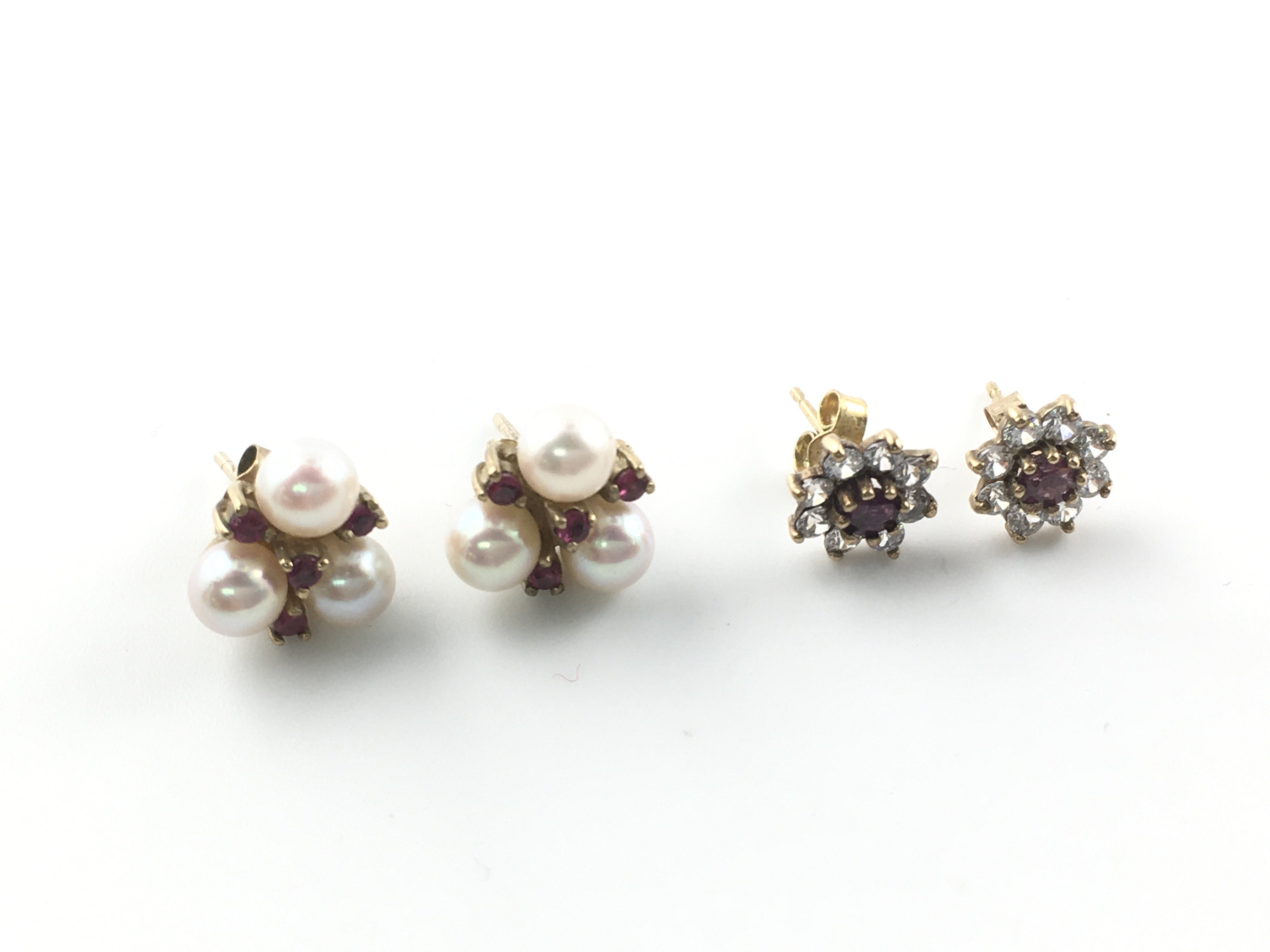 Two pairs of 9ct gold stud earrings set with various stones. 4.99g total.