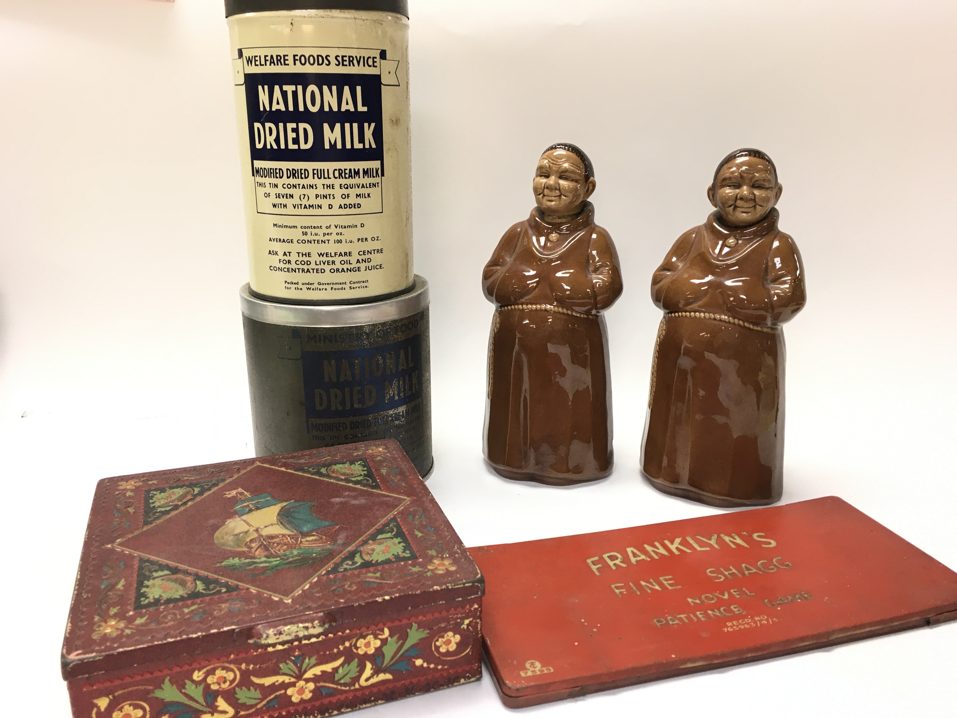An unusual Franklyns Fine Shagg Novel patience game, tins and two ceramic monk decanters. NO RESERVE