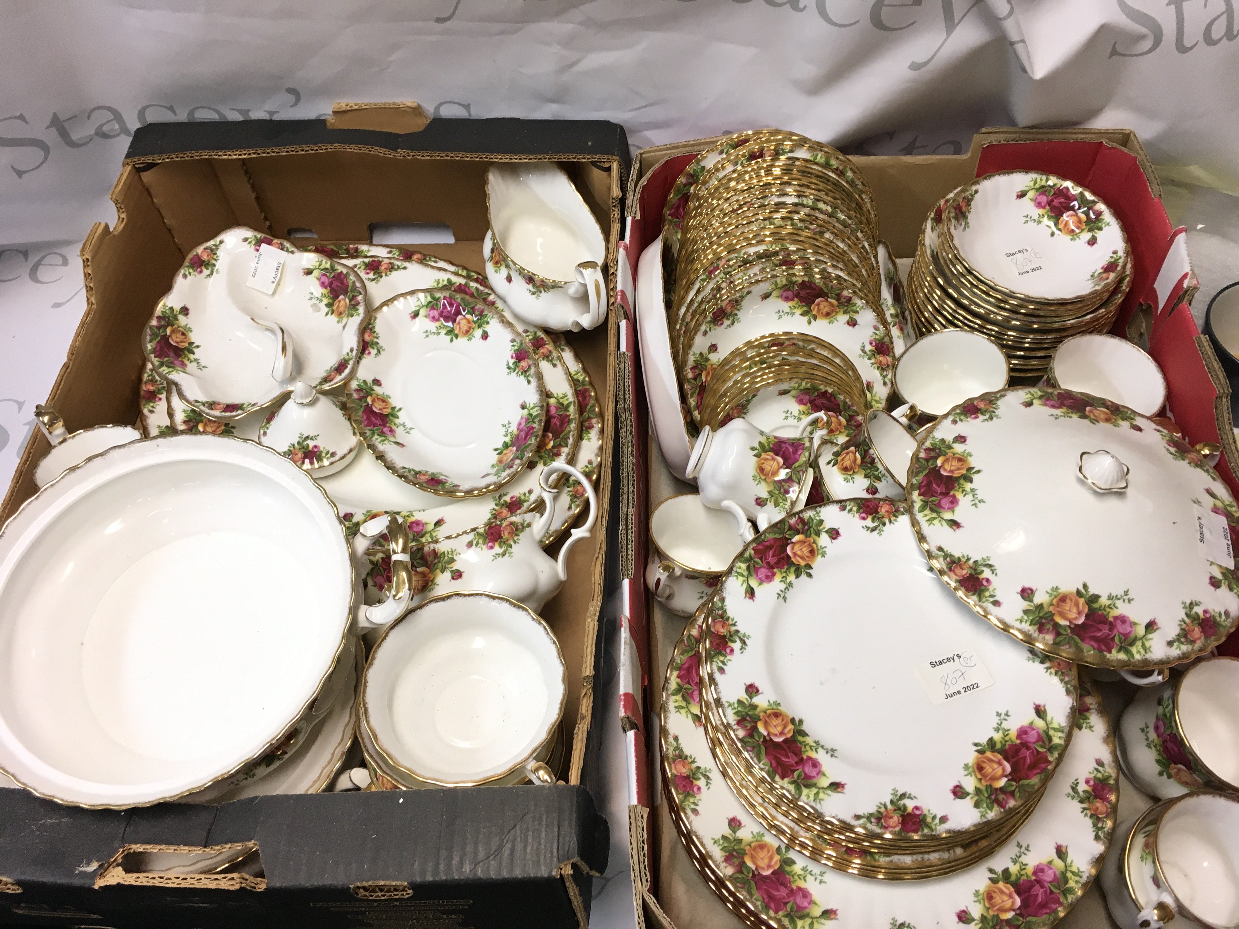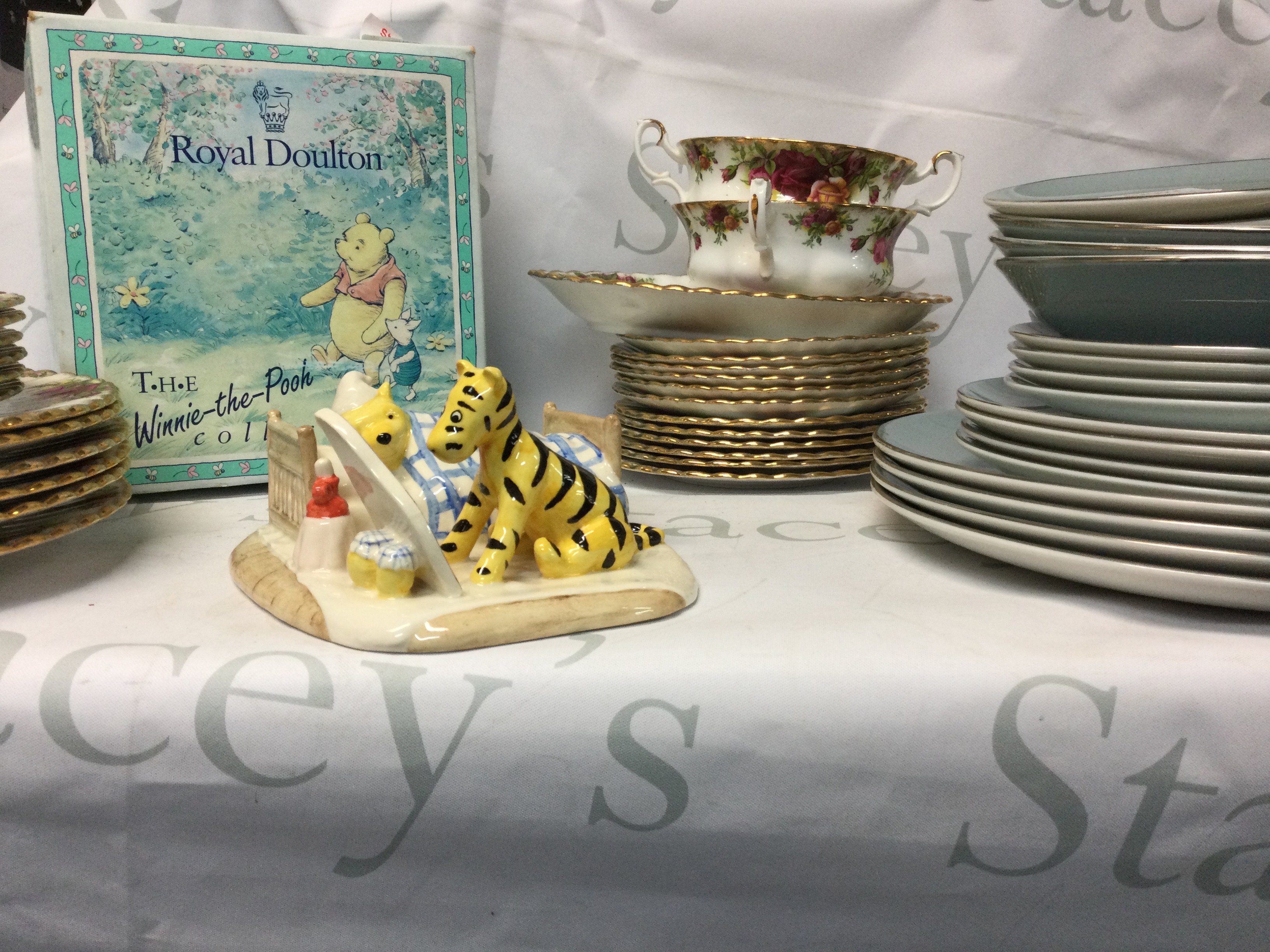 Royal Albert country roses dinner set including plates, cups, saucers etc. Also including Royal Doulton plates and a boxed Winnie the Pooh figure