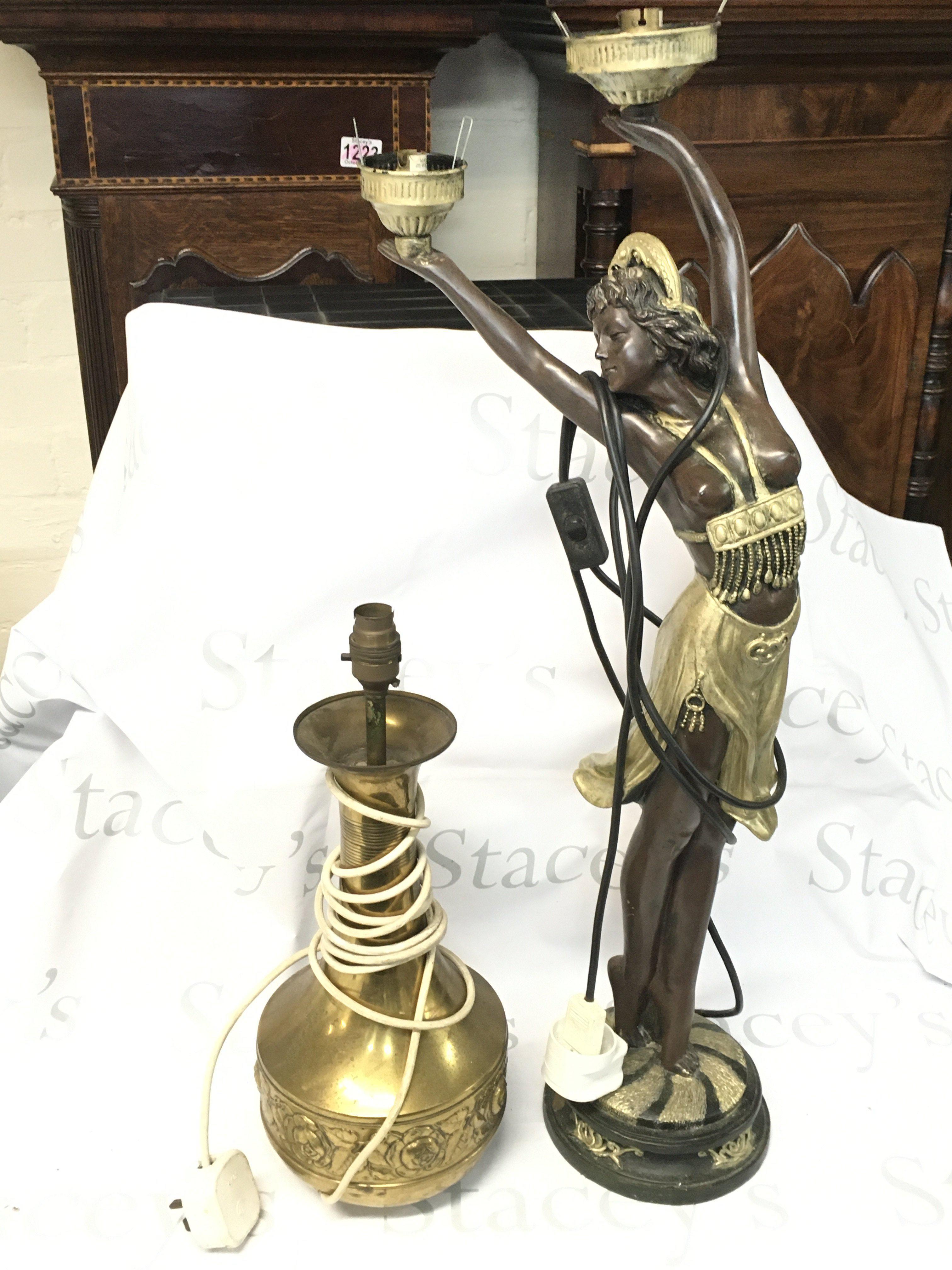 Two vintage lamps including an imitation bronze woman lamp (72cm tall) and a brass lamp made in Tiel, Holland