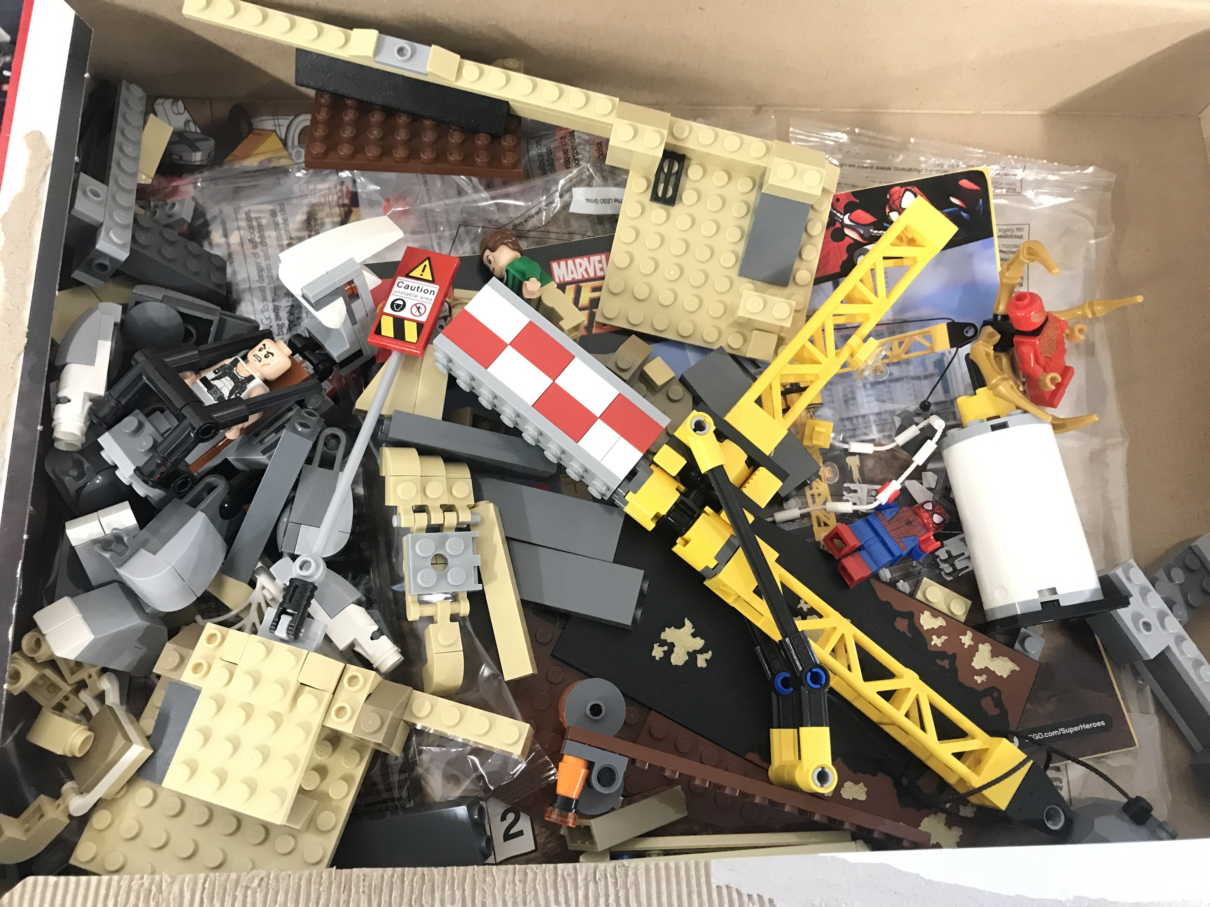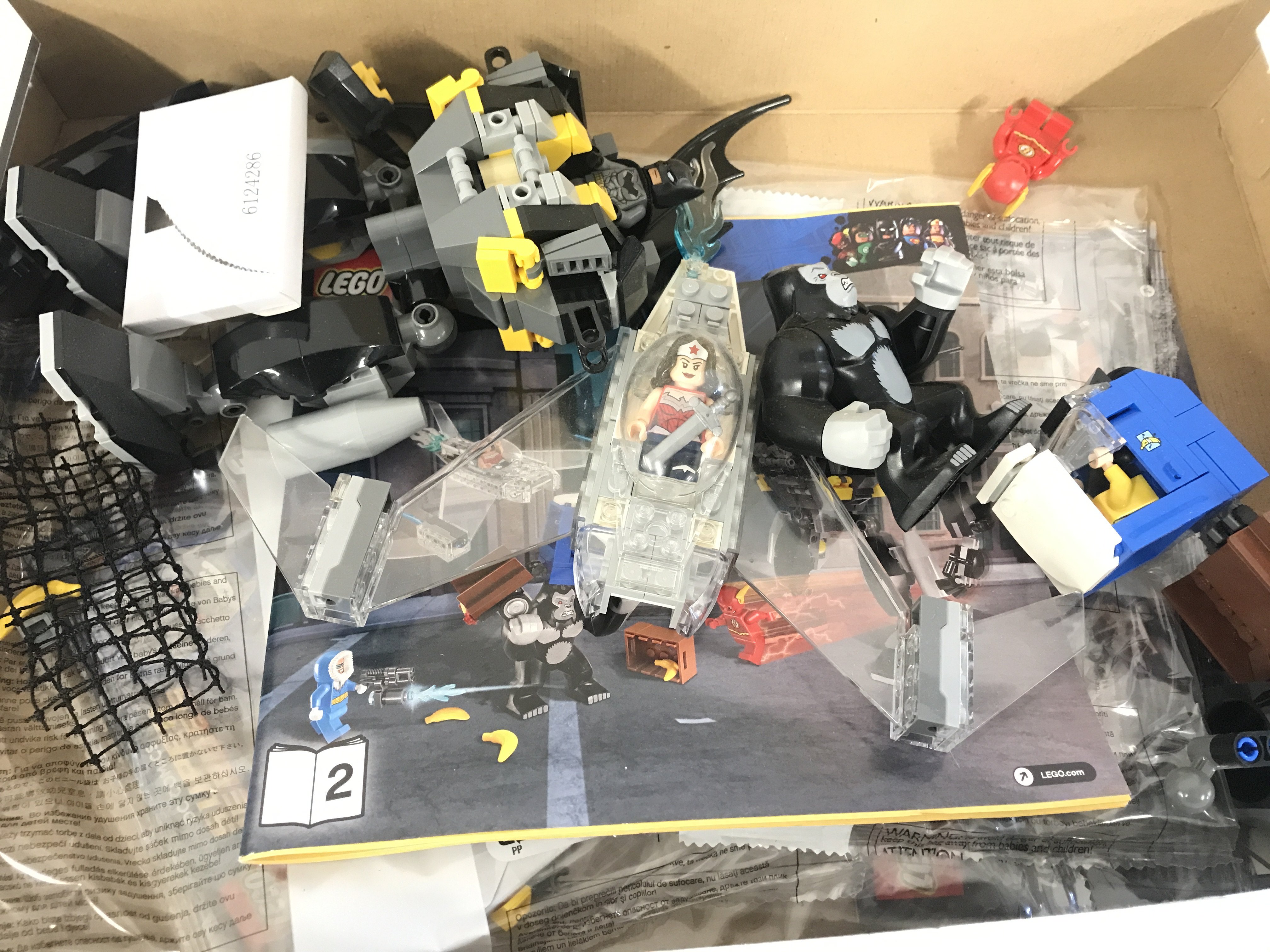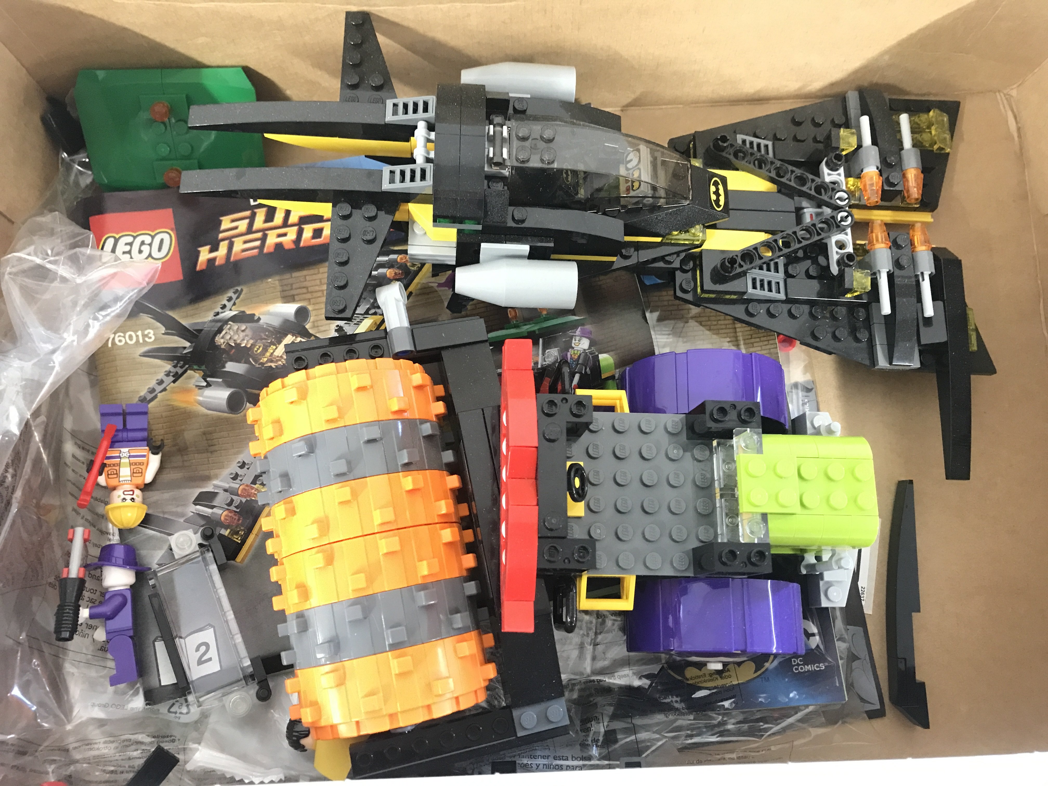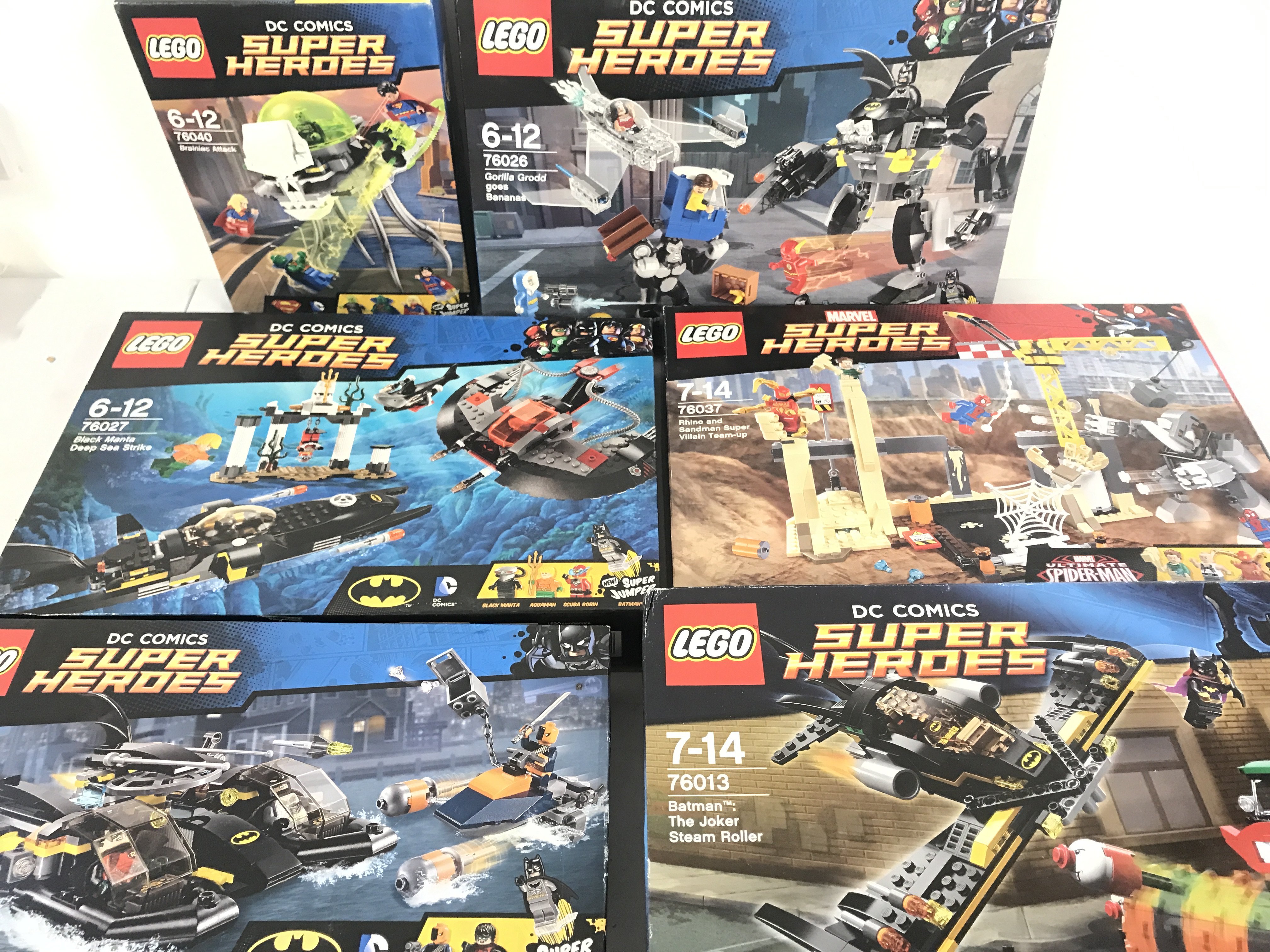 A Collection of 6 Boxed Lego Kits Including D.C. And Marvel. Kits Have Been Built.