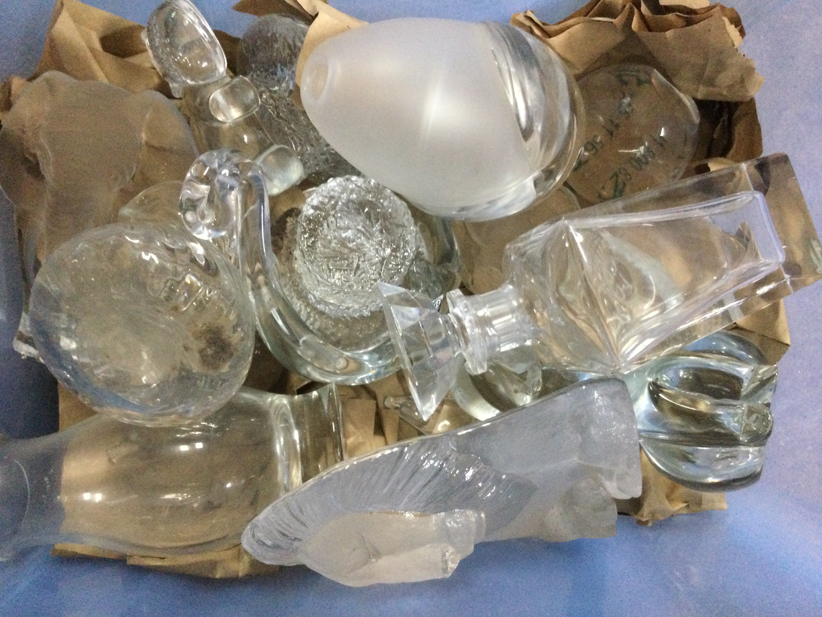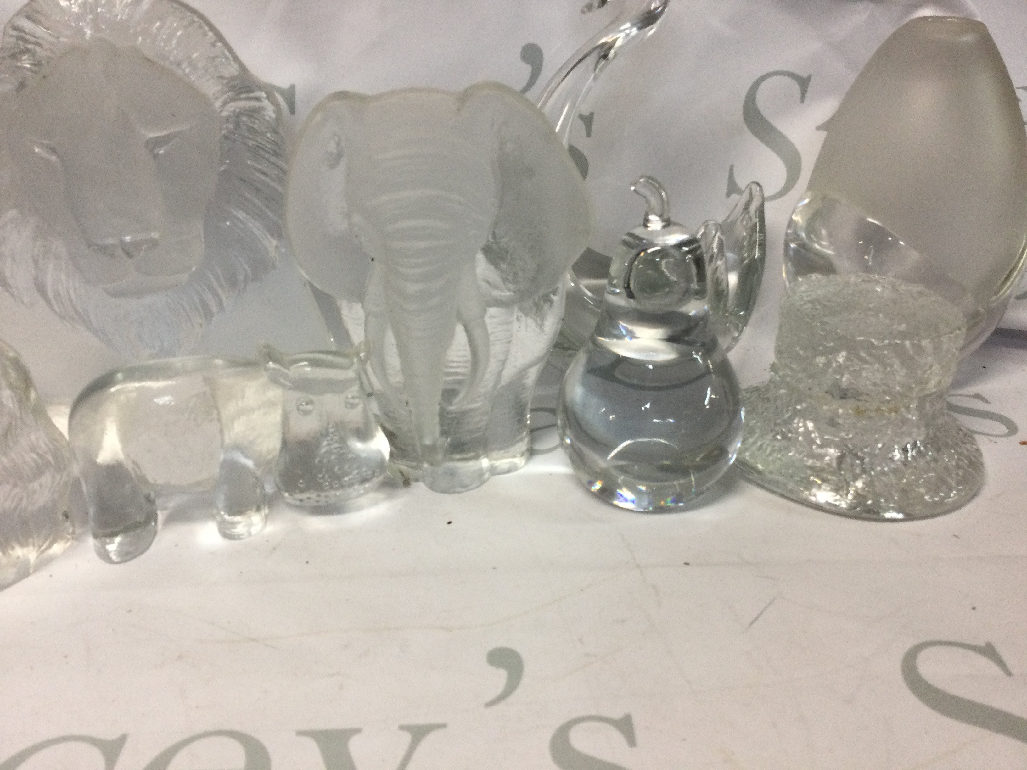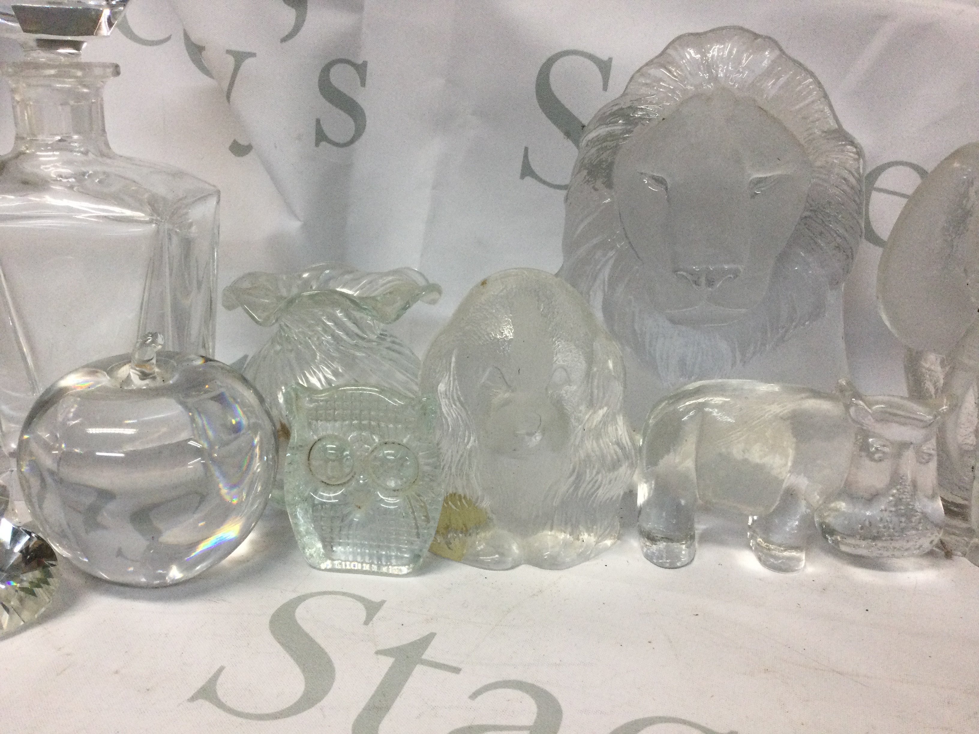 A collection of glass decanters, glass items and glasses, some handmade and in the shape of animals.