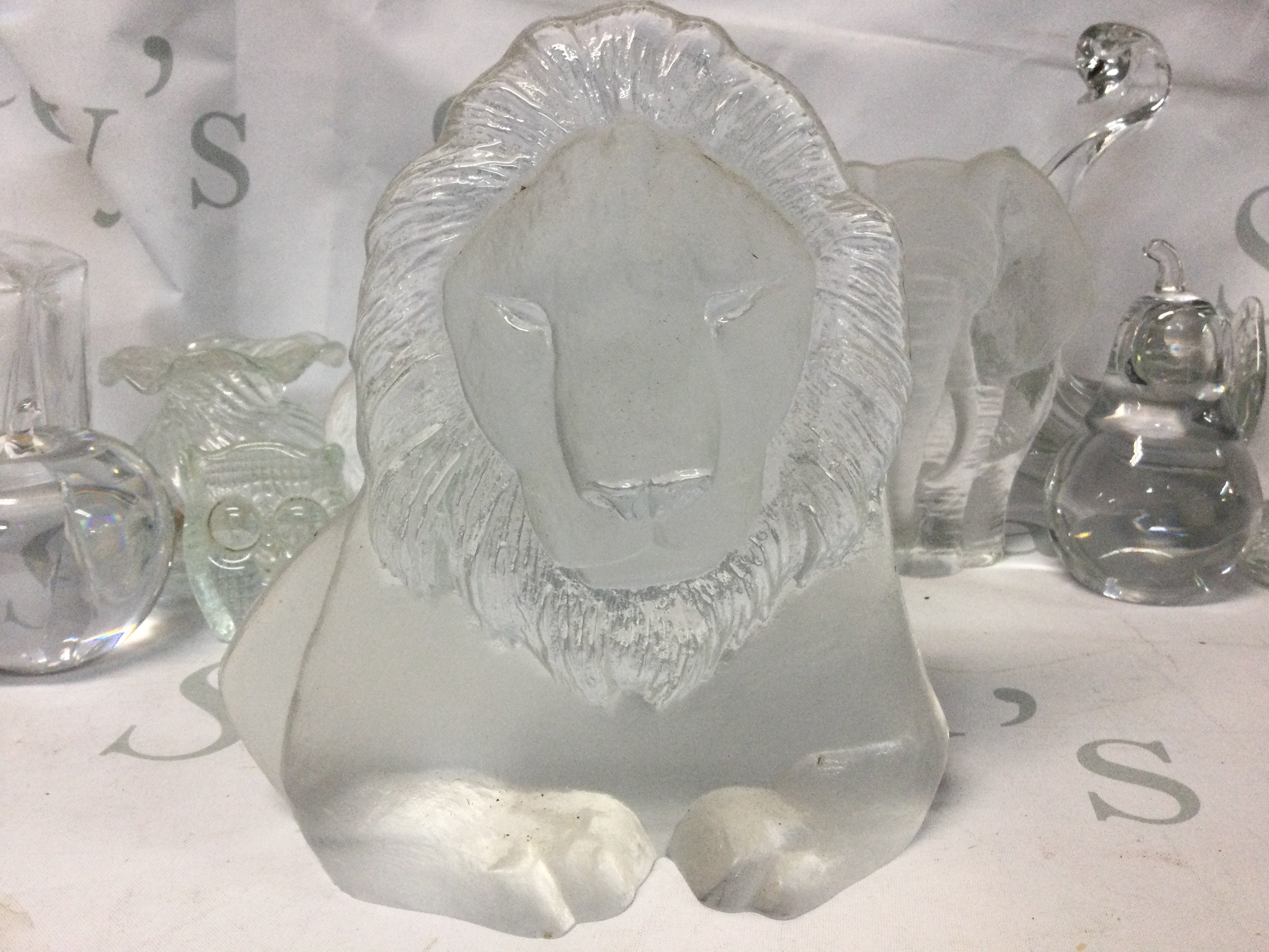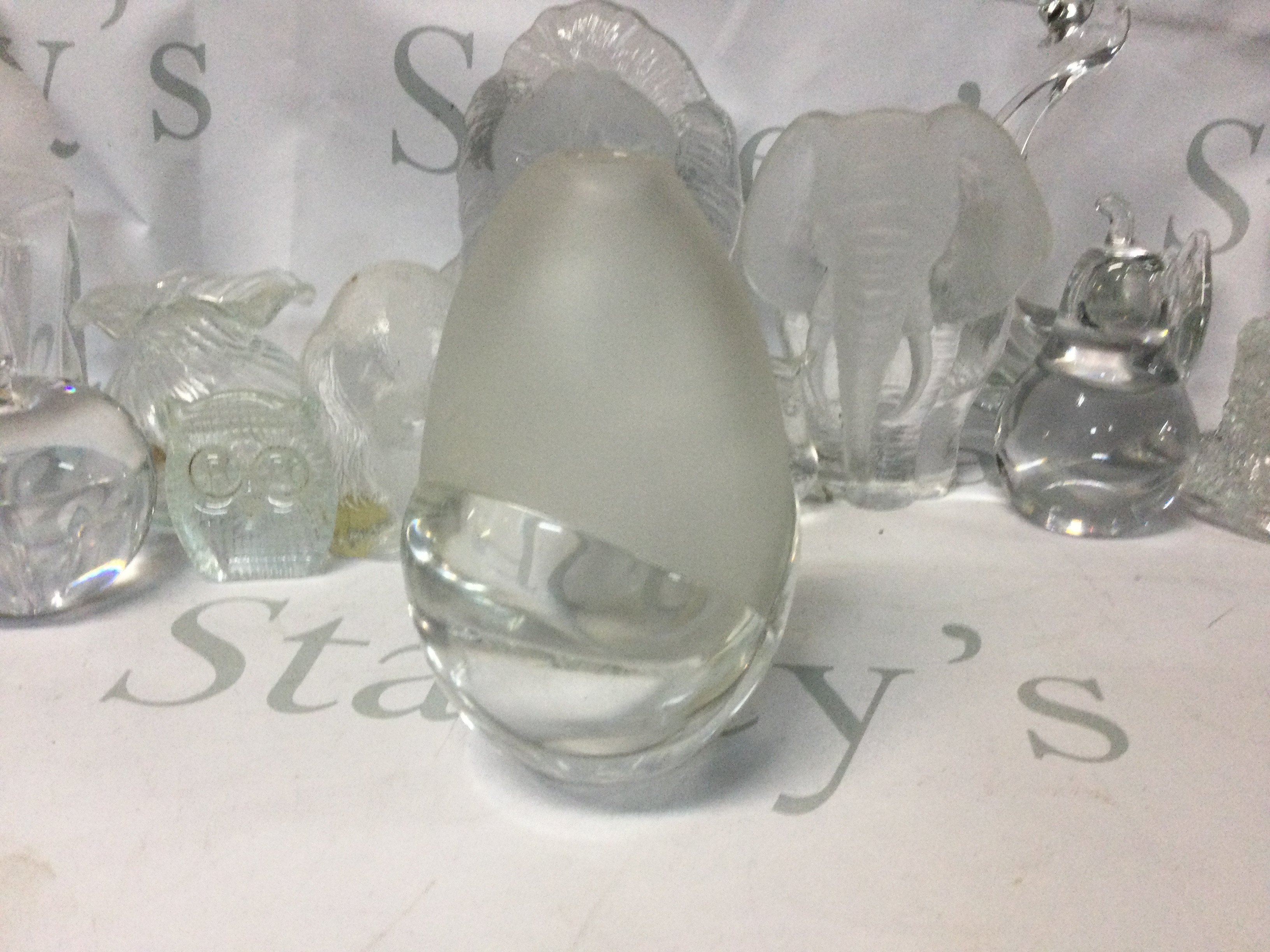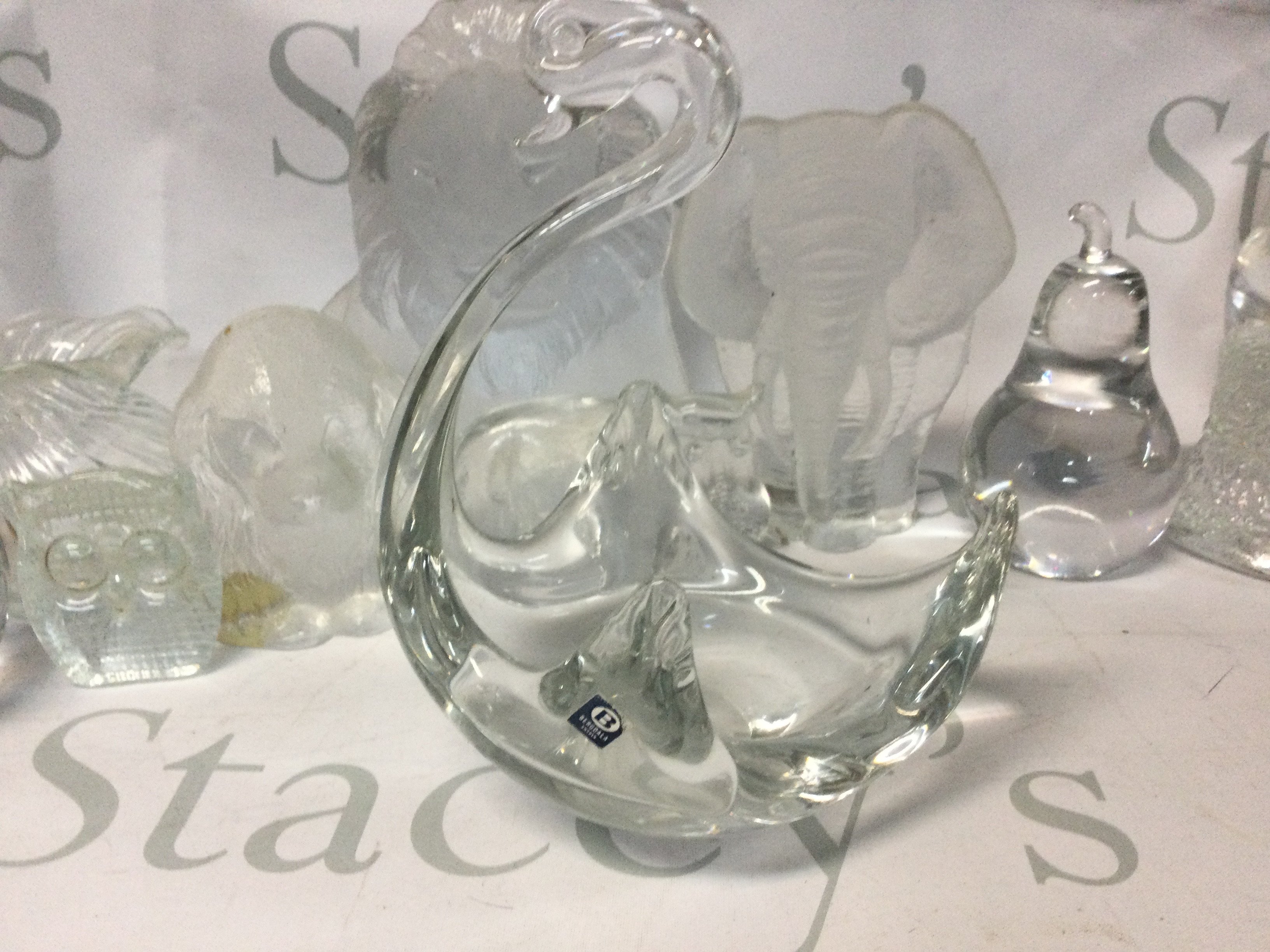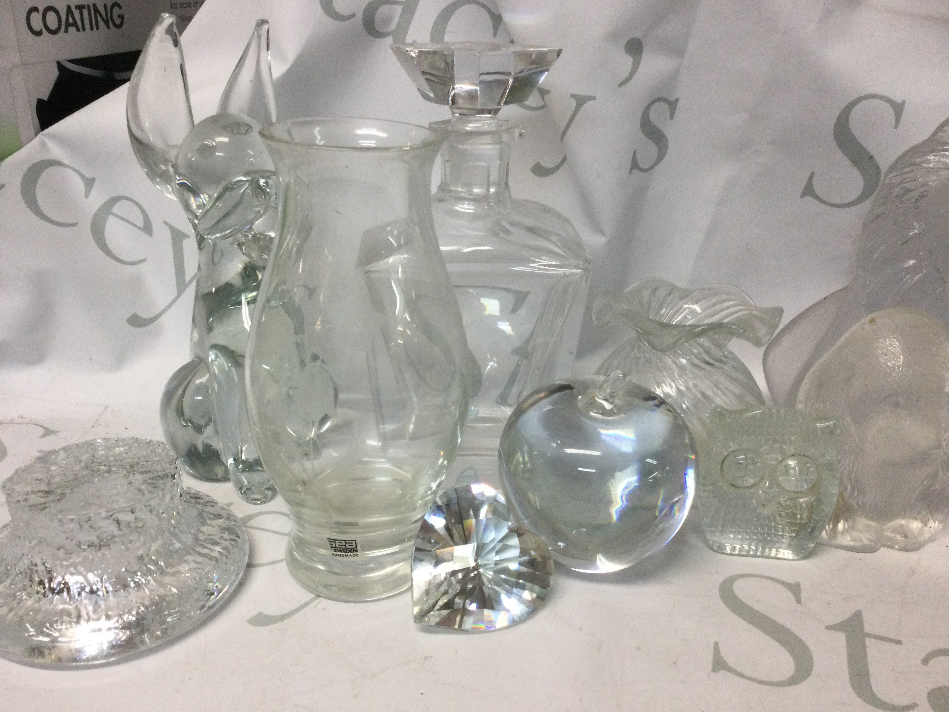 A collection of glass decanters, glass items and glasses, some handmade and in the shape of animals.