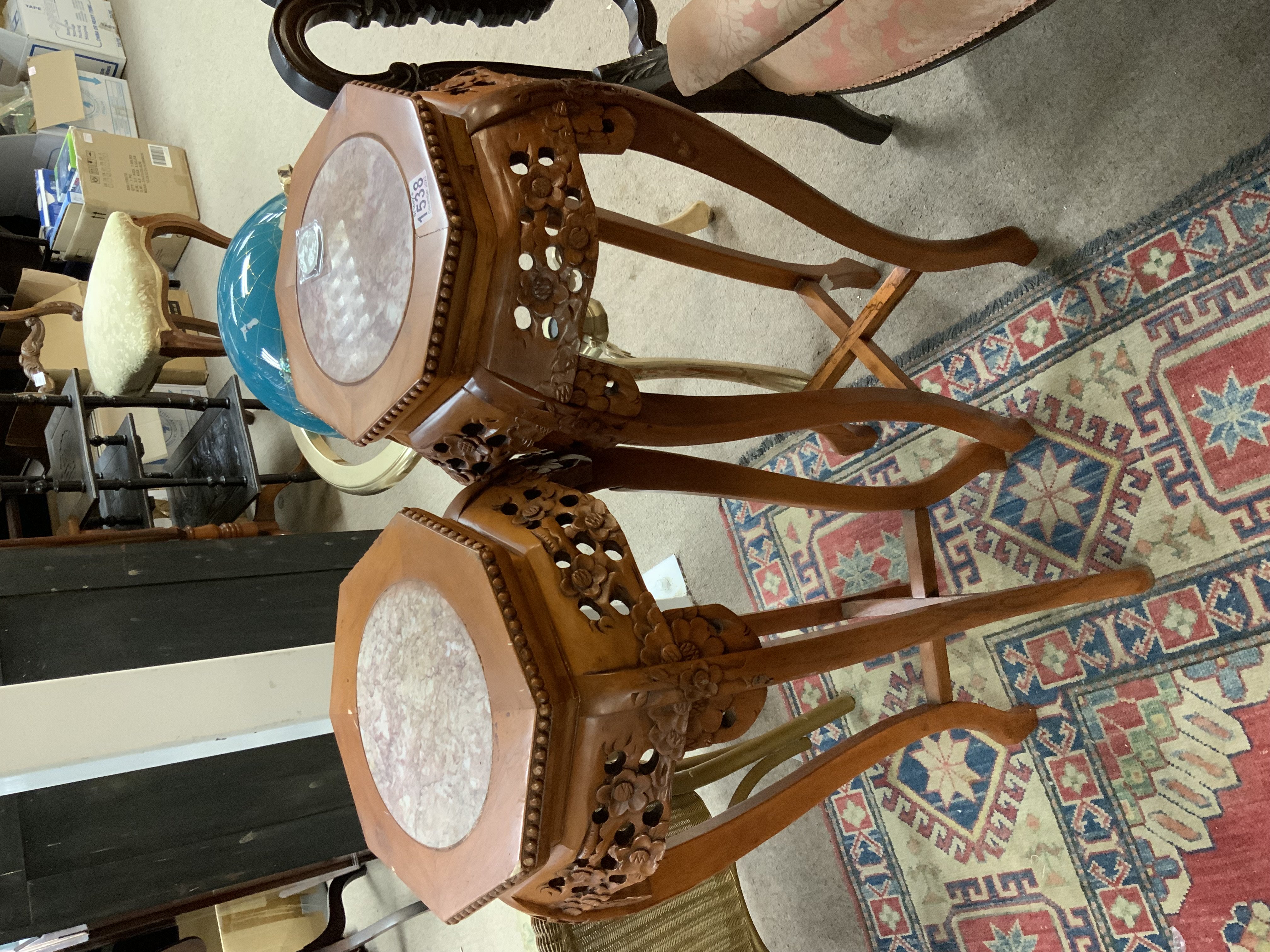 2 Chinese carved Elm and marble inlaid plant stand, 92cm.