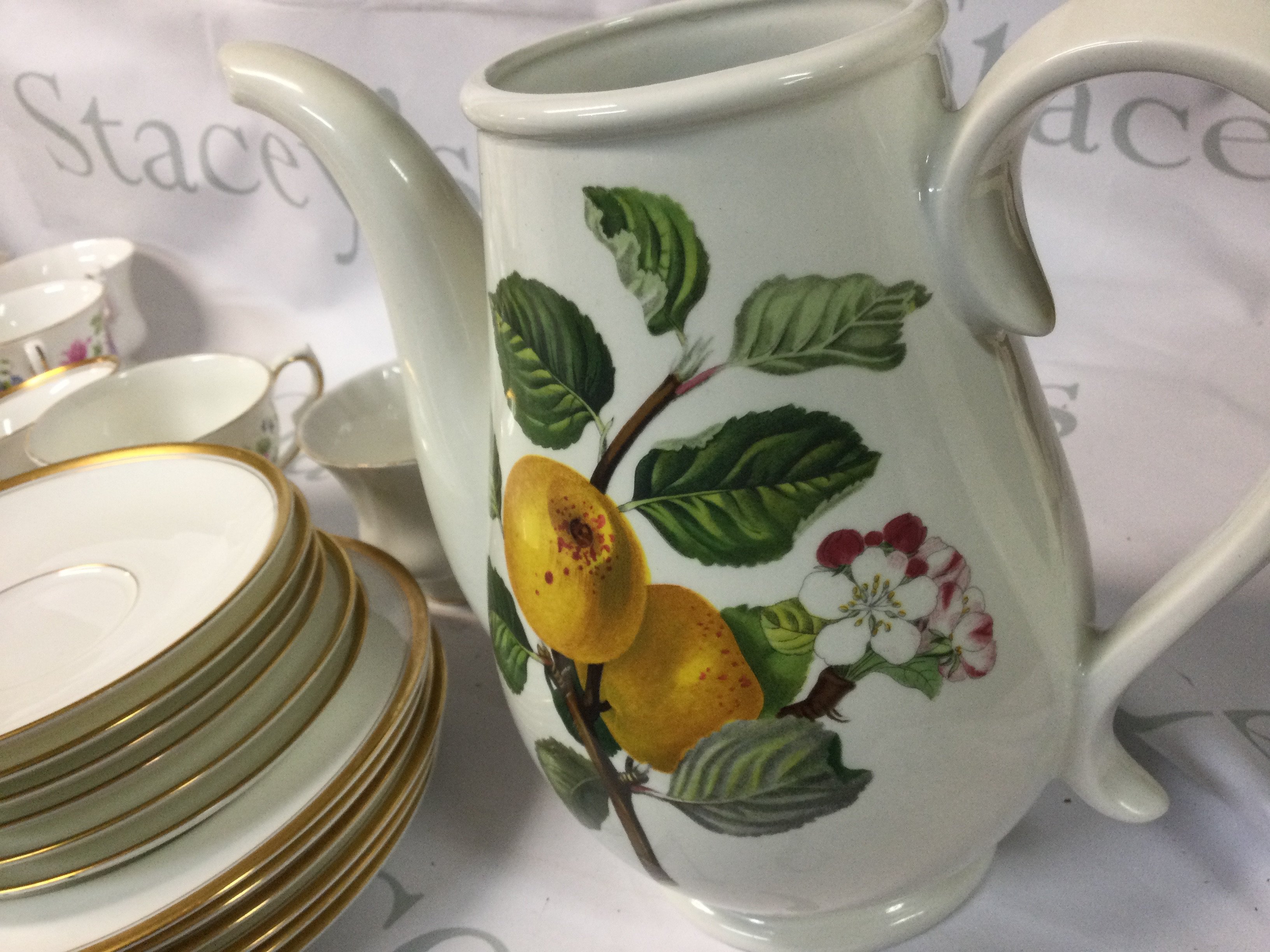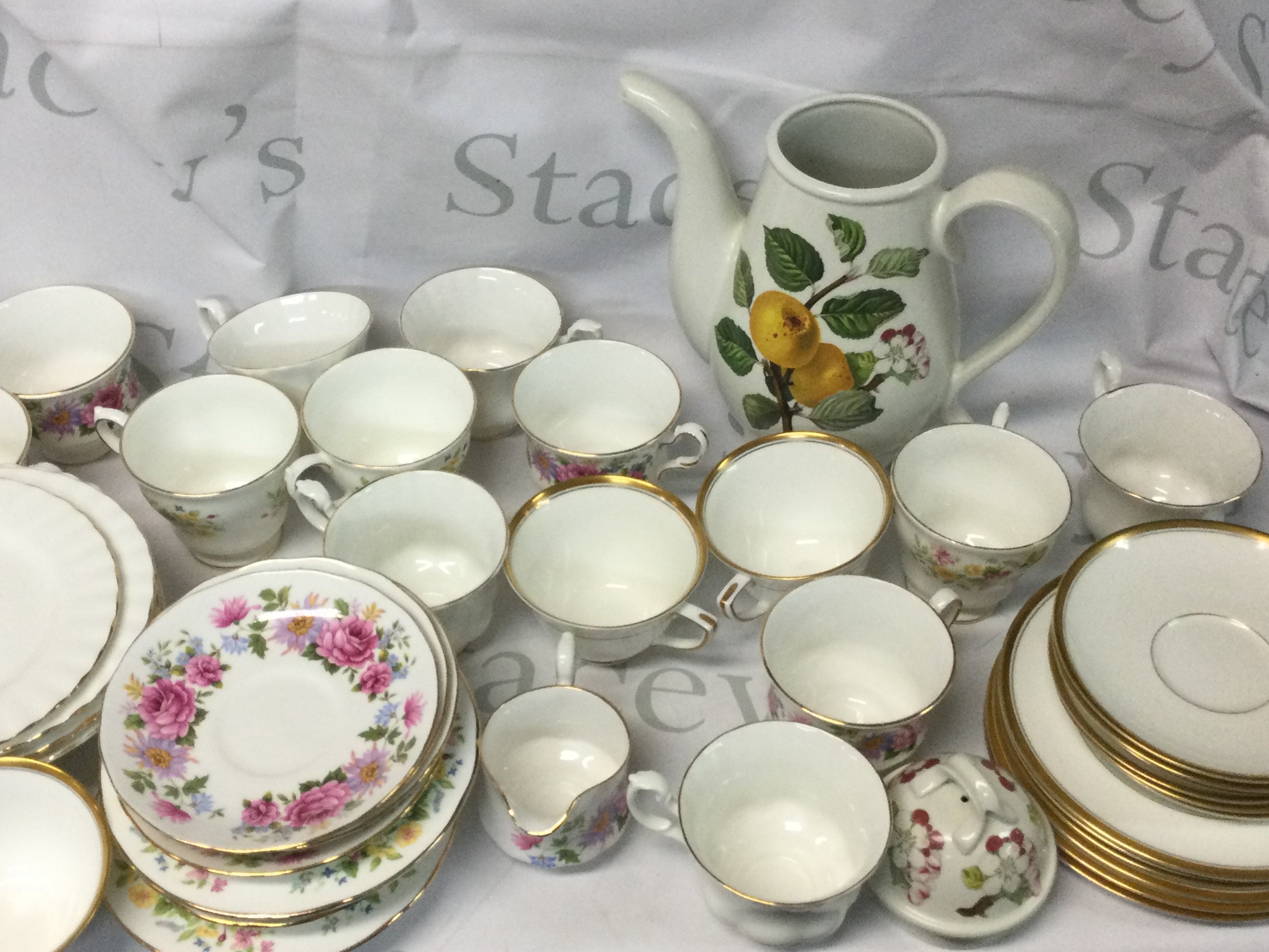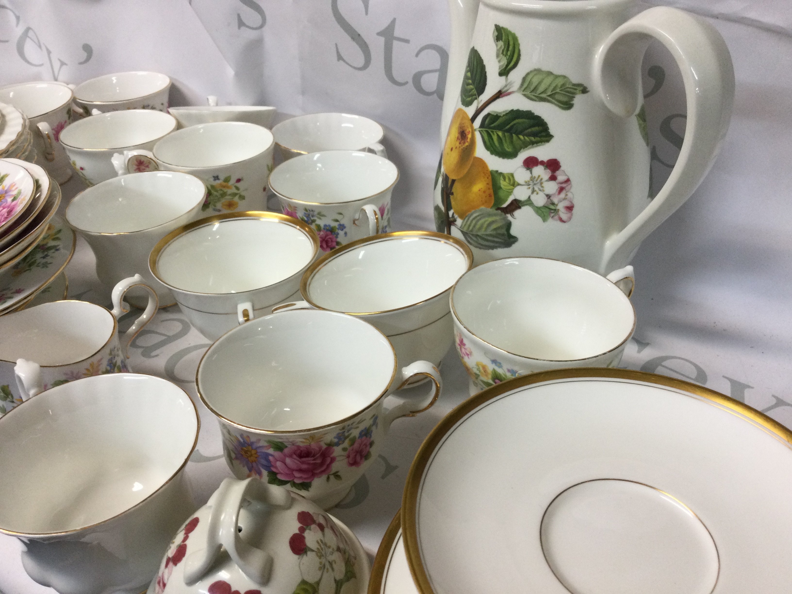 A collection of Royal Albert, Queen Anne, Colclough, Richmond and other branded plates, mugs and more. Also, there is a potmeirion Pomona coffee pot.