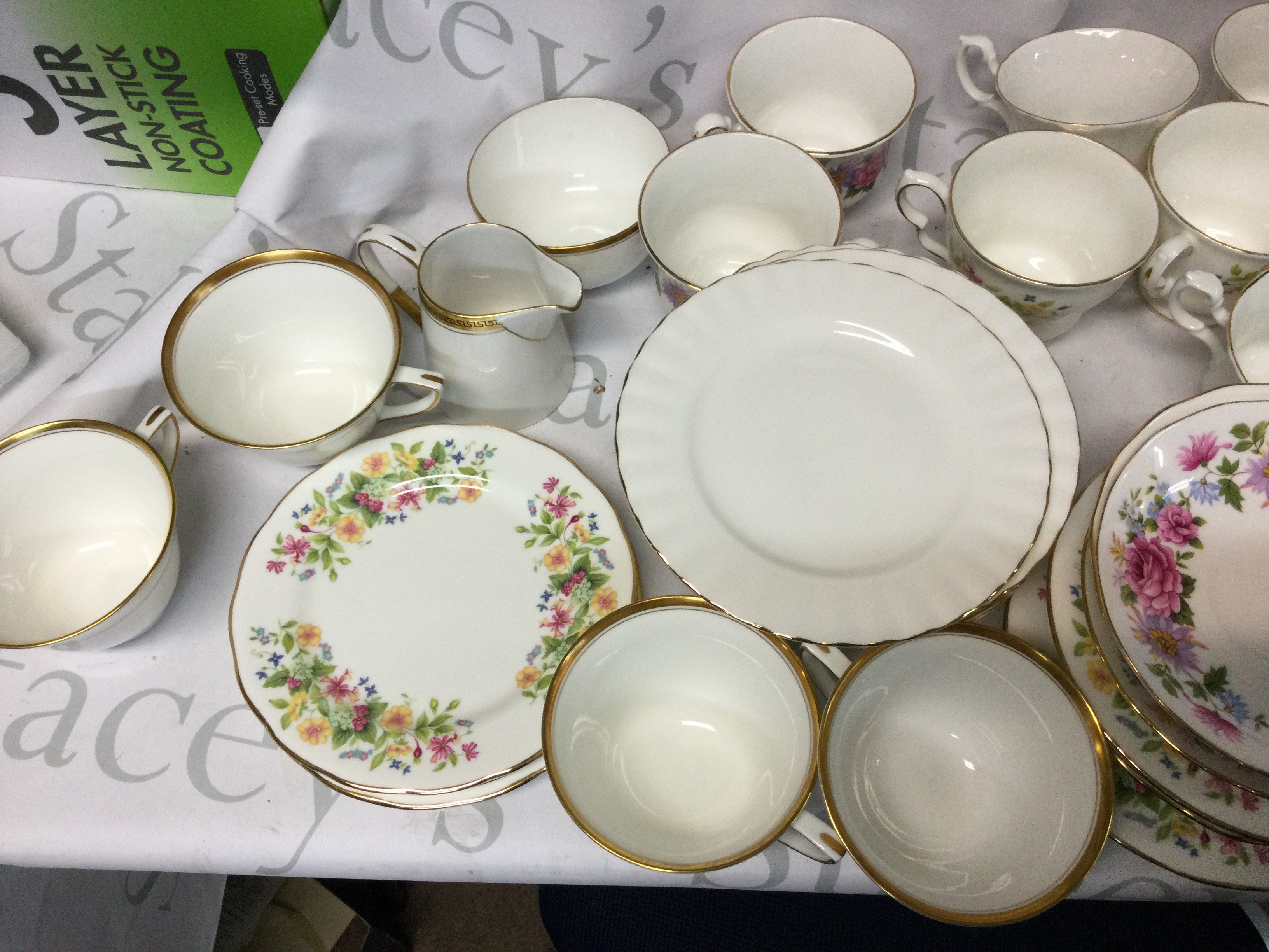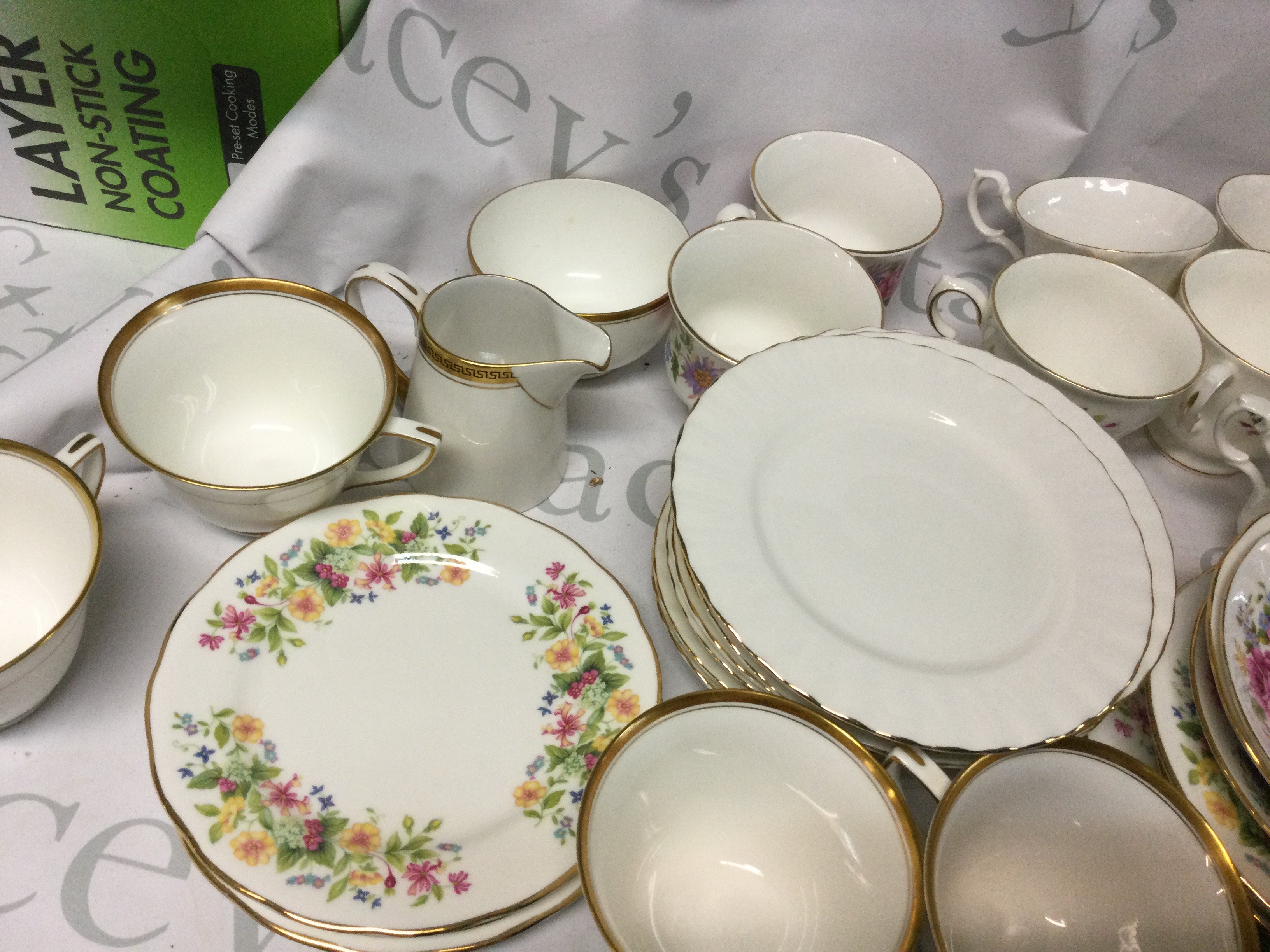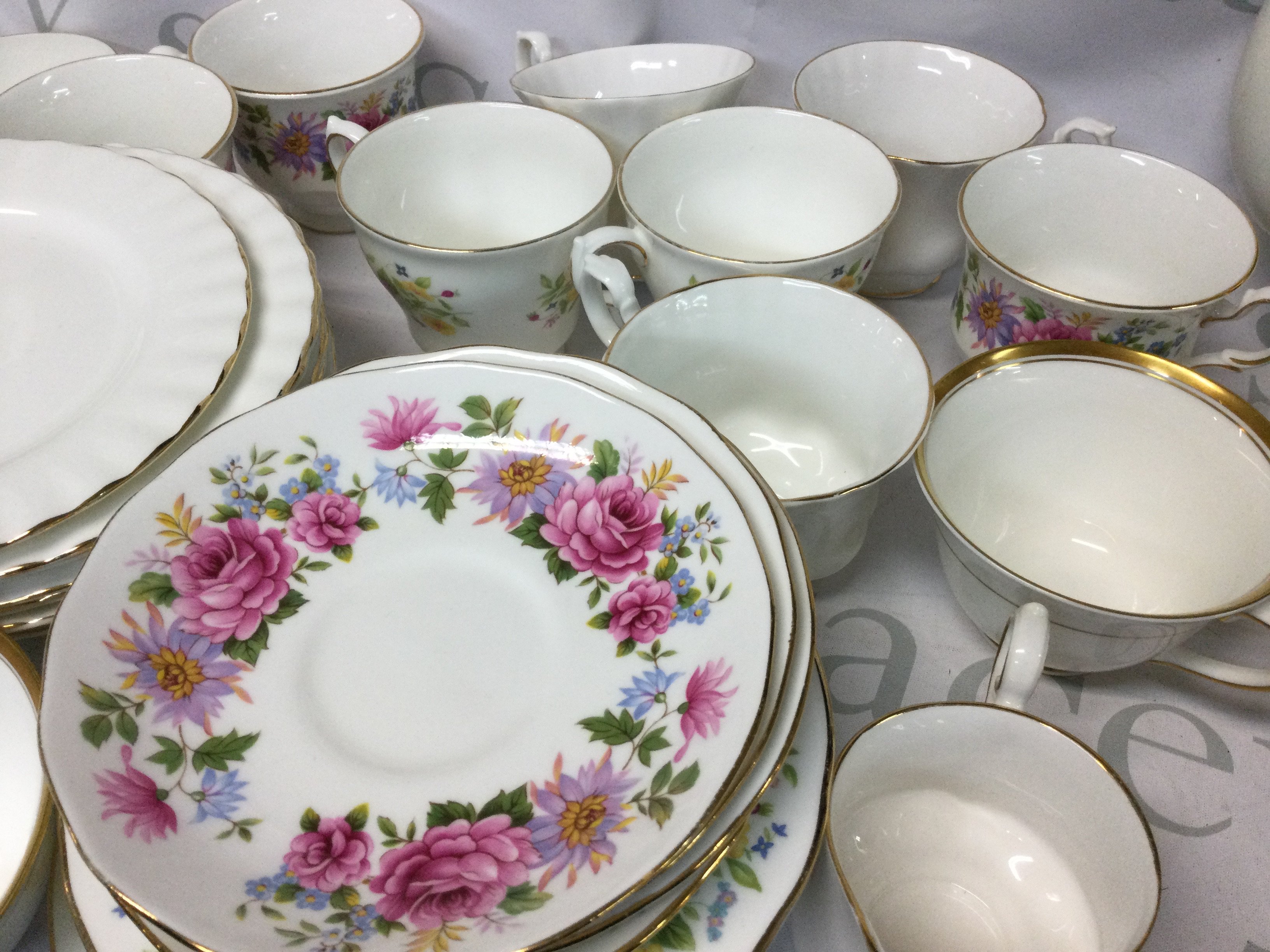 A collection of Royal Albert, Queen Anne, Colclough, Richmond and other branded plates, mugs and more. Also, there is a potmeirion Pomona coffee pot.