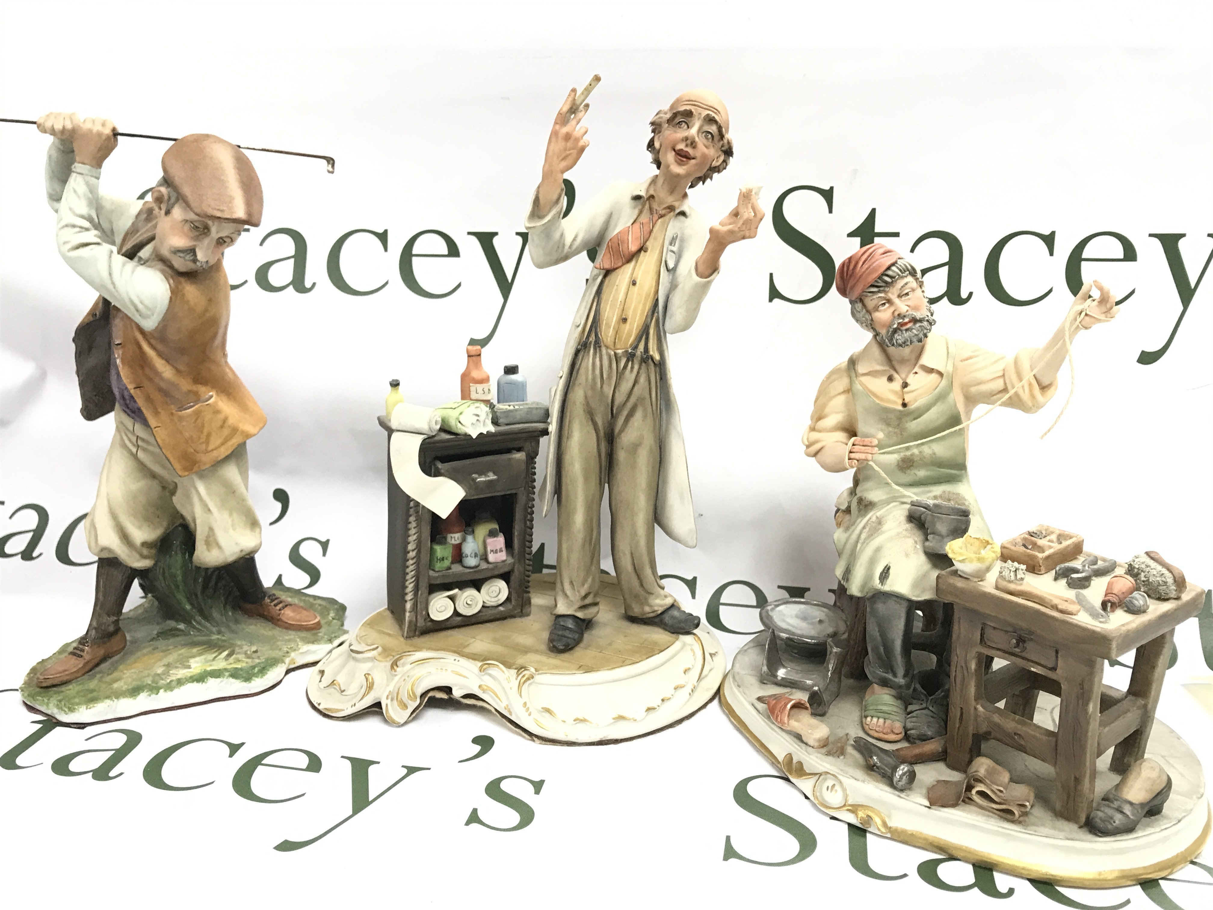 Three Capodimonte figures including The Cobbler, The Golfer etc. 23 to 29cm tall approximately. This lot cannot be posted. NO RESERVE