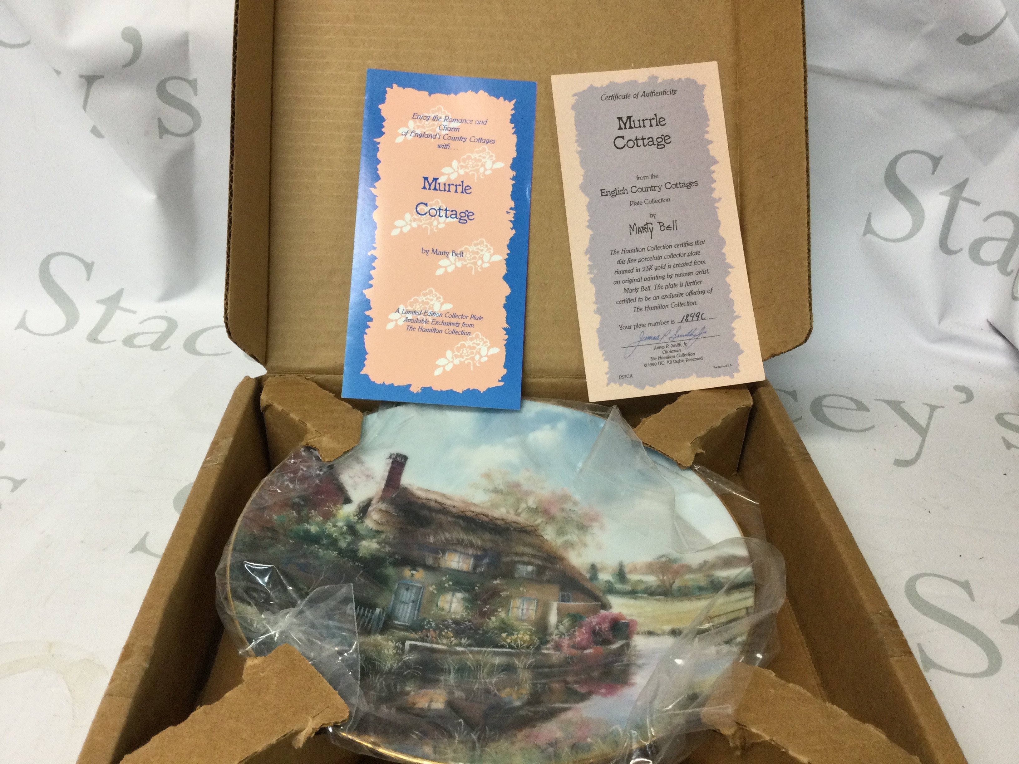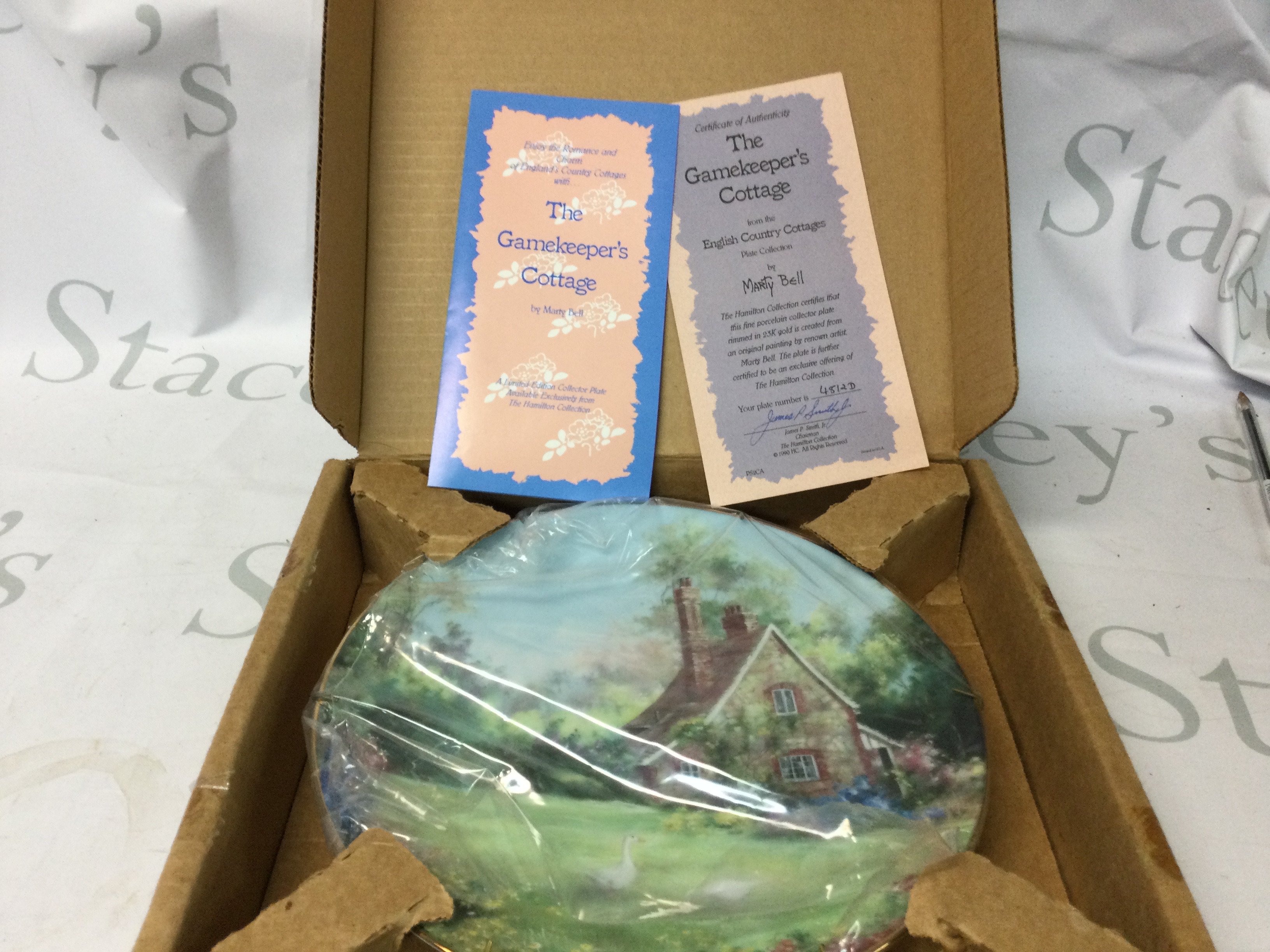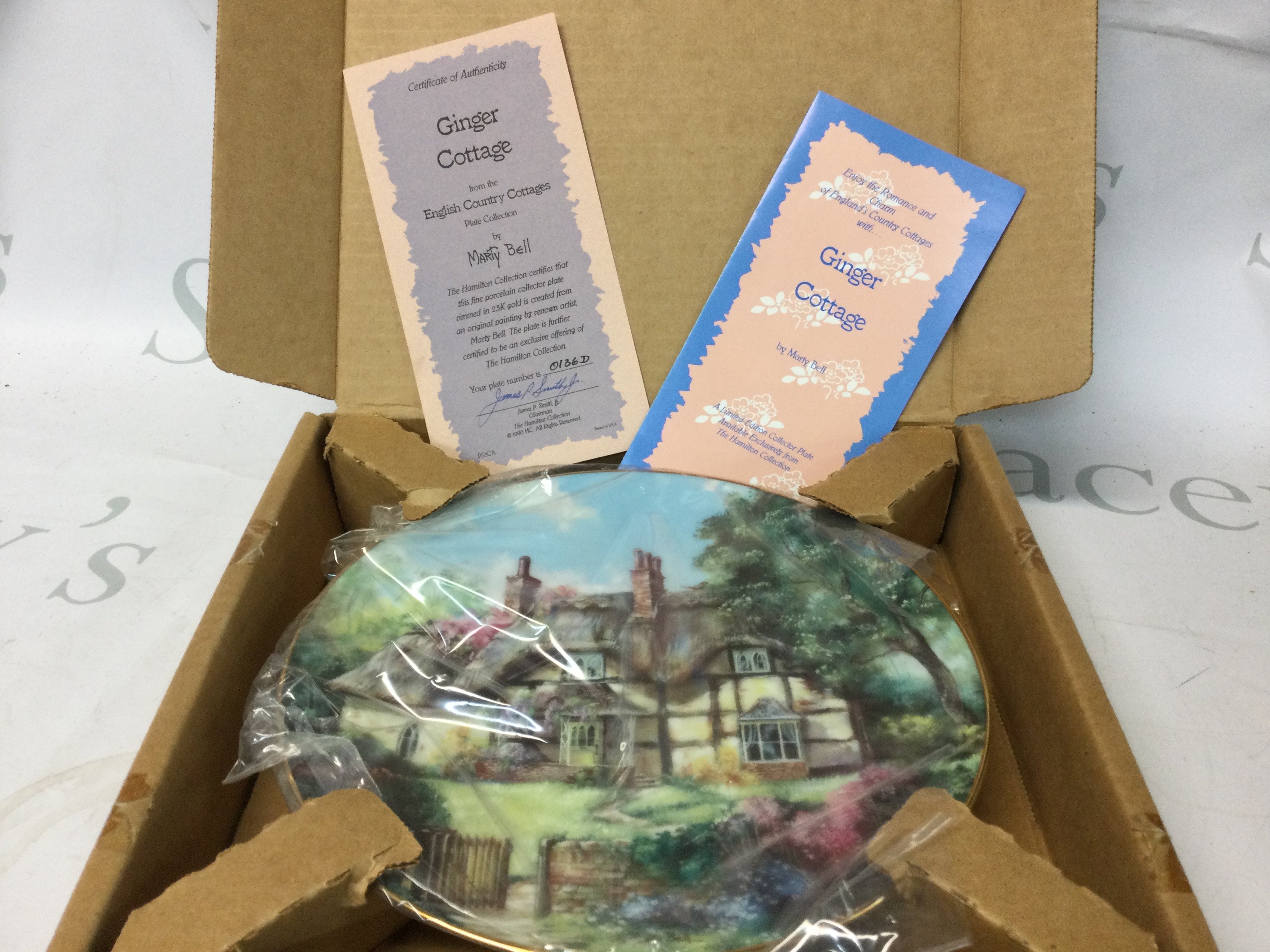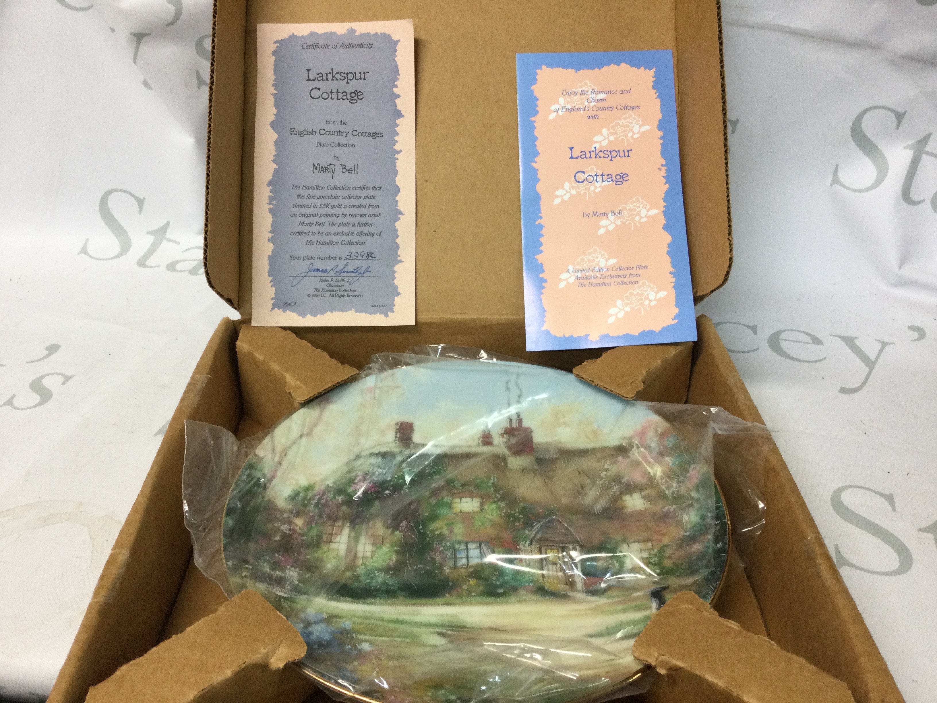 A collection of antique porcelain collector plates, including Ginger Cottage, Lorna Doone Cottage, The Chaplains Garden, Murrle Cottage, The Gamekeepers Cottage, Larkspur Cottage and The Periwinkle Tea Rooms