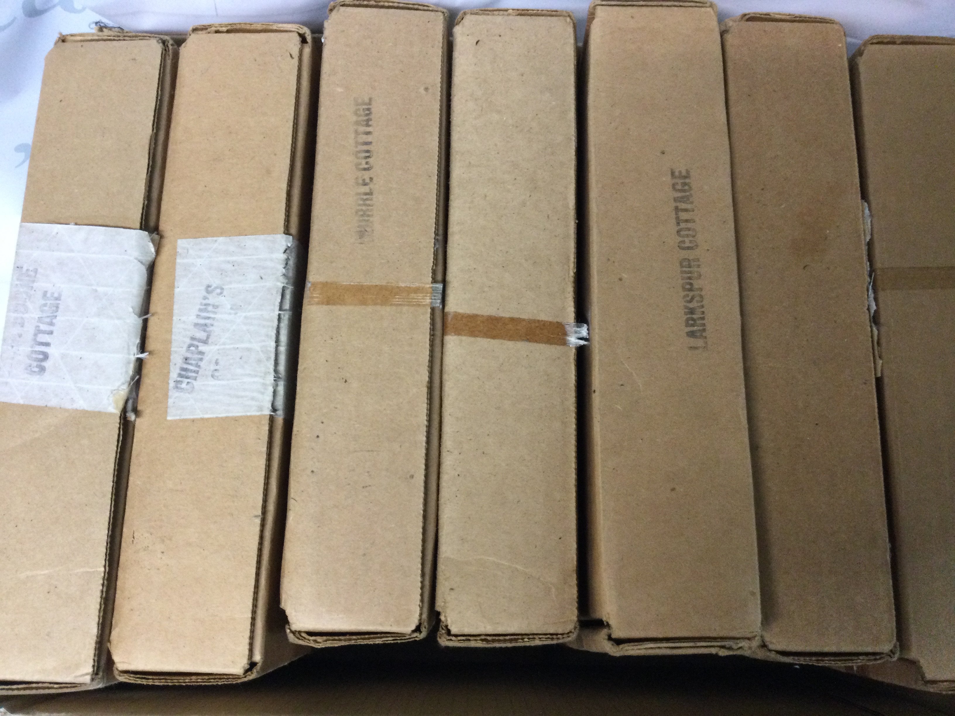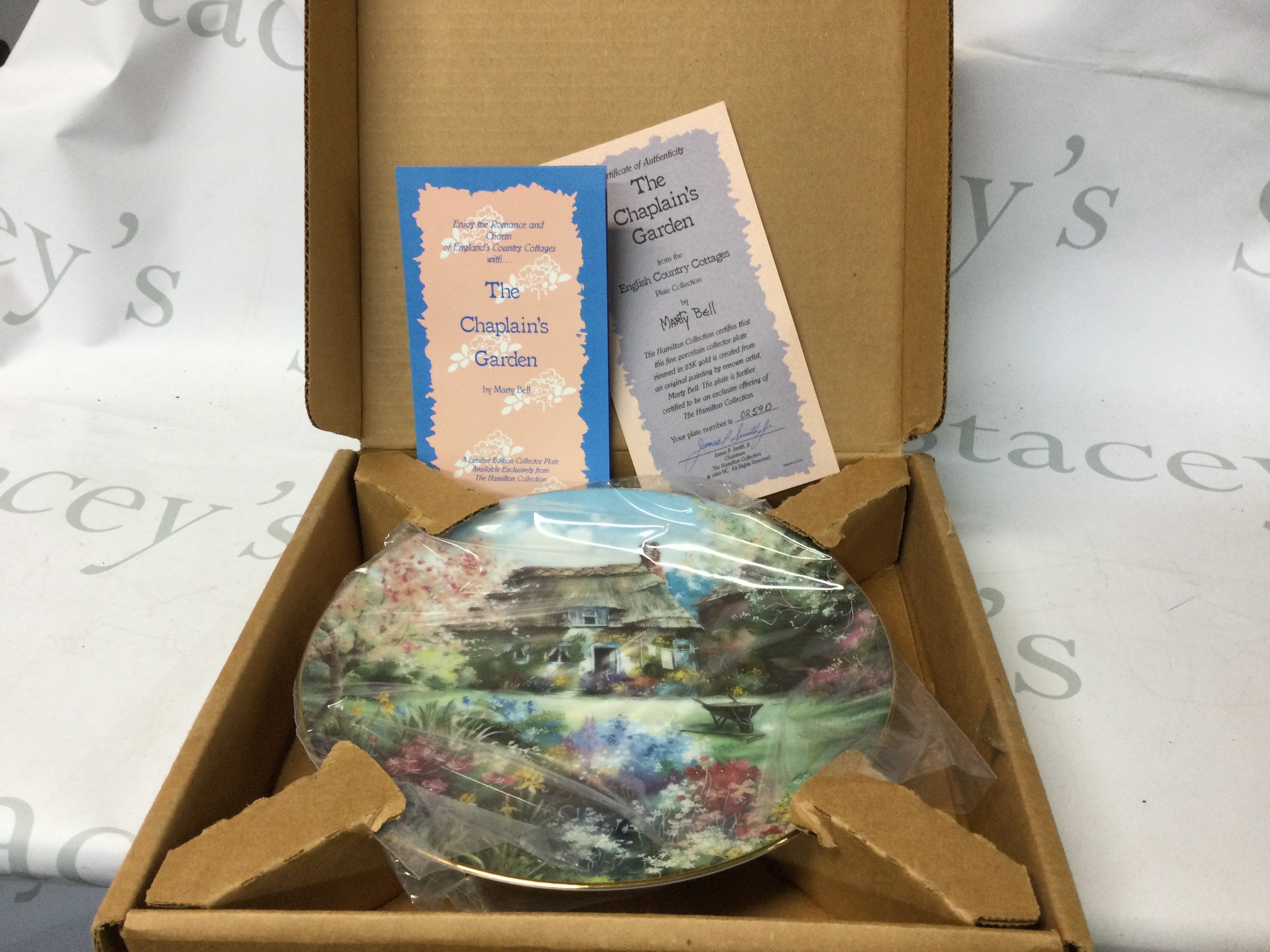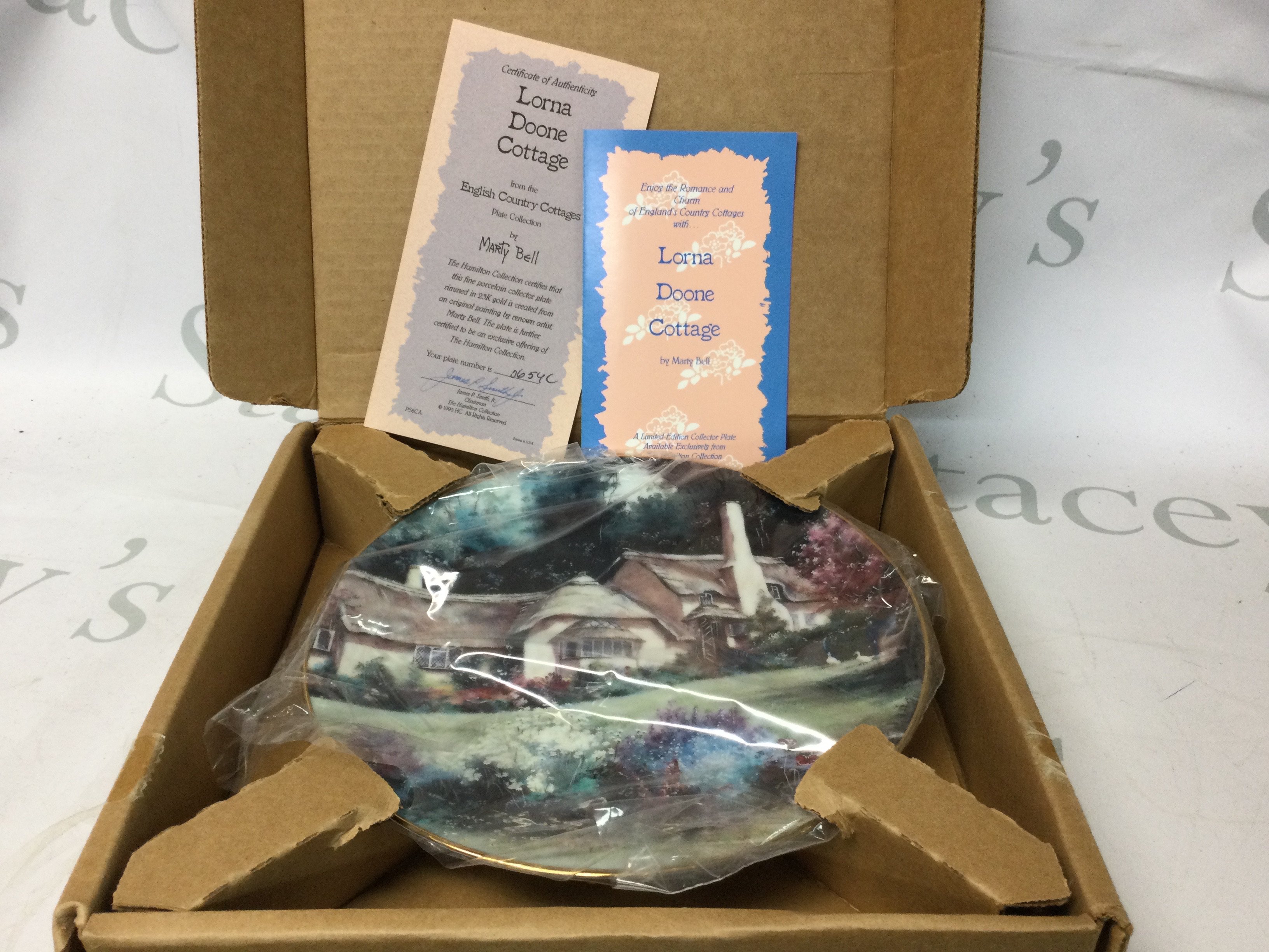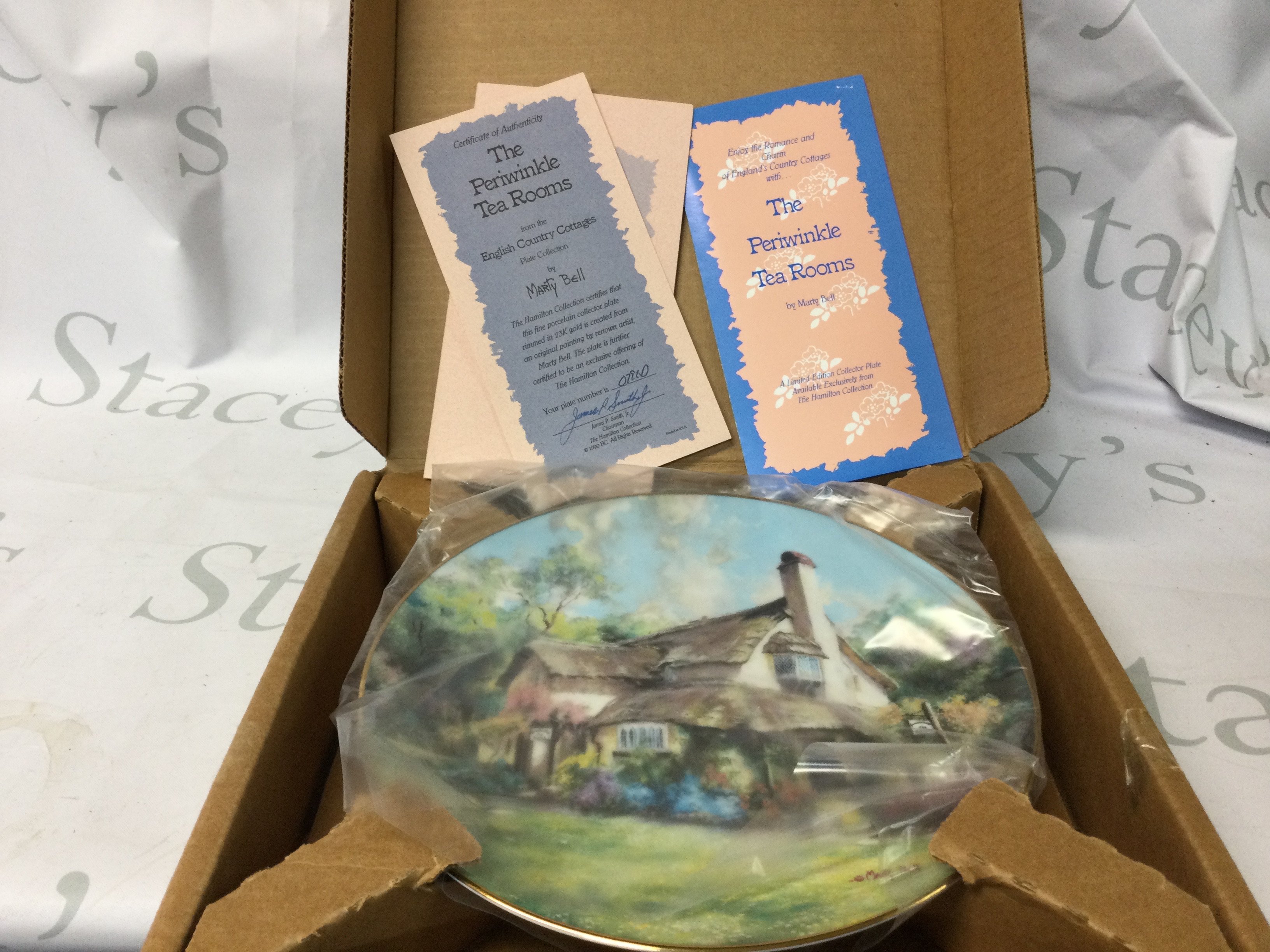 A collection of antique porcelain collector plates, including Ginger Cottage, Lorna Doone Cottage, The Chaplains Garden, Murrle Cottage, The Gamekeepers Cottage, Larkspur Cottage and The Periwinkle Tea Rooms