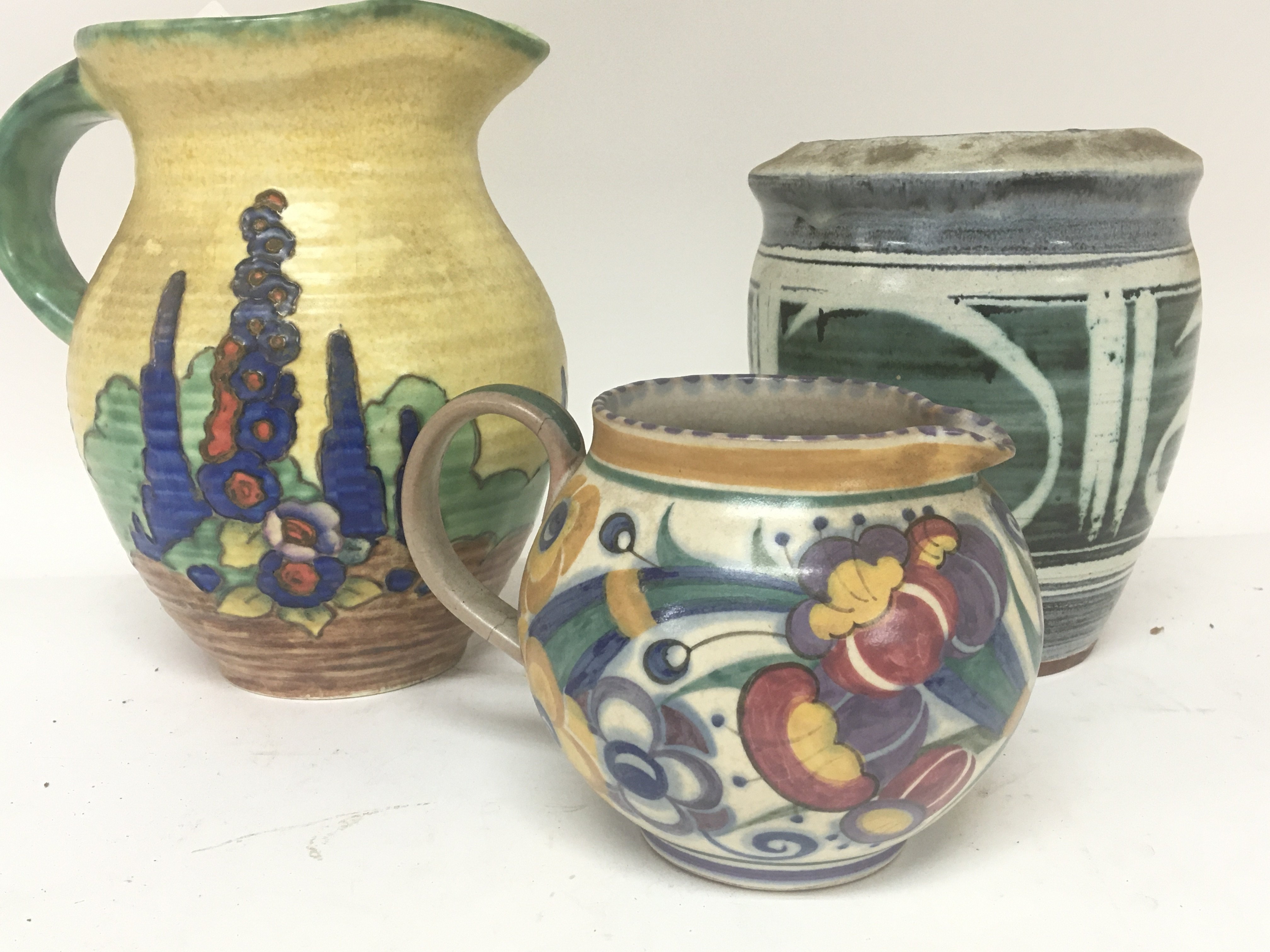 A hand painted Crown Devon jug a Poole pottery jug and a contemporary ceramic vase with marks to the base. (3). NO RESERVE