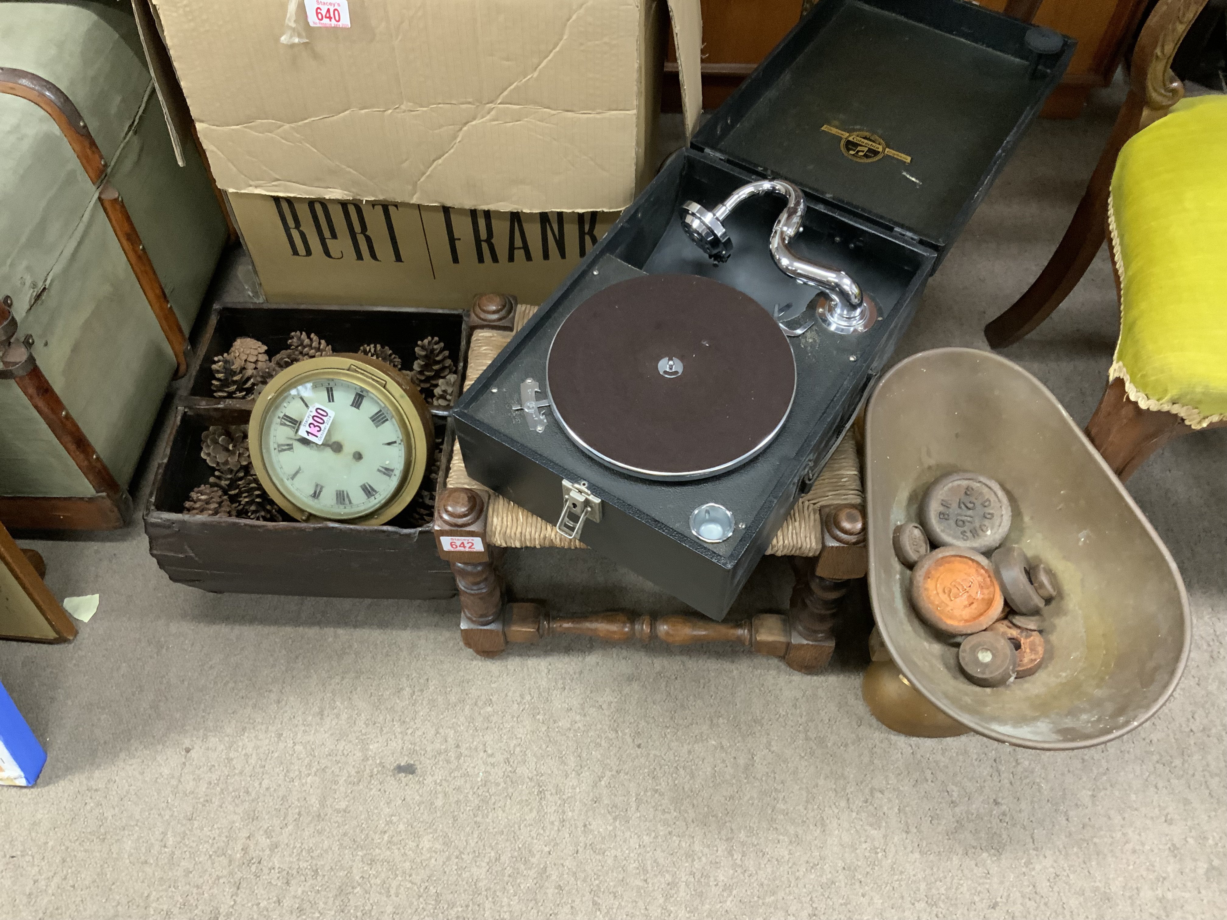a small collection to include, Columbia portable gramophone, Avery scales, oak stool, Chinese basket, brass wall clock.