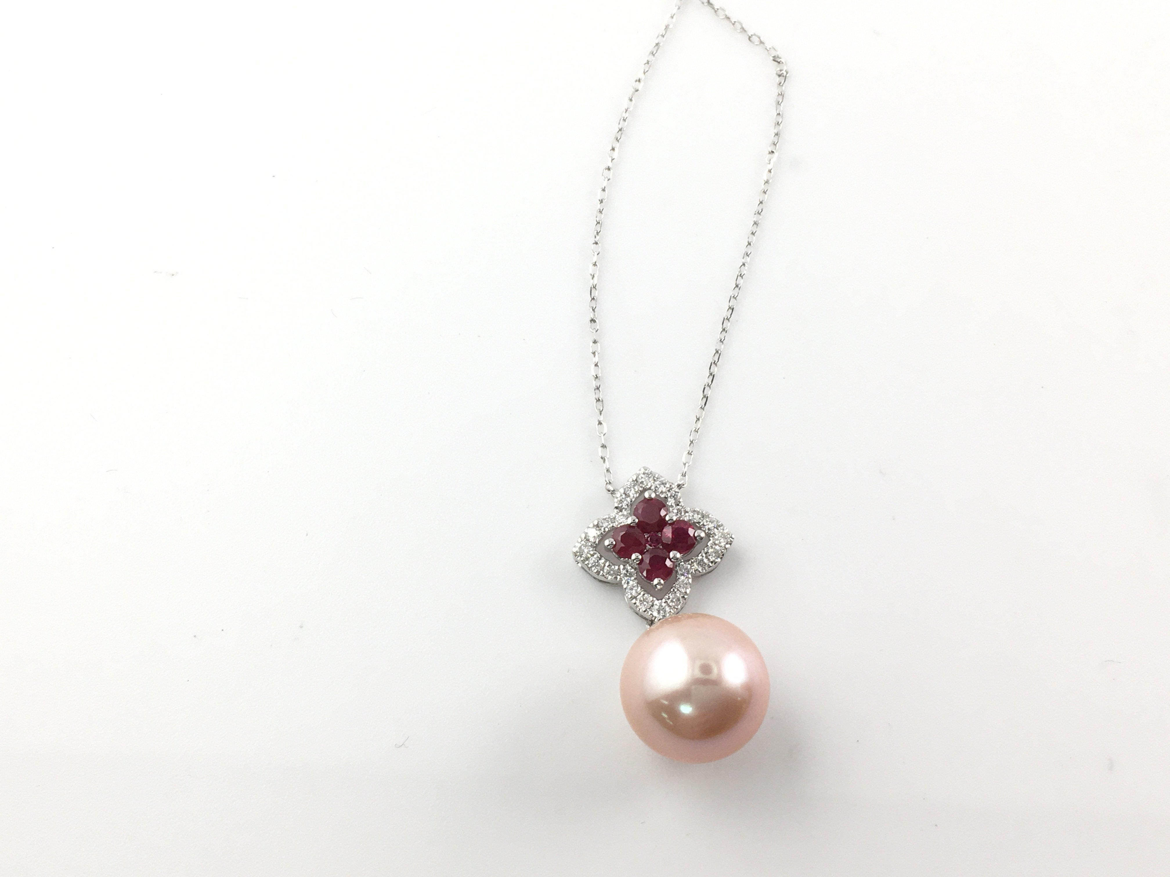 18ct white gold pendant set with a suspended peach pink cultured pearl with ruby and diamond set quatrefoil bale on an 18ct white gold chain. Rubies 0.35ct and diamonds 0.15ct. Postage B