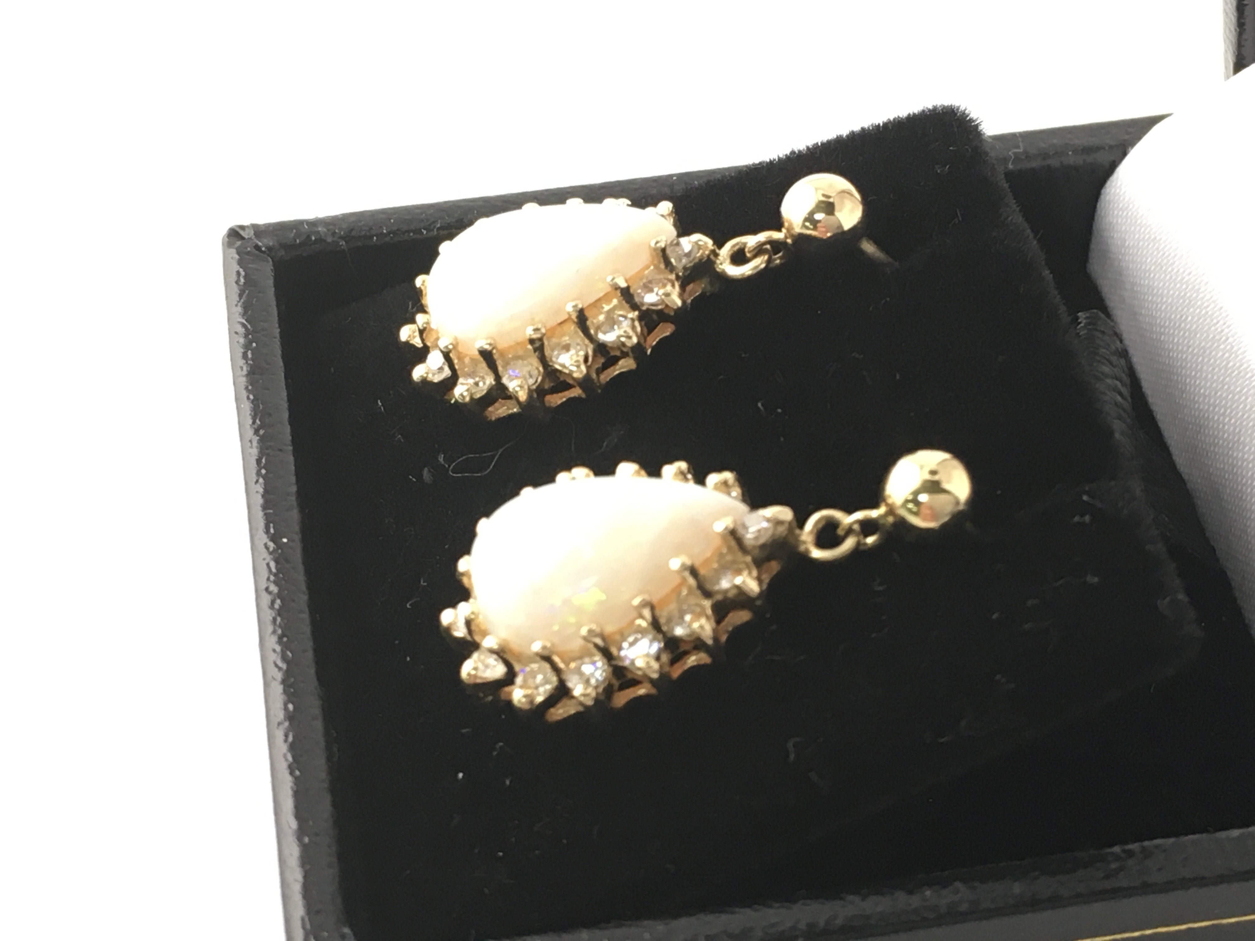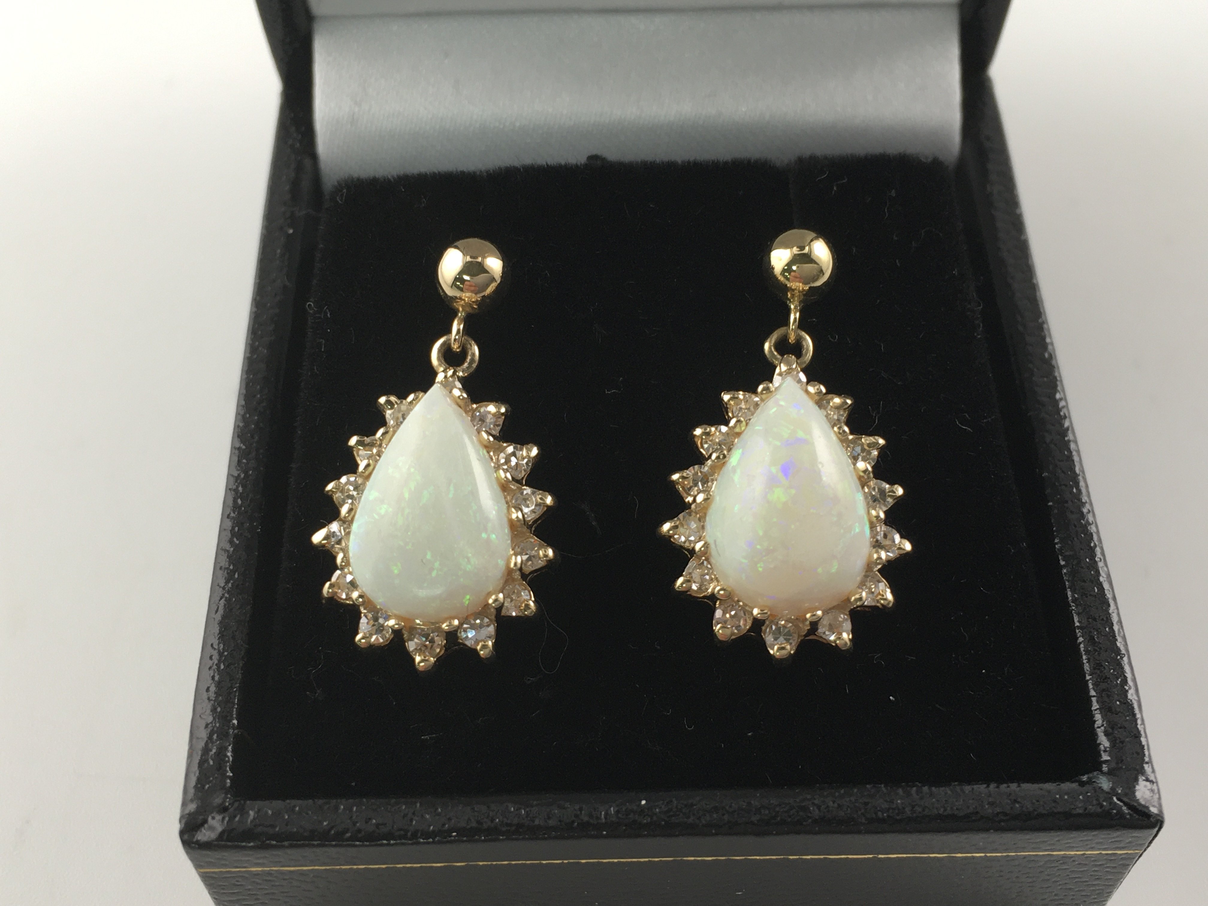 A pair of 14ct yellow gold drop earrings set with pear shaped cabochon opals surround by approx 0.30 diamonds. Opals are approximately 3ct. Postage B