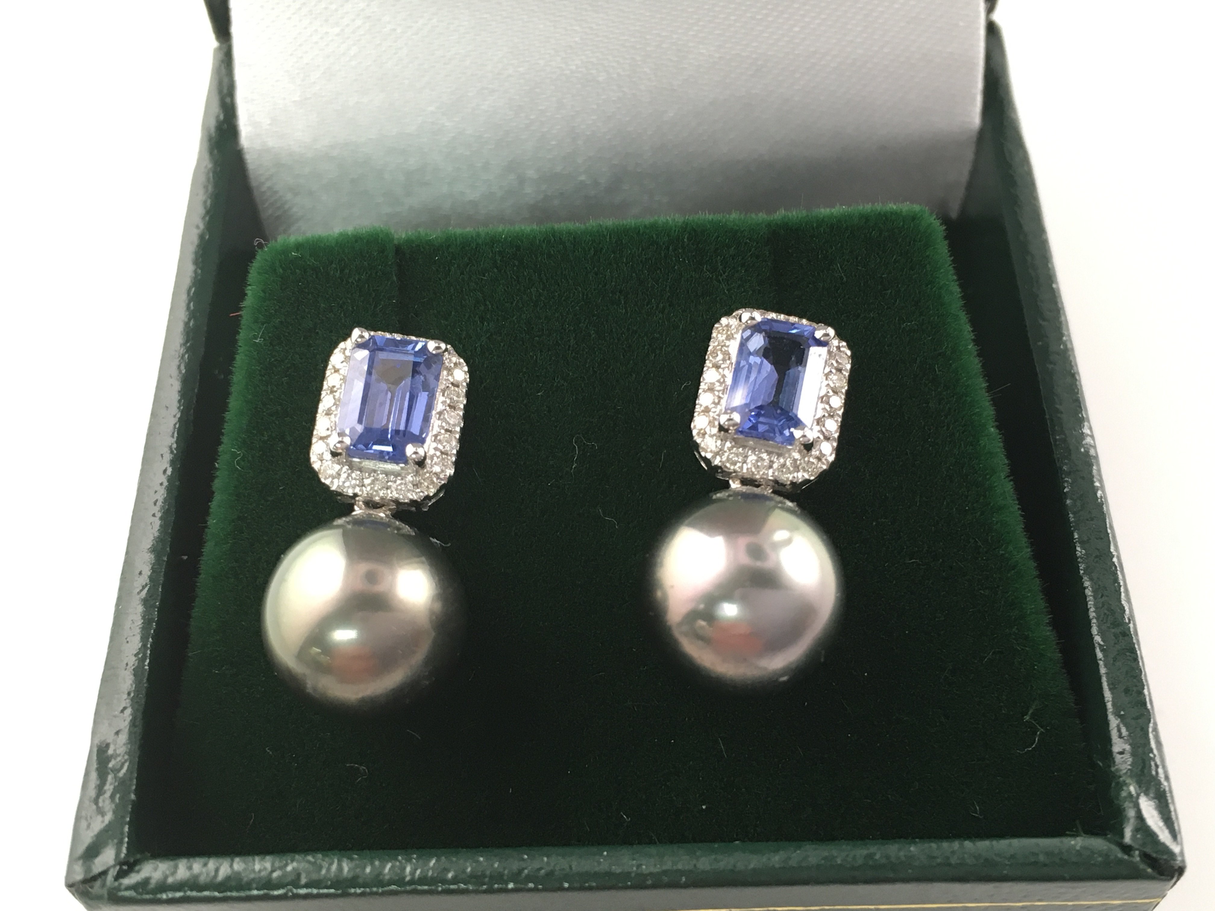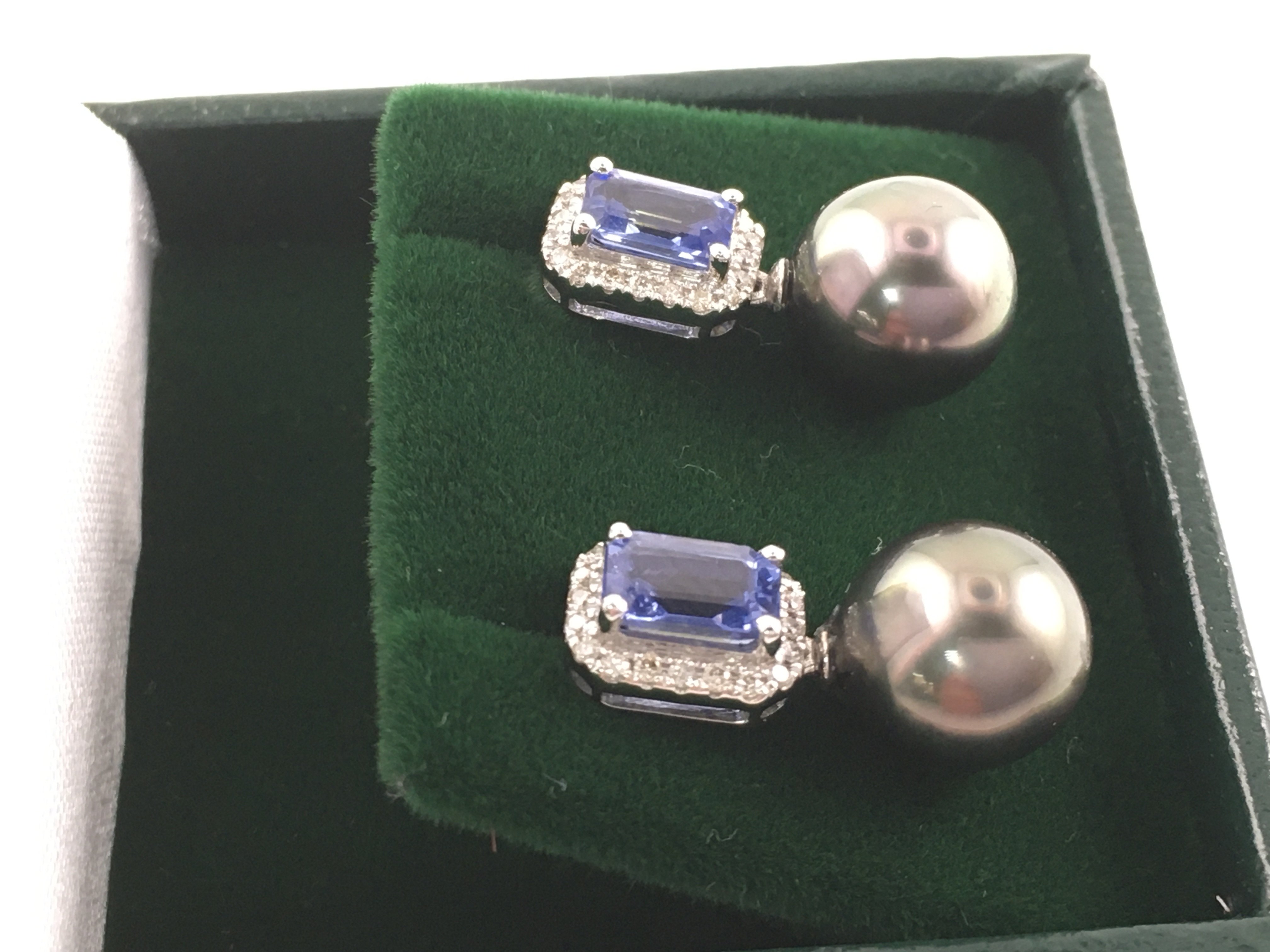 A pair of black pearl set cut sapphire and diamond drop earrings. Sapphires approximately 1.41ct and diamonds 0.15ct. Postage B