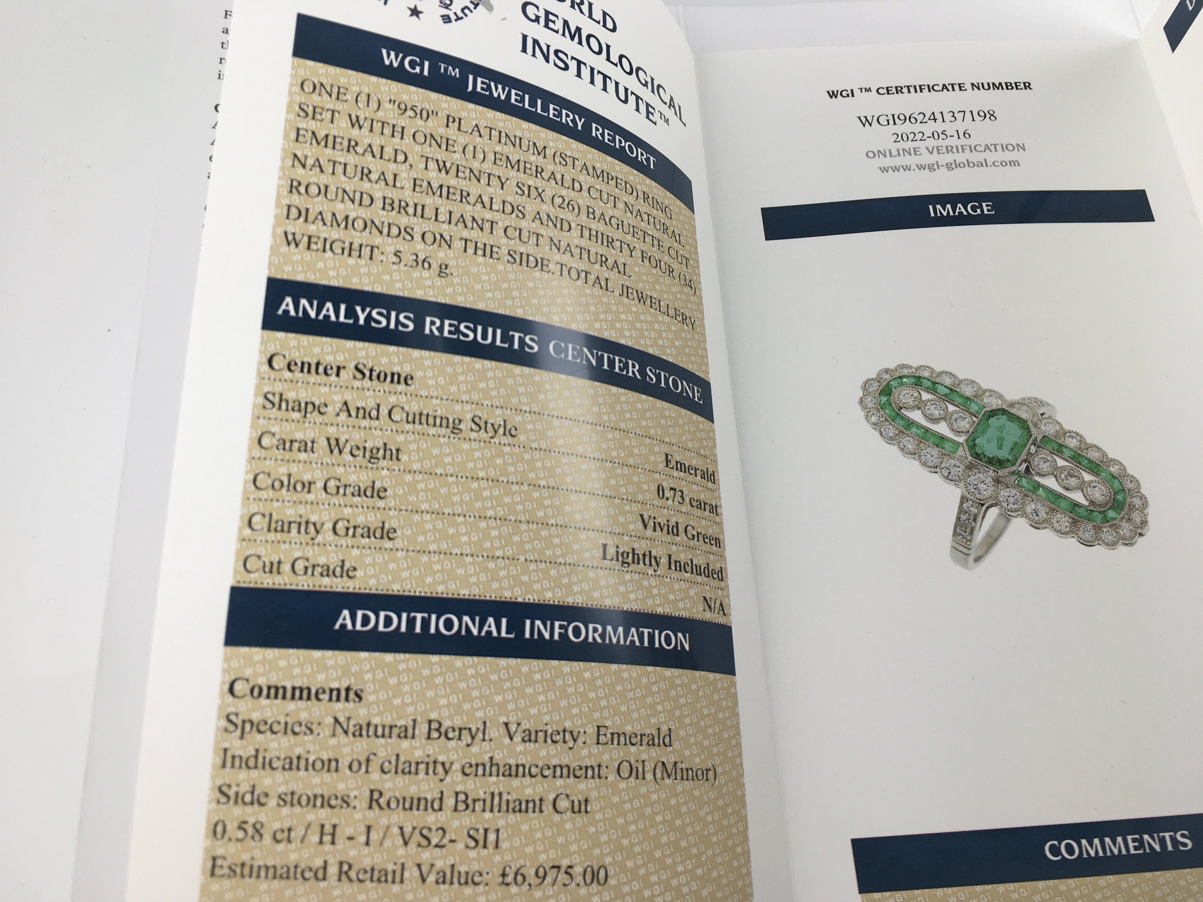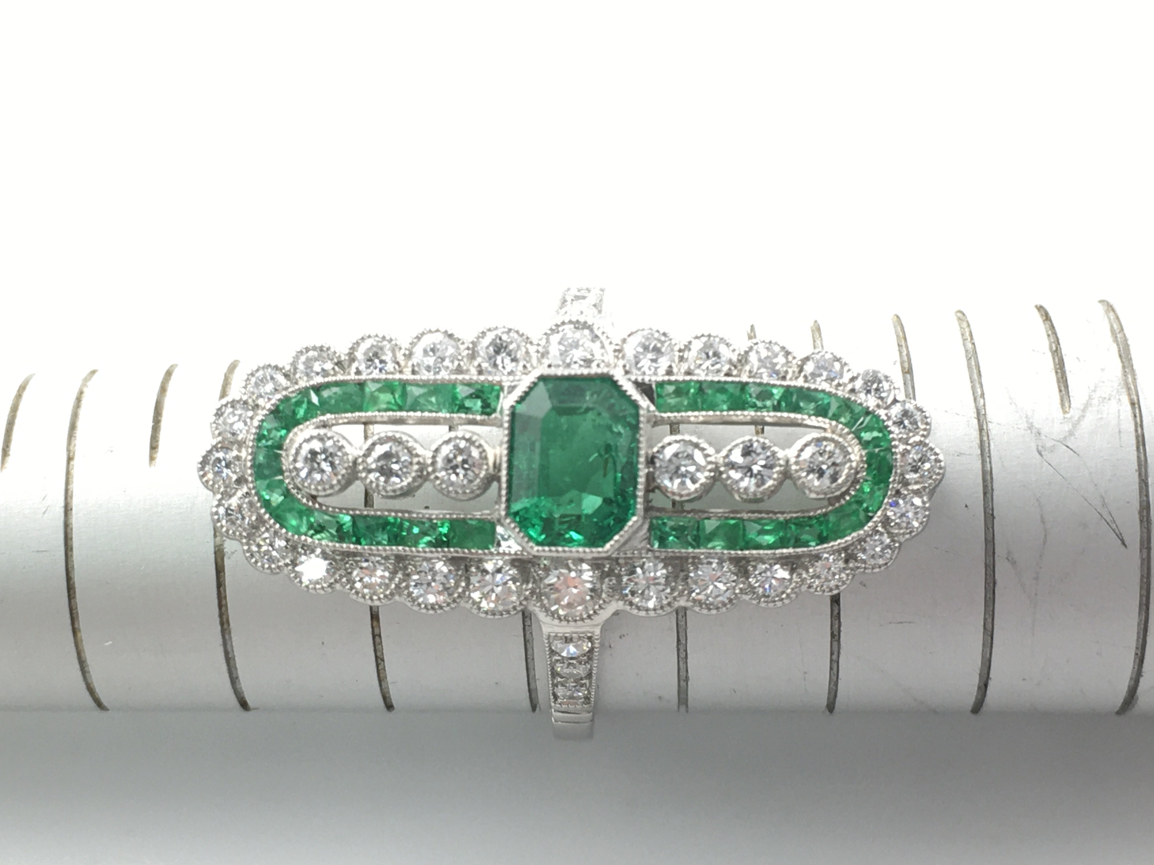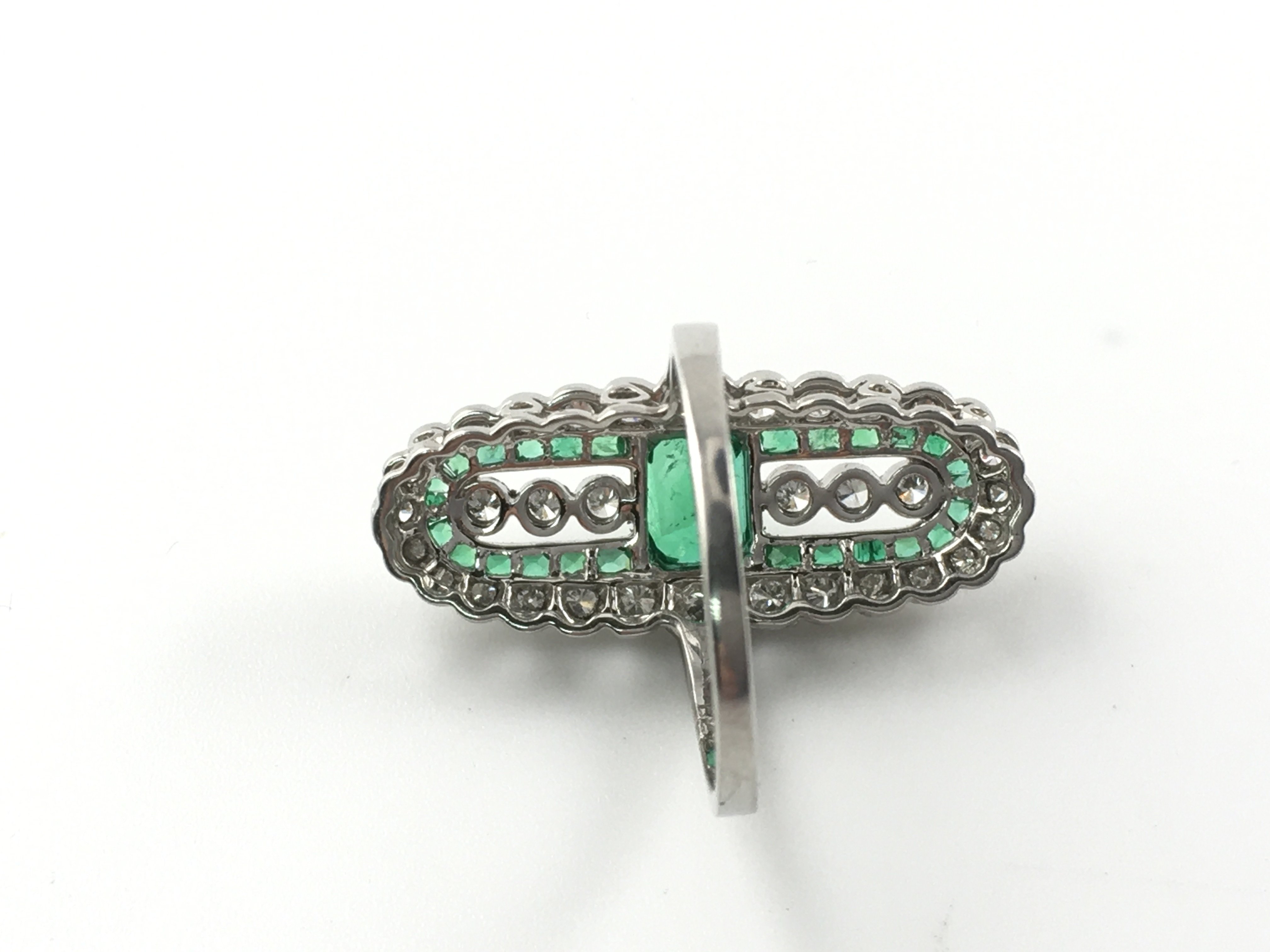 Platinum elongated ring set with emeralds and diamonds. Emeralds approx 0.73ct and 0.58ct diamonds with cert. Size J Postage A