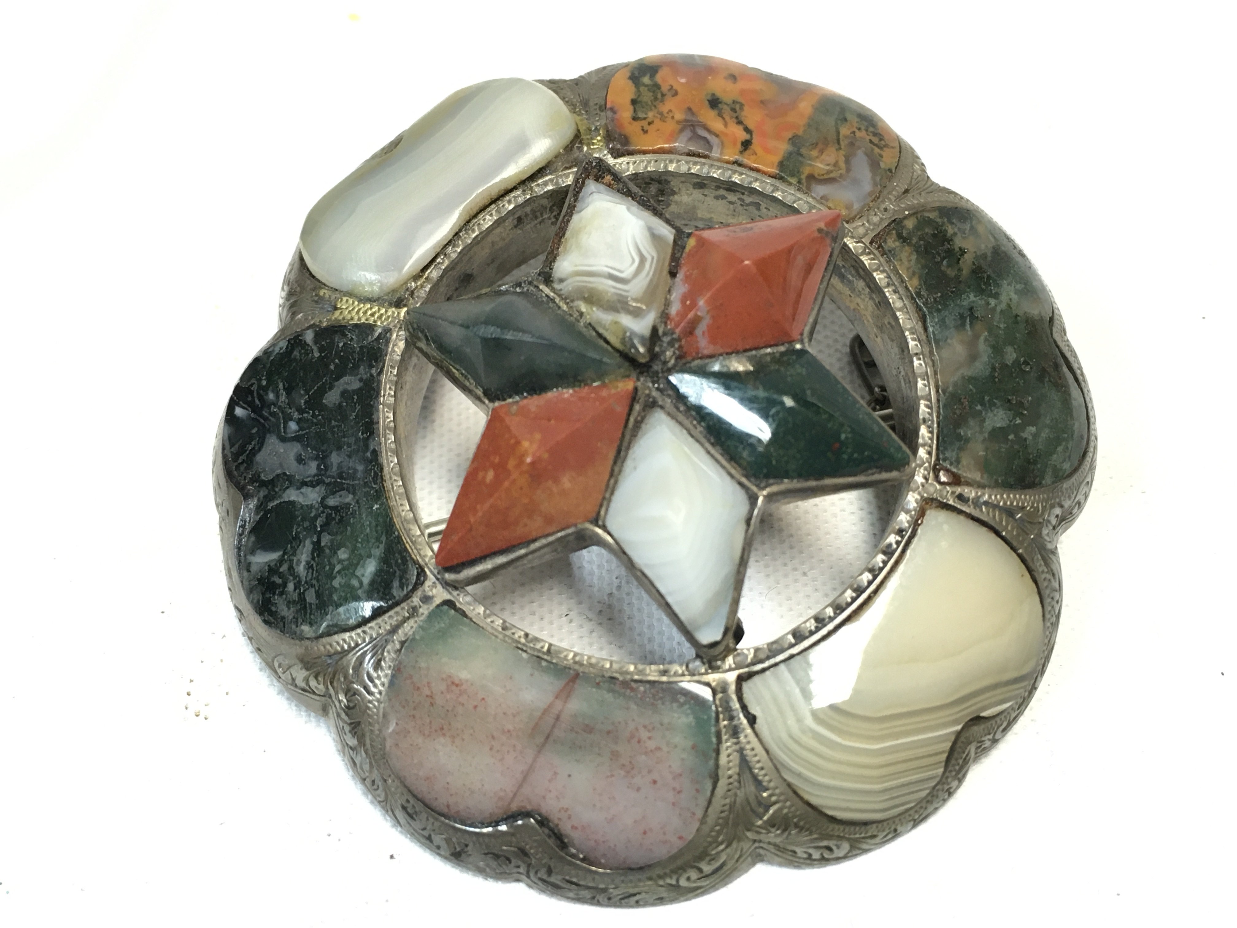 A Victorian Scottish inset agate brooch with engraved borders. 5.4cm diameter