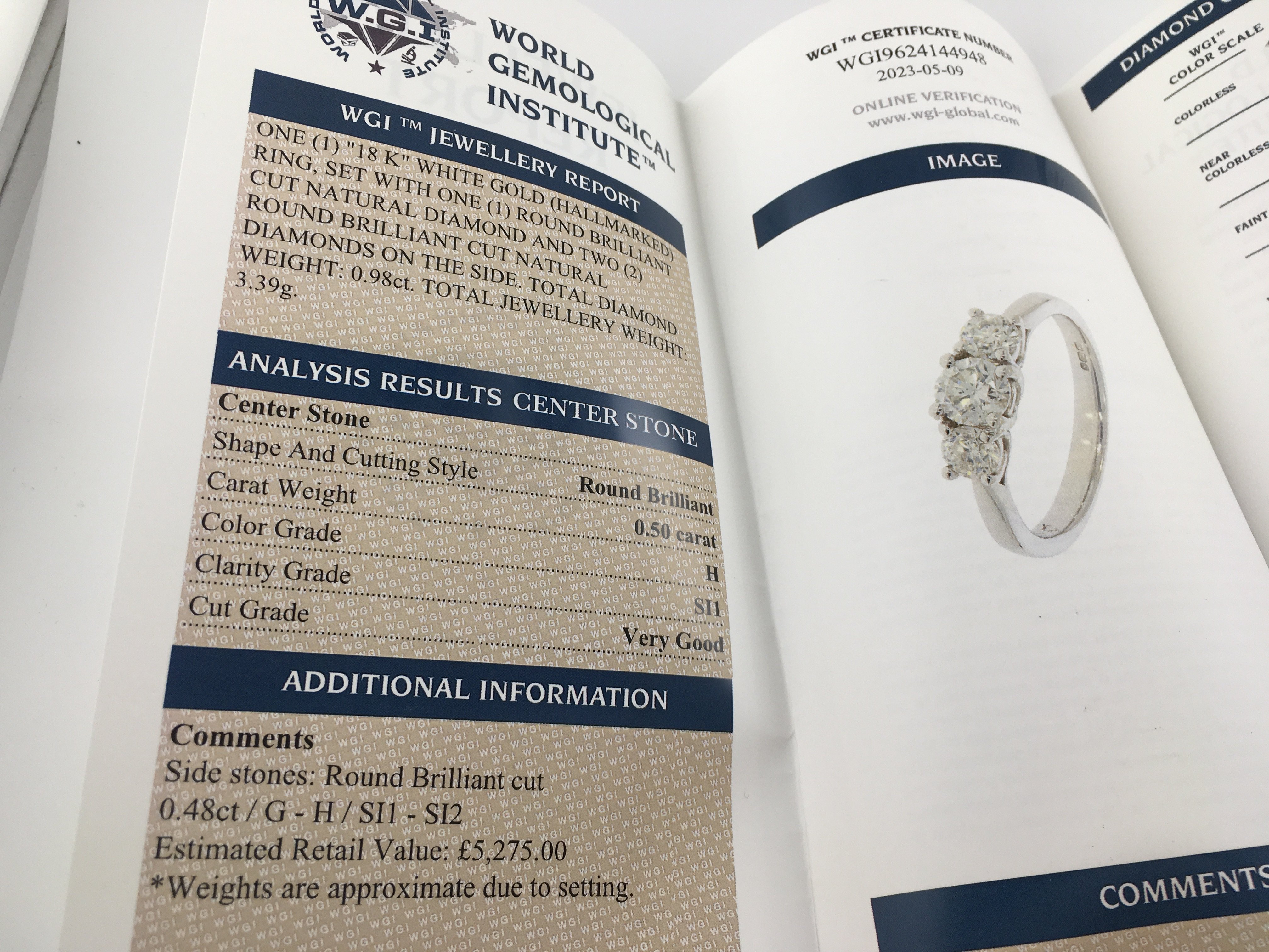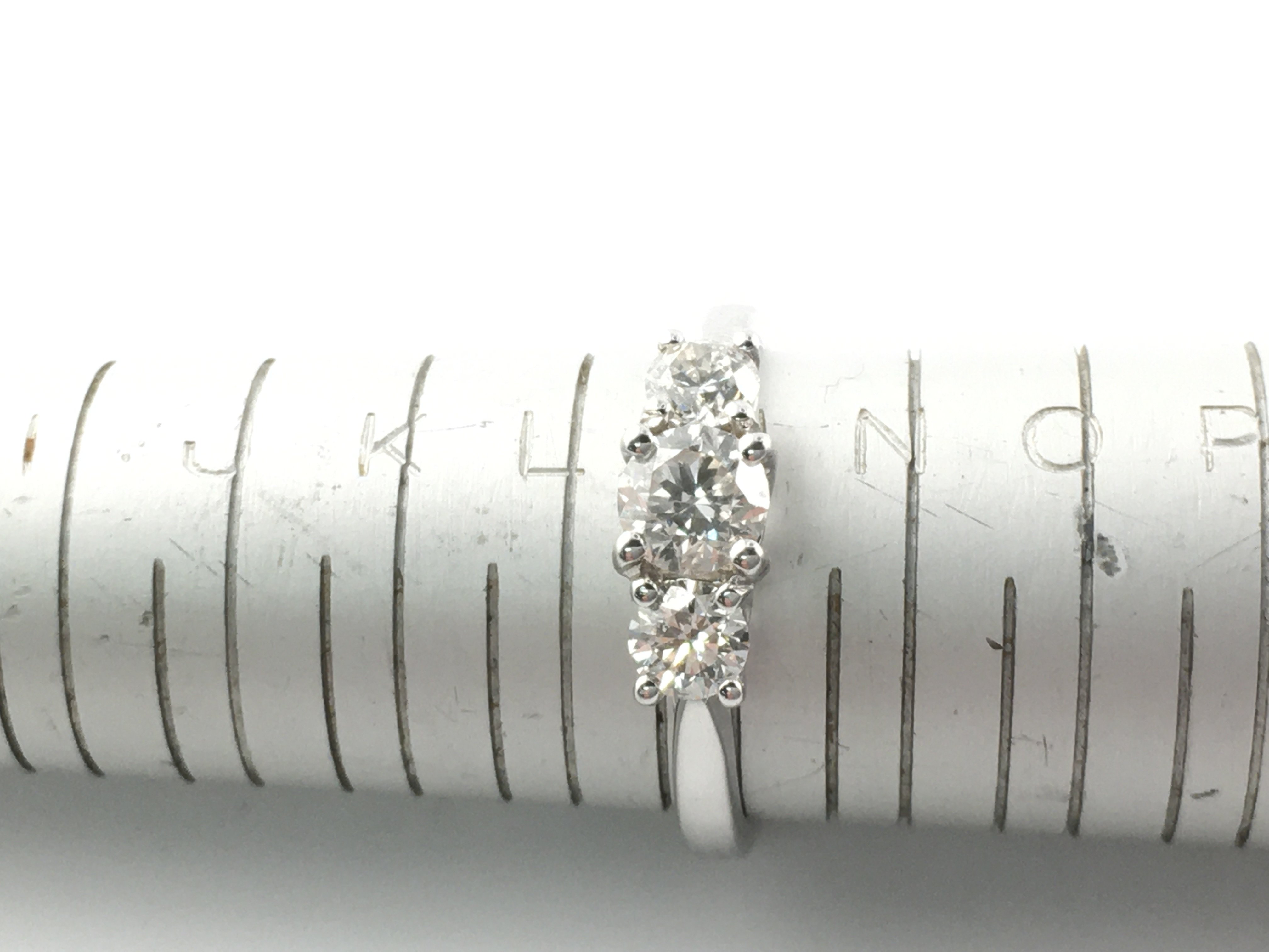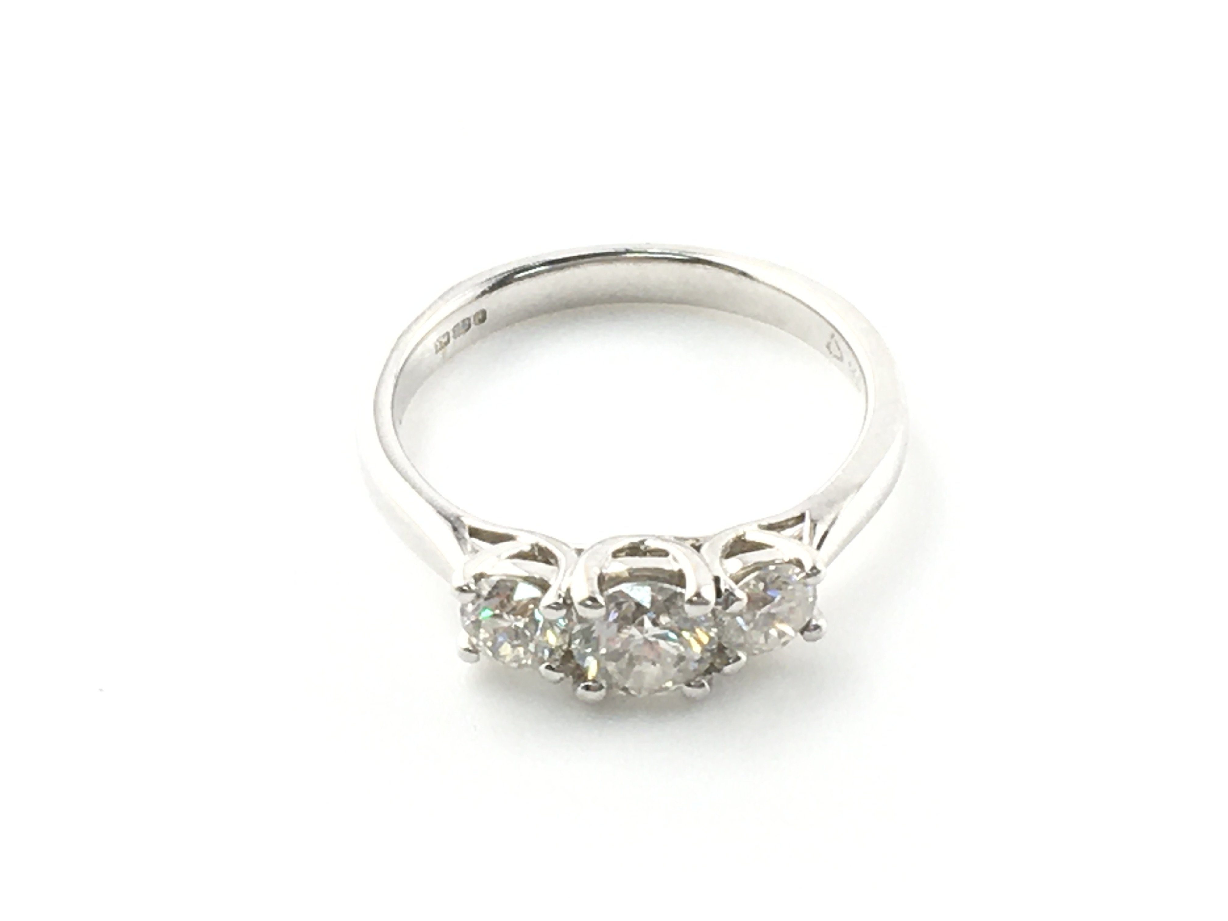 An 18ct white gold graduated diamond trilogy ring. Size M diamonds approximately 0.98ct with cert. Postage A