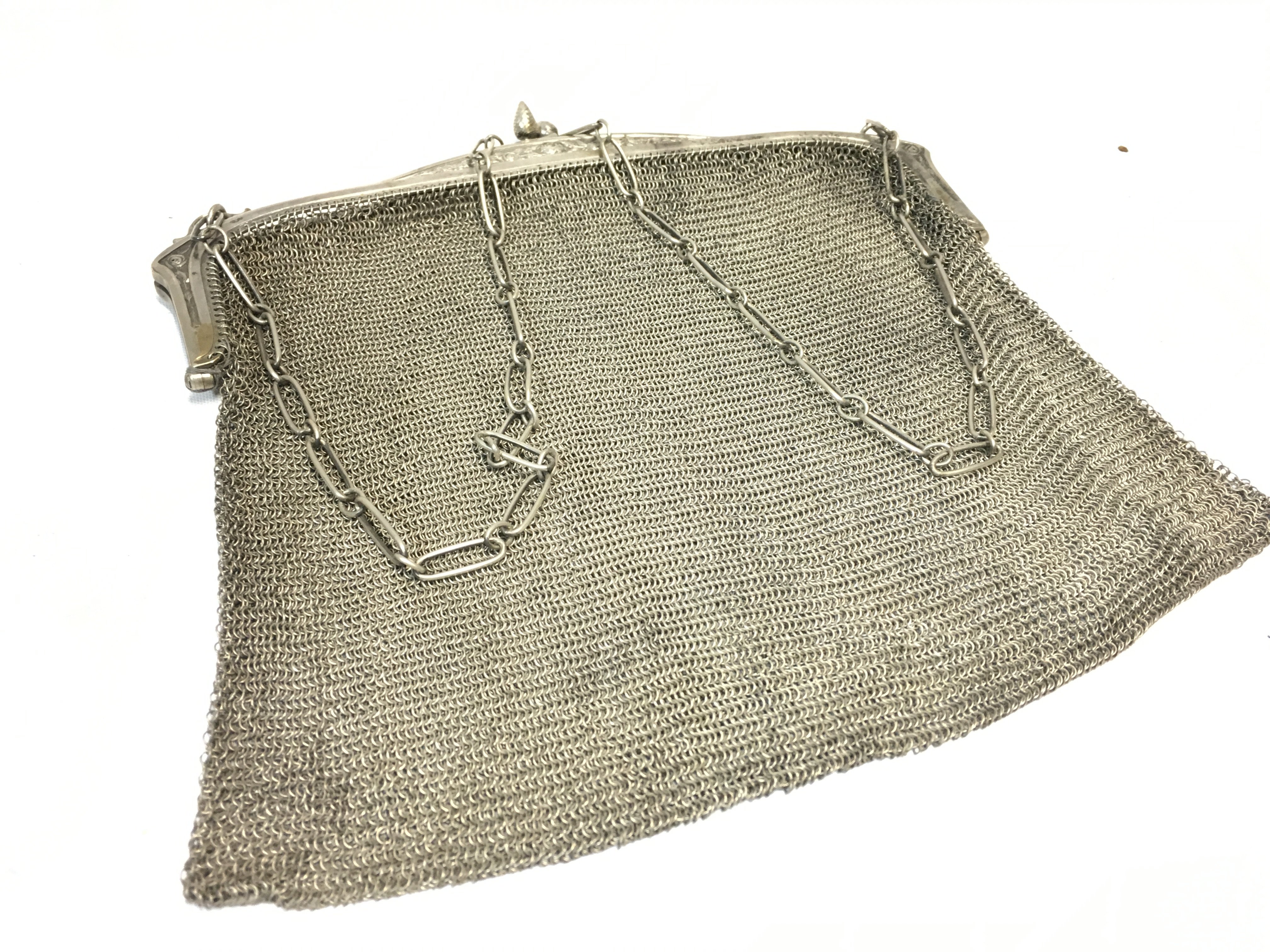 A Eastern white metal (tested silver) mesh evening bag and chain. Approx 270g. (B)