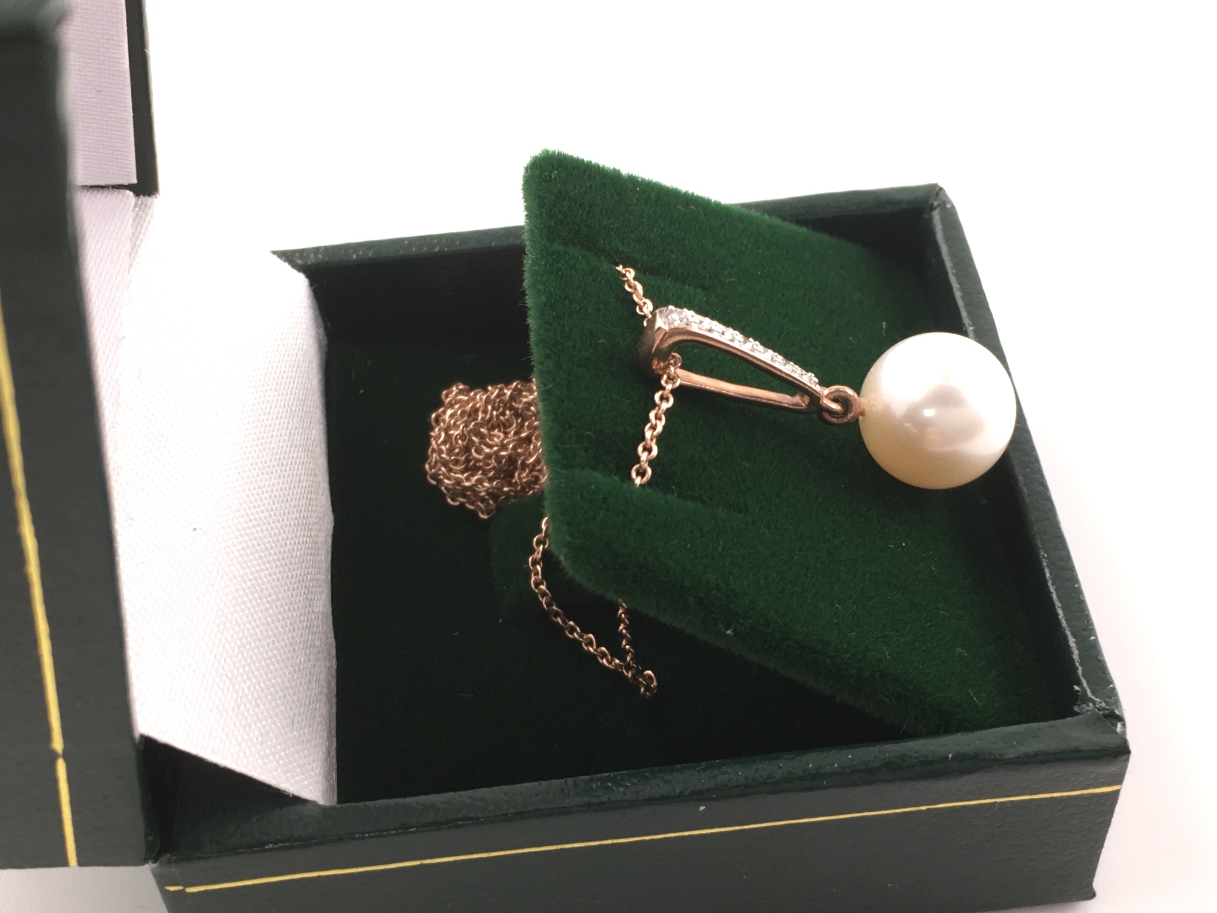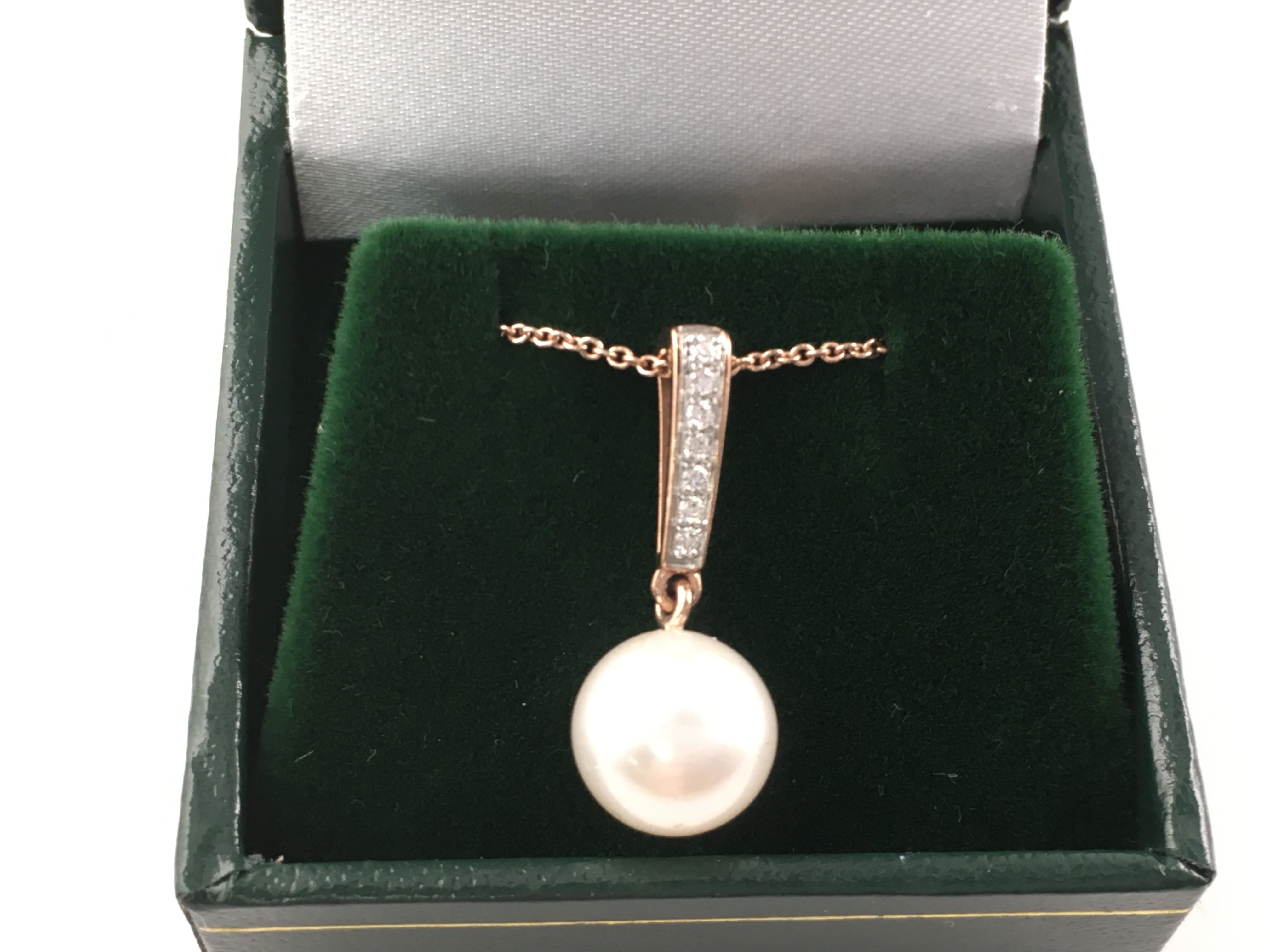 9ct rose gold freshwater pearl pendant with tapered diamond bale on 9ct rose gold chain. Postage B