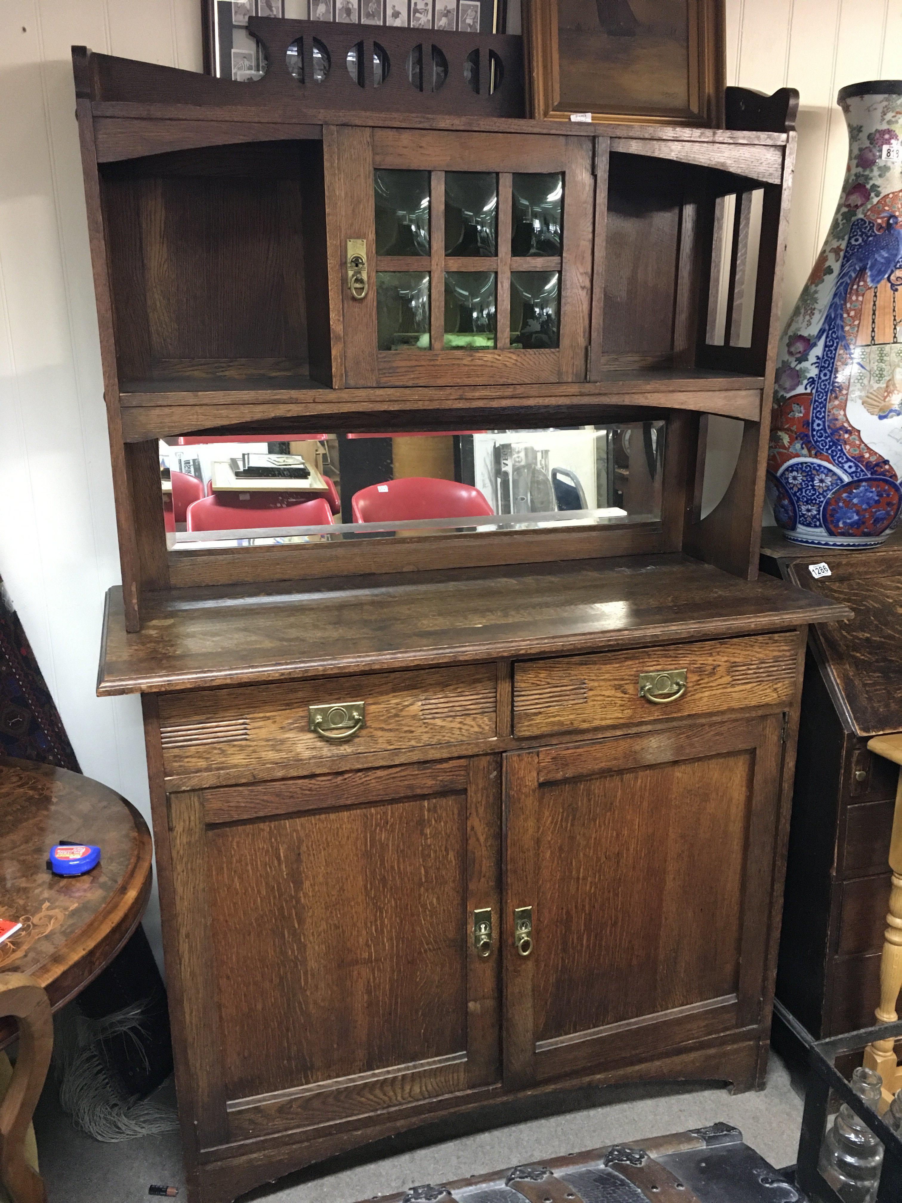 An arts and crafts dresser with raised cupboards, green stained glass, brass fittings. Dimensions 52x120x184cm