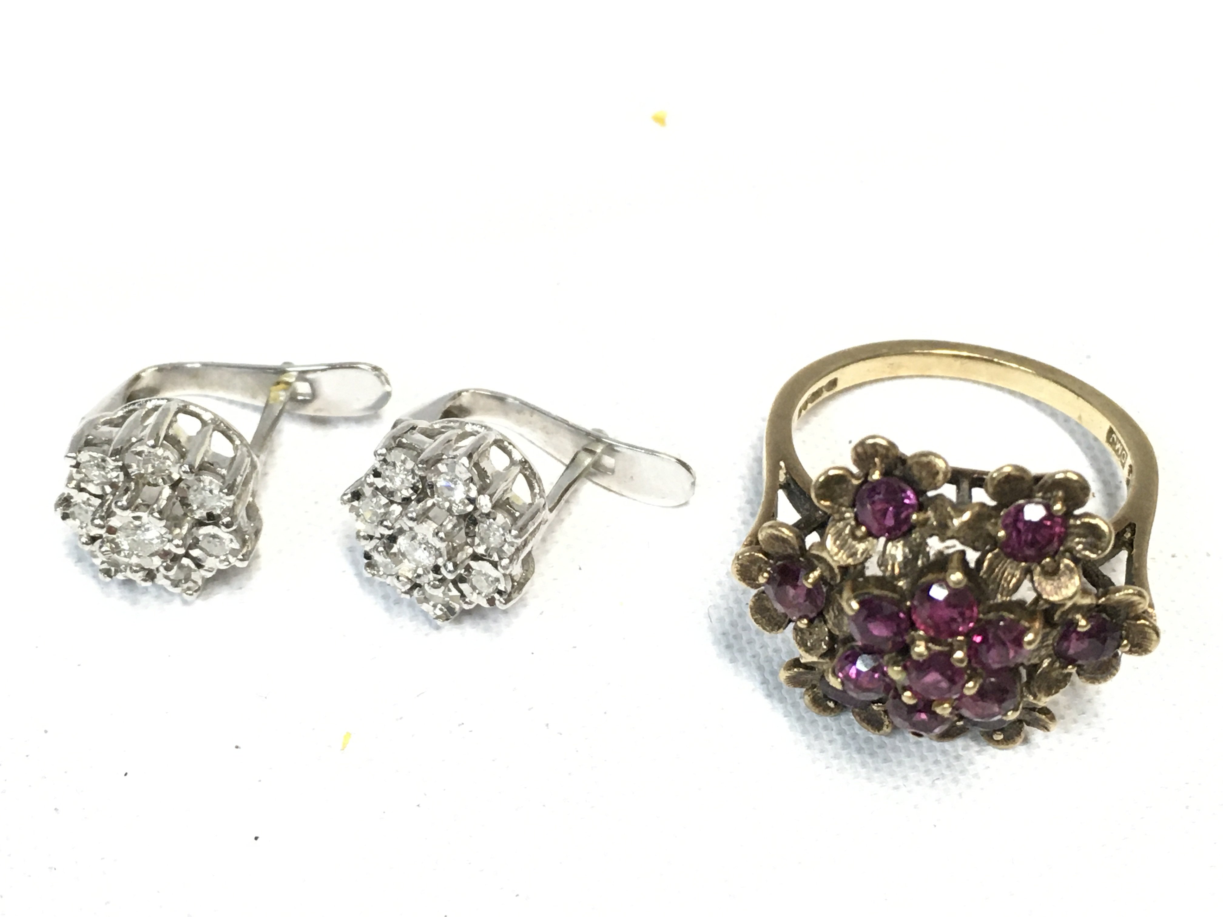 A pair of 9ct white gold illusion set diamond set clip earrings and a 9 carat gold ruby floral design ring. Total jewellery weight 7.33g