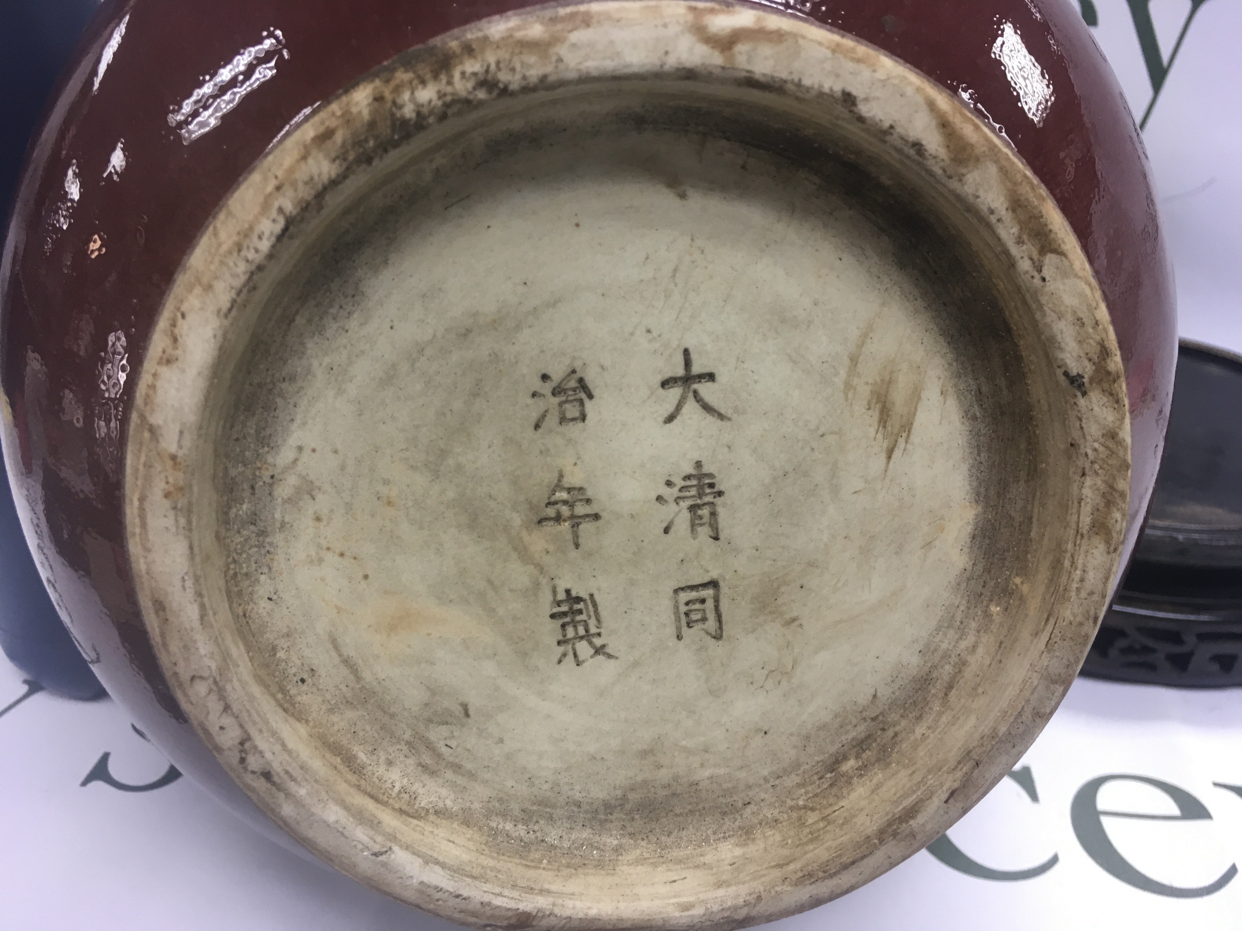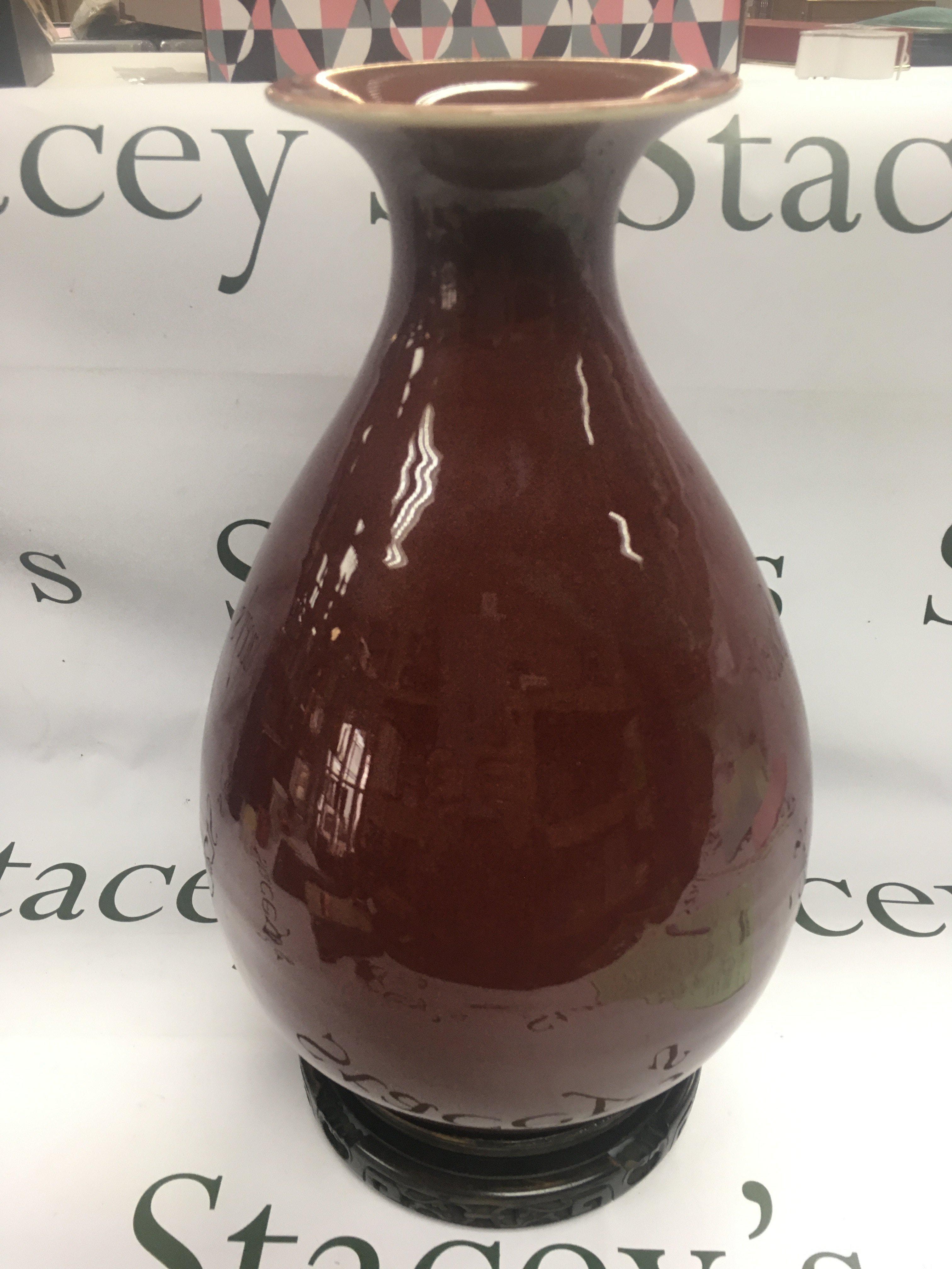 A large Sag De Boeuf vase raised on a carved hardwood base, approx total height 40cm. Six character marks to base. Shipping category D.