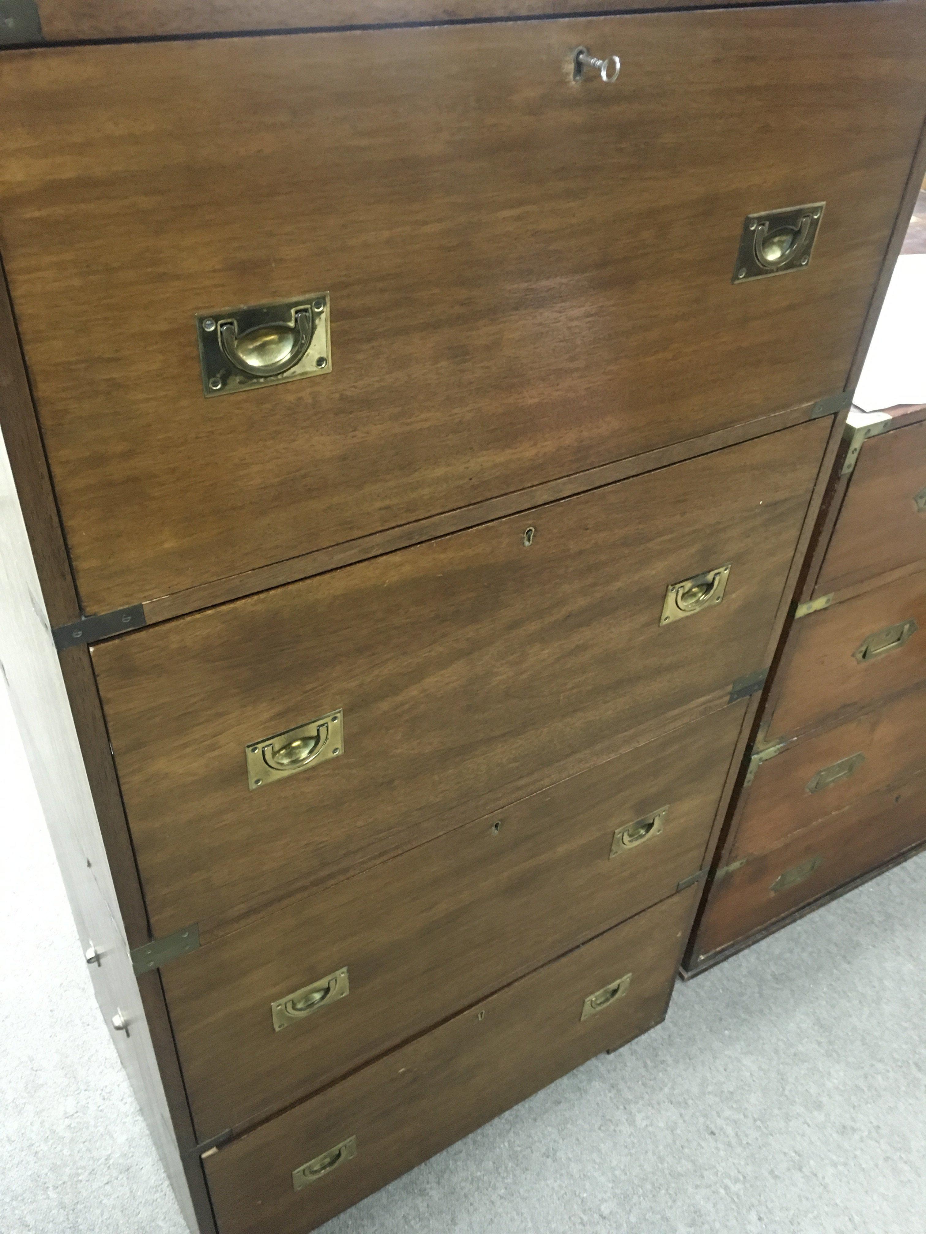 A campaign style brass bound chest of drawers fitted with four drawers