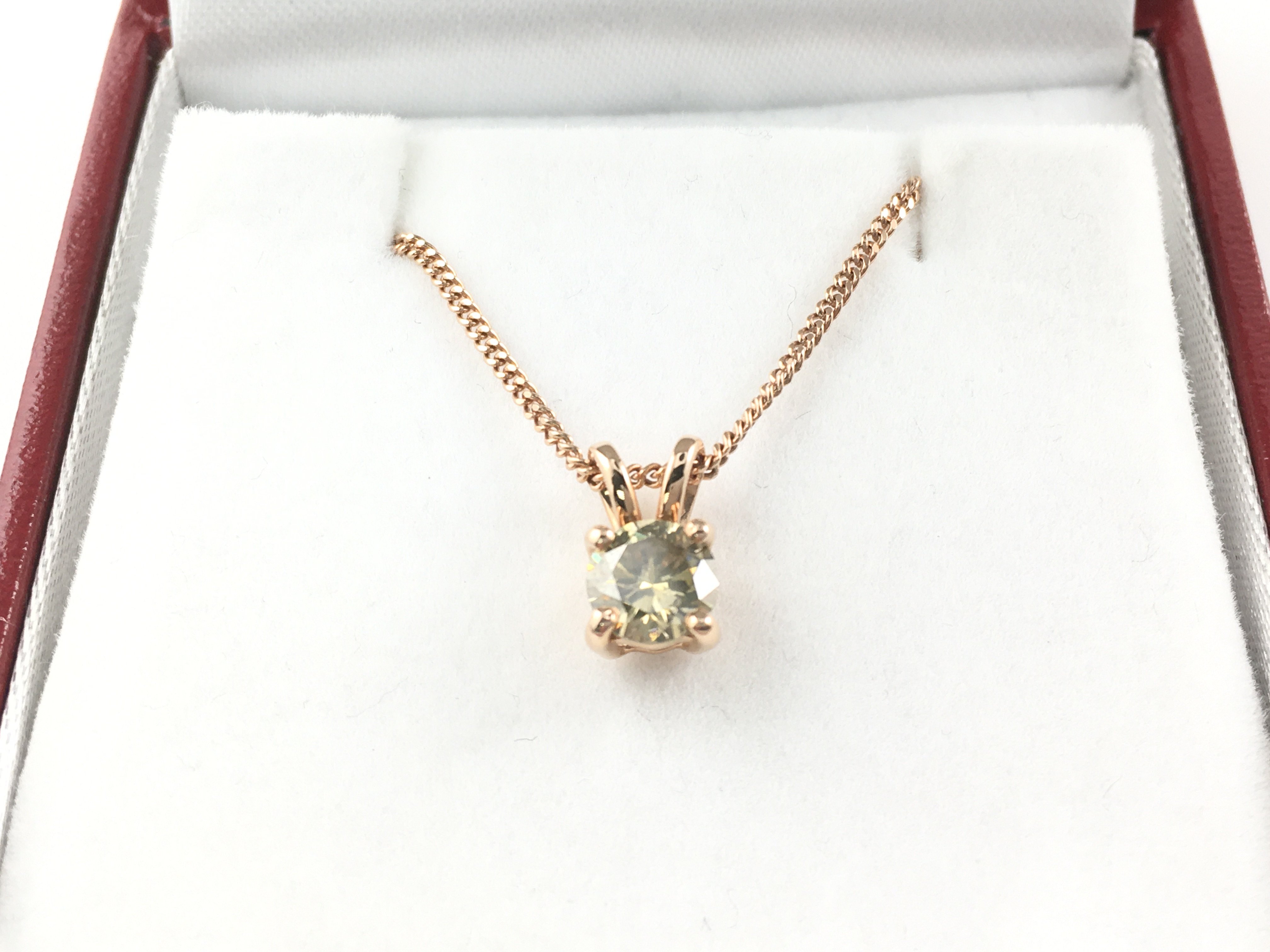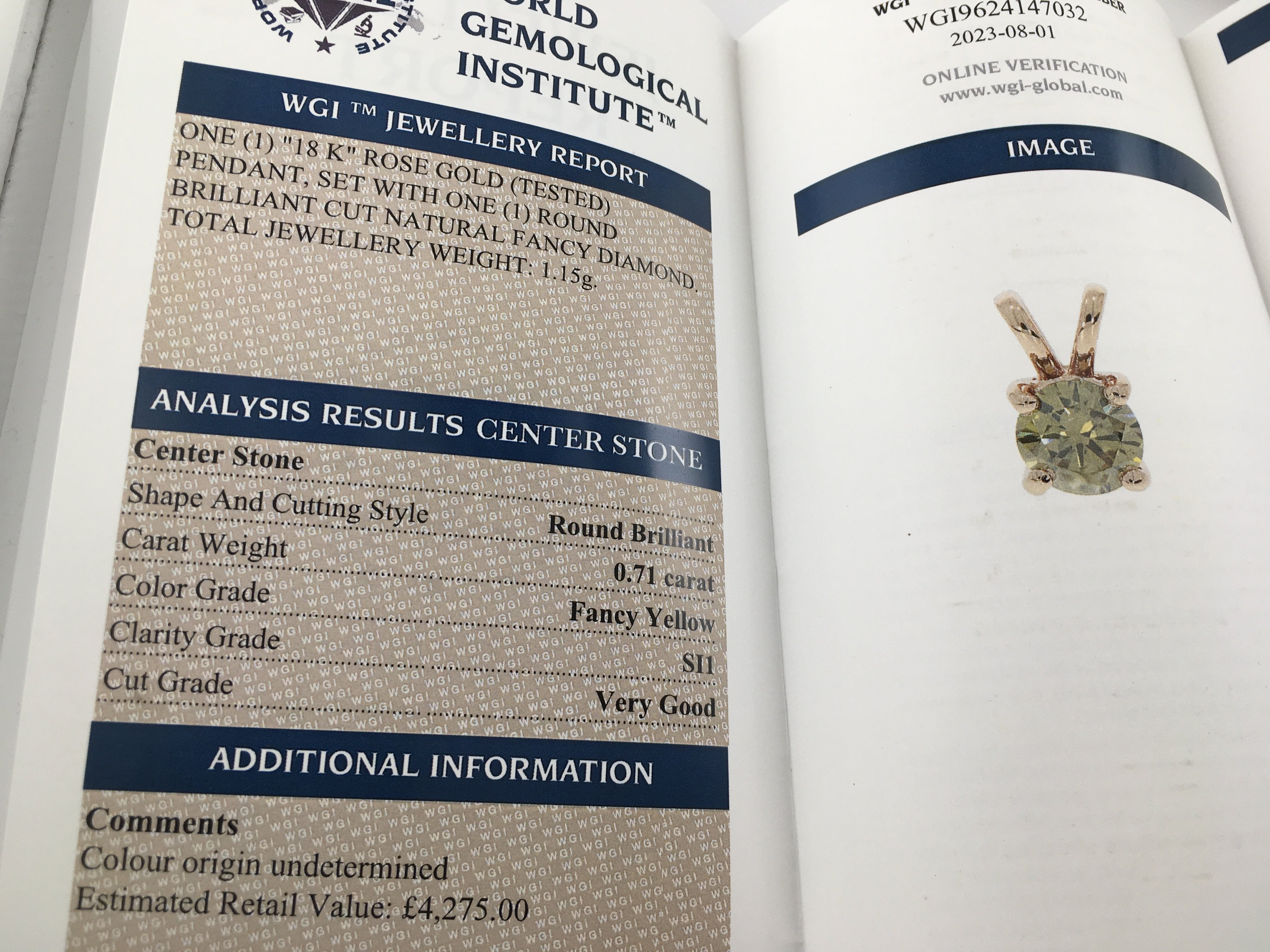 18ct rose gold solitaire pendant set with RBC Fancy yellow diamond on a rose gold plated silver chain. Diamond 0.71ct with cert. Postage A
