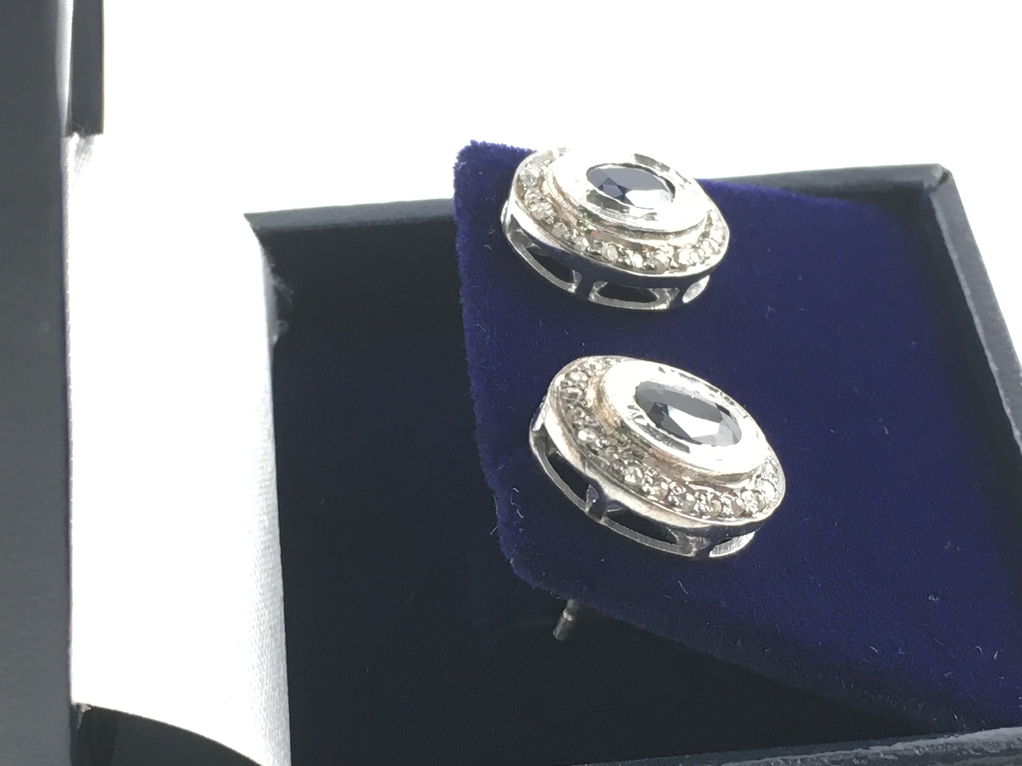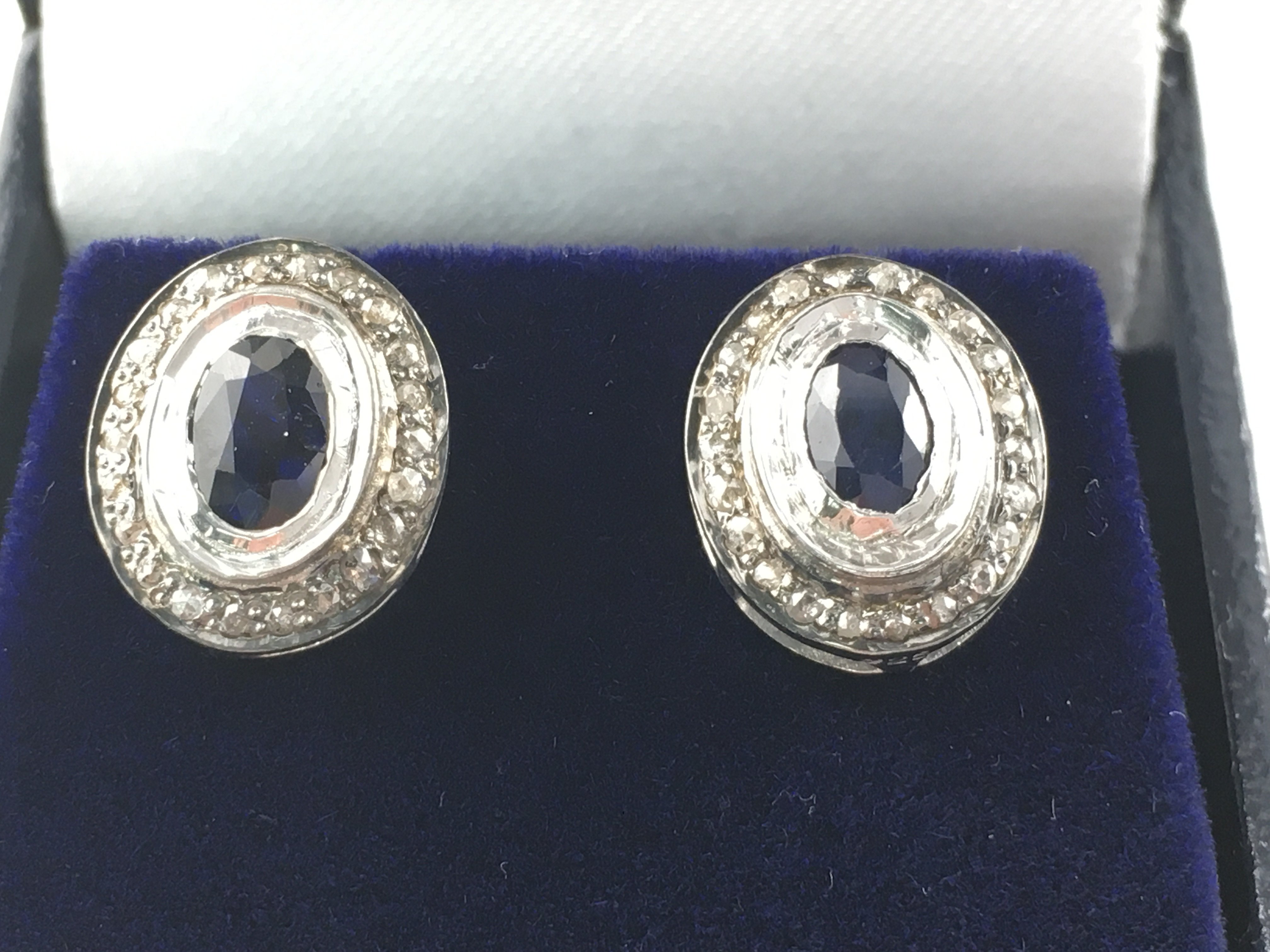 A pair of silver studs set with oval sapphires and diamond halos. Sapphires approximately 0.45ct and diamonds 0.25ct. Postage B