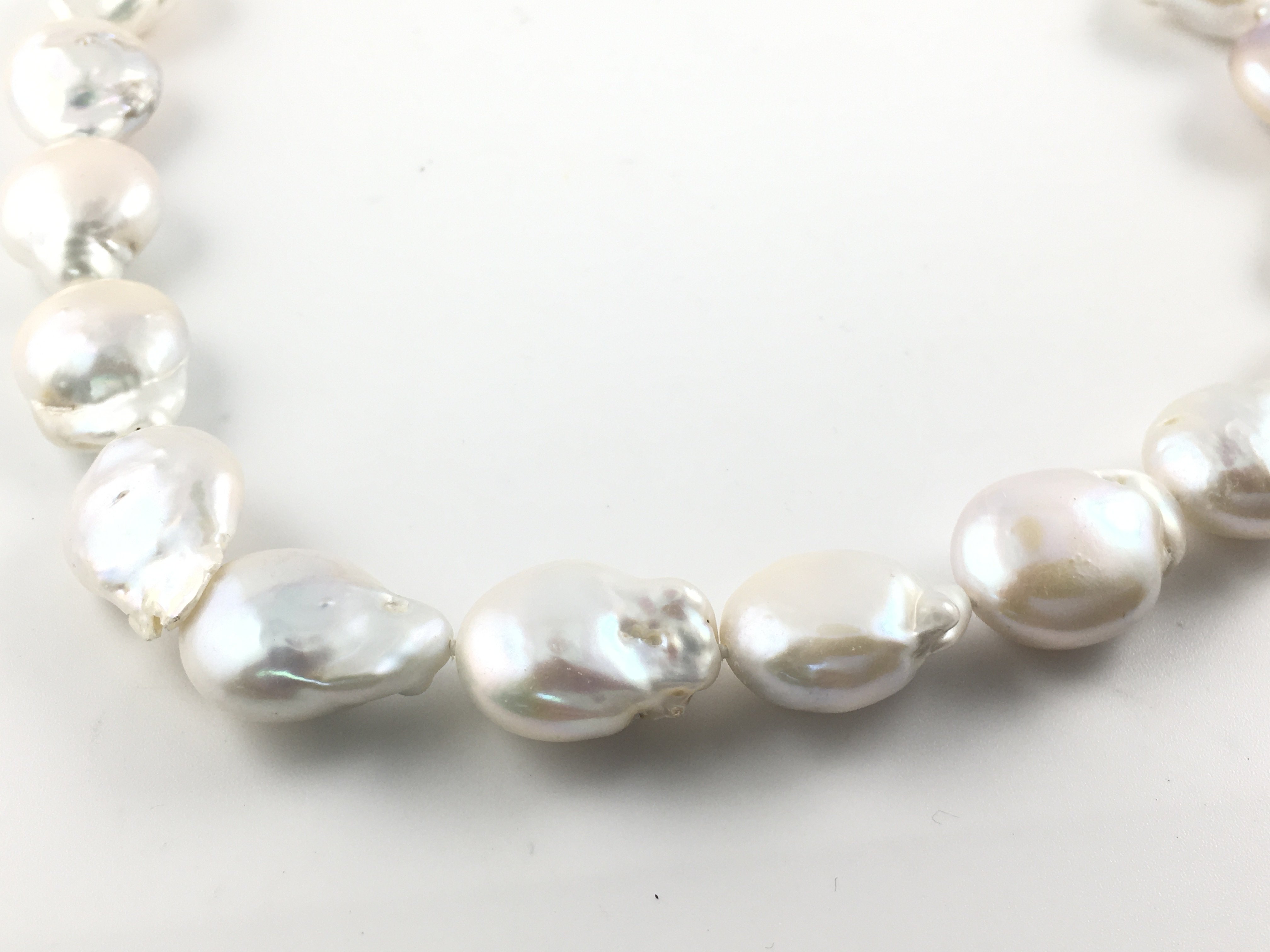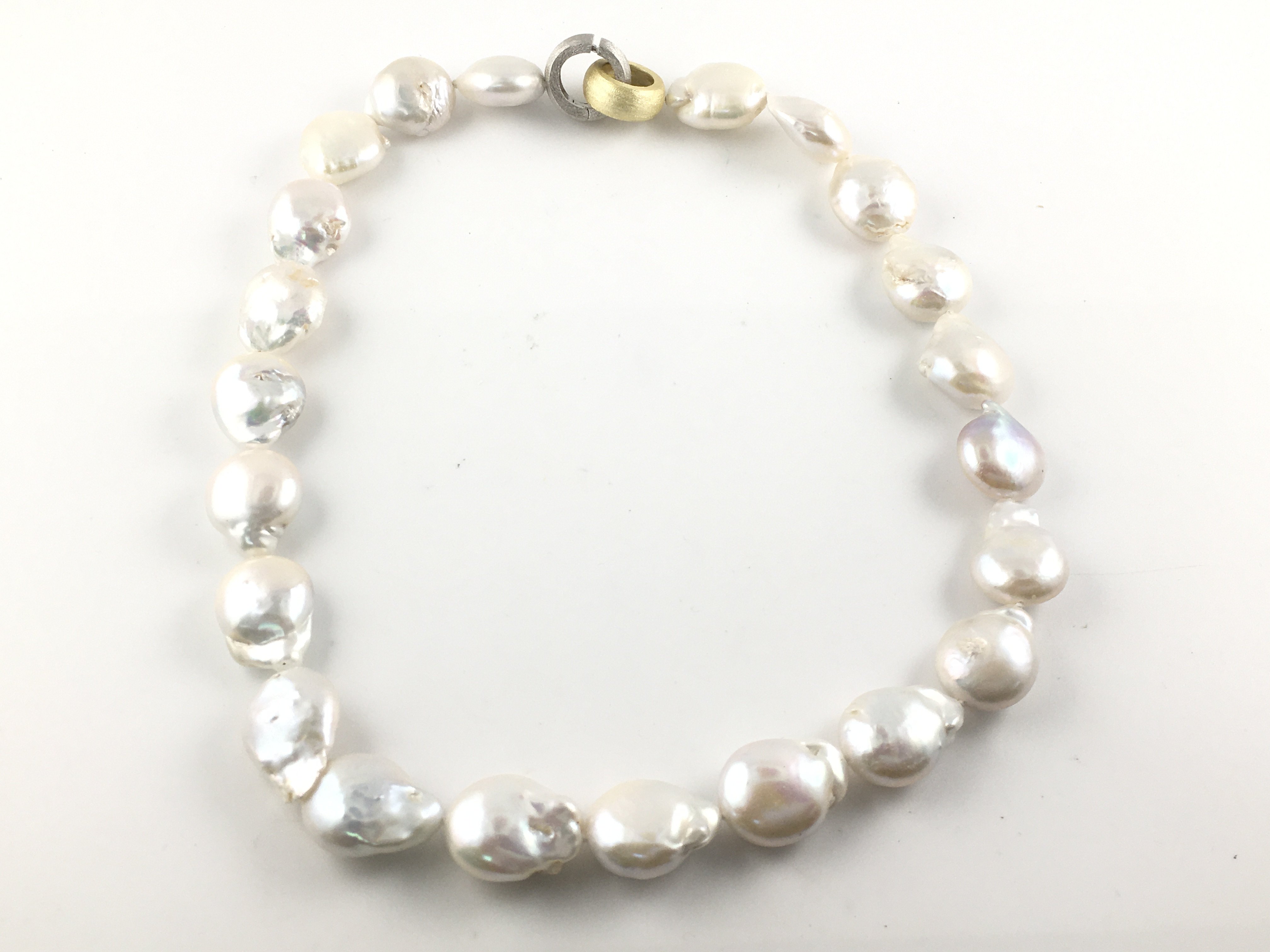 Baroque pearl necklace with brushed gold plated and silver hinged hoop clasp. Postage A