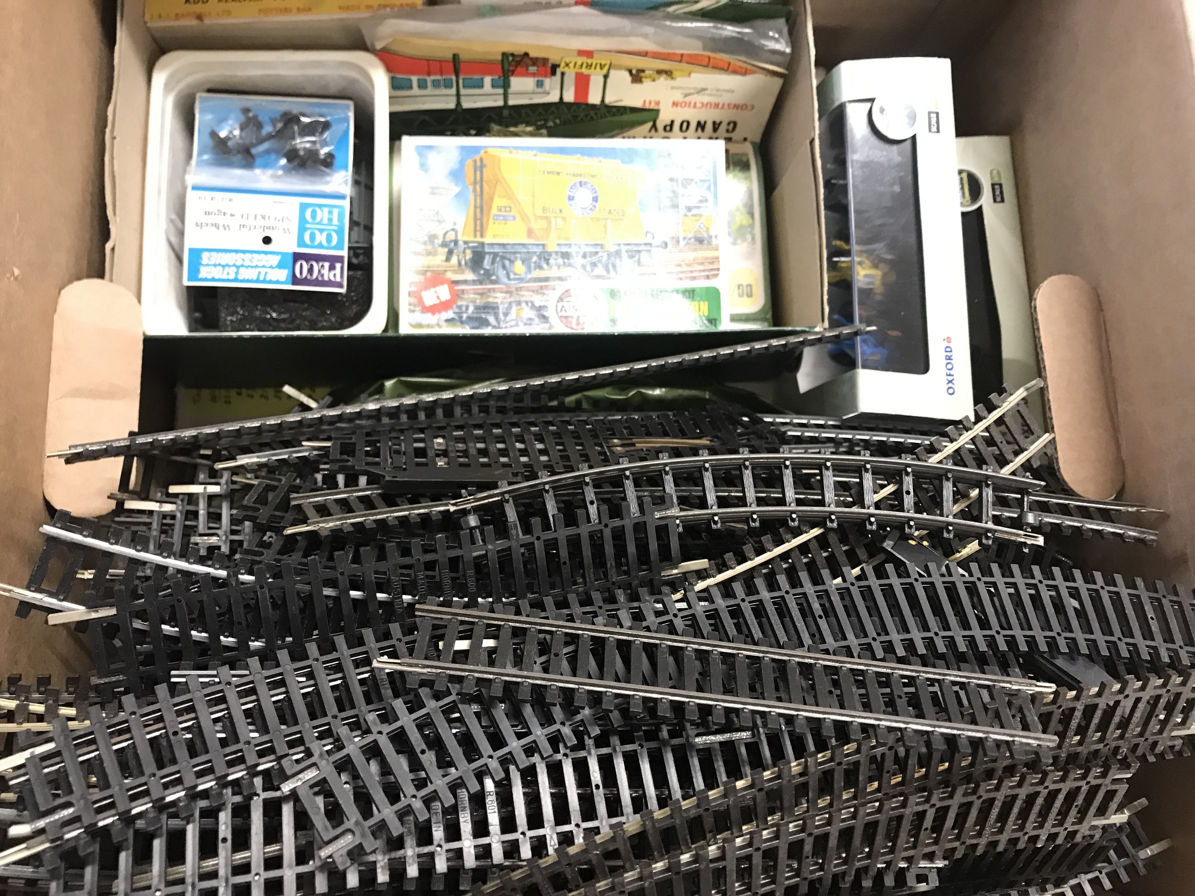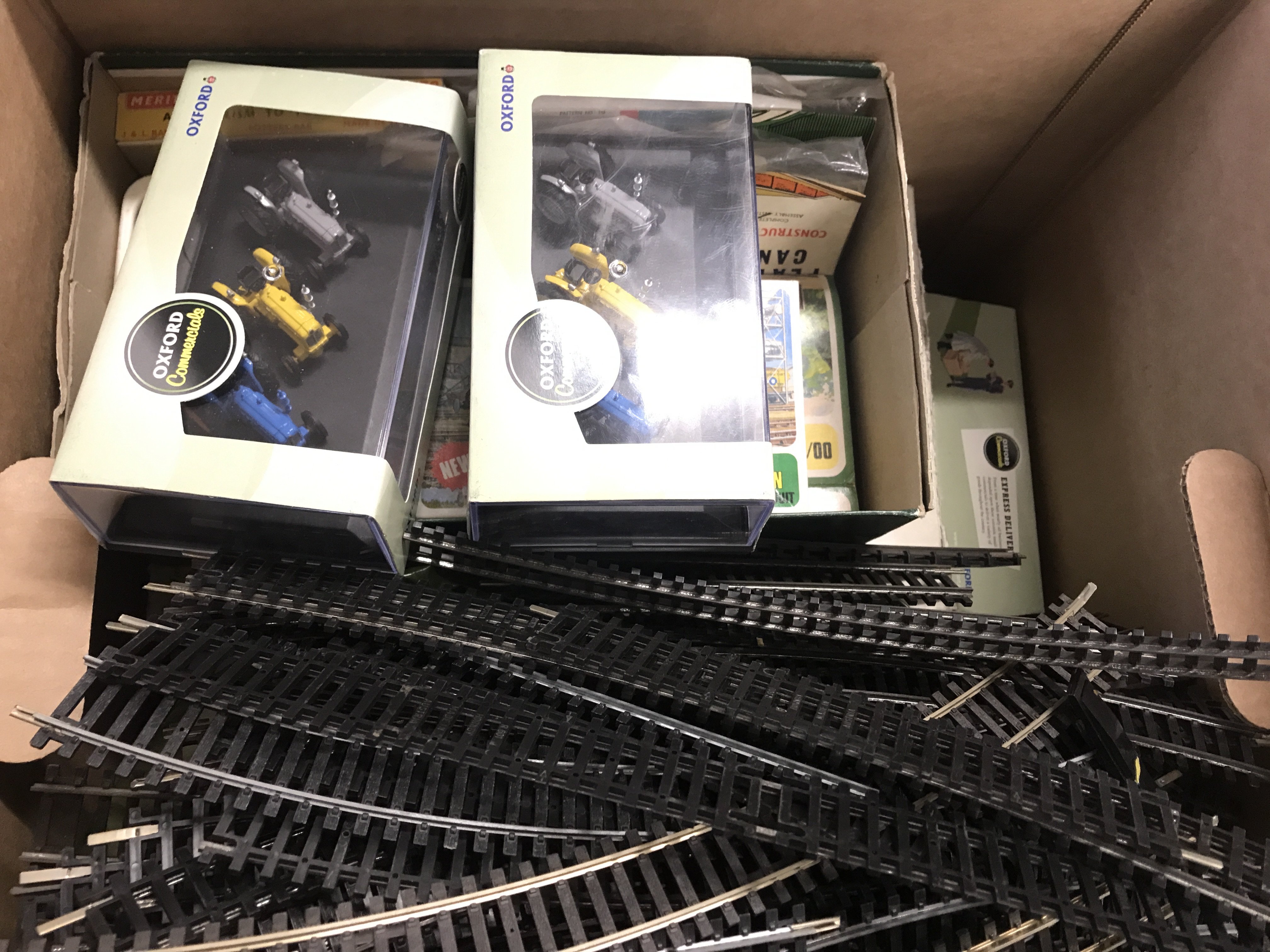 A Box Containing 00 Gauge Track. Model kits and Oxford Diecast.