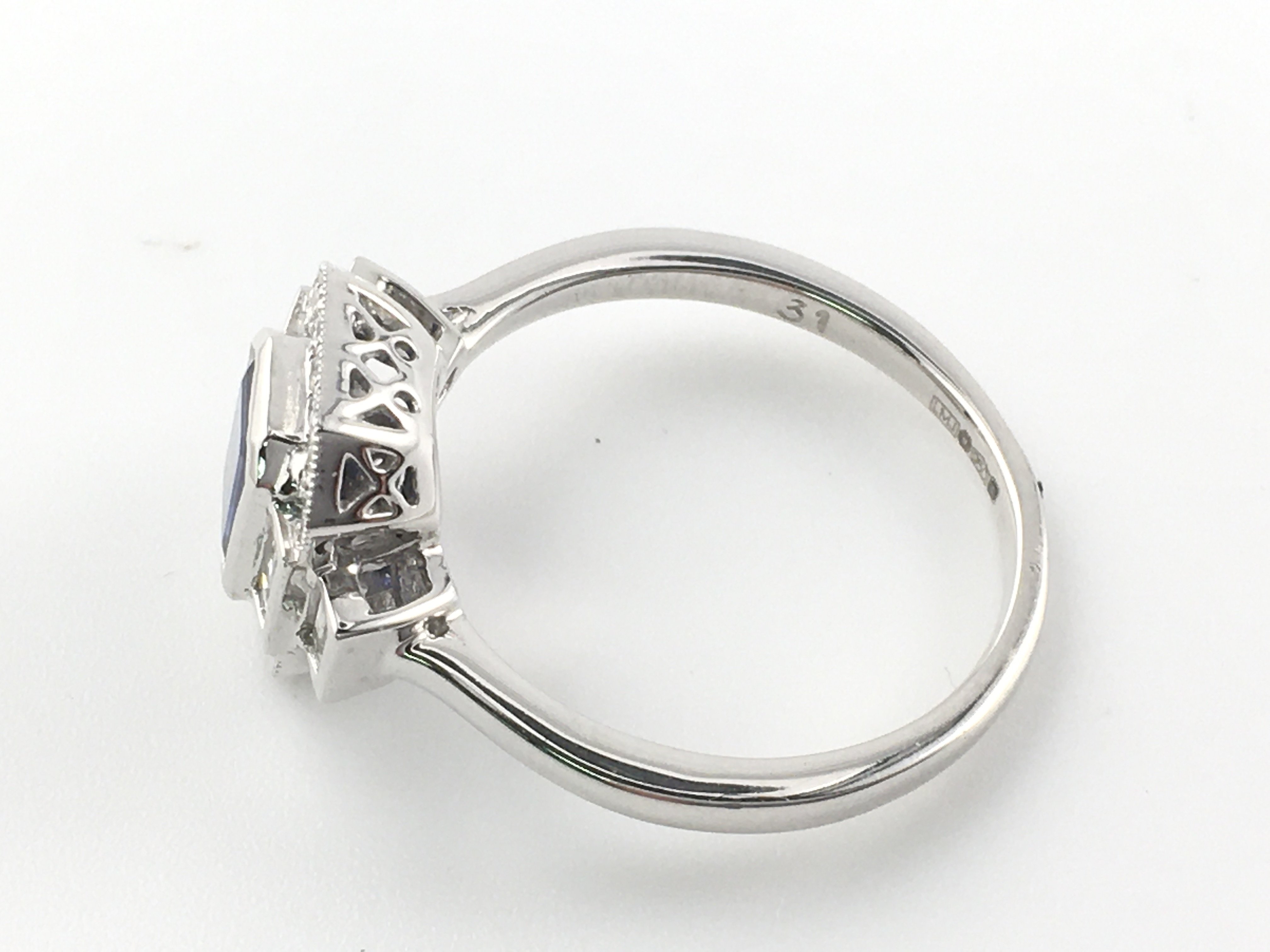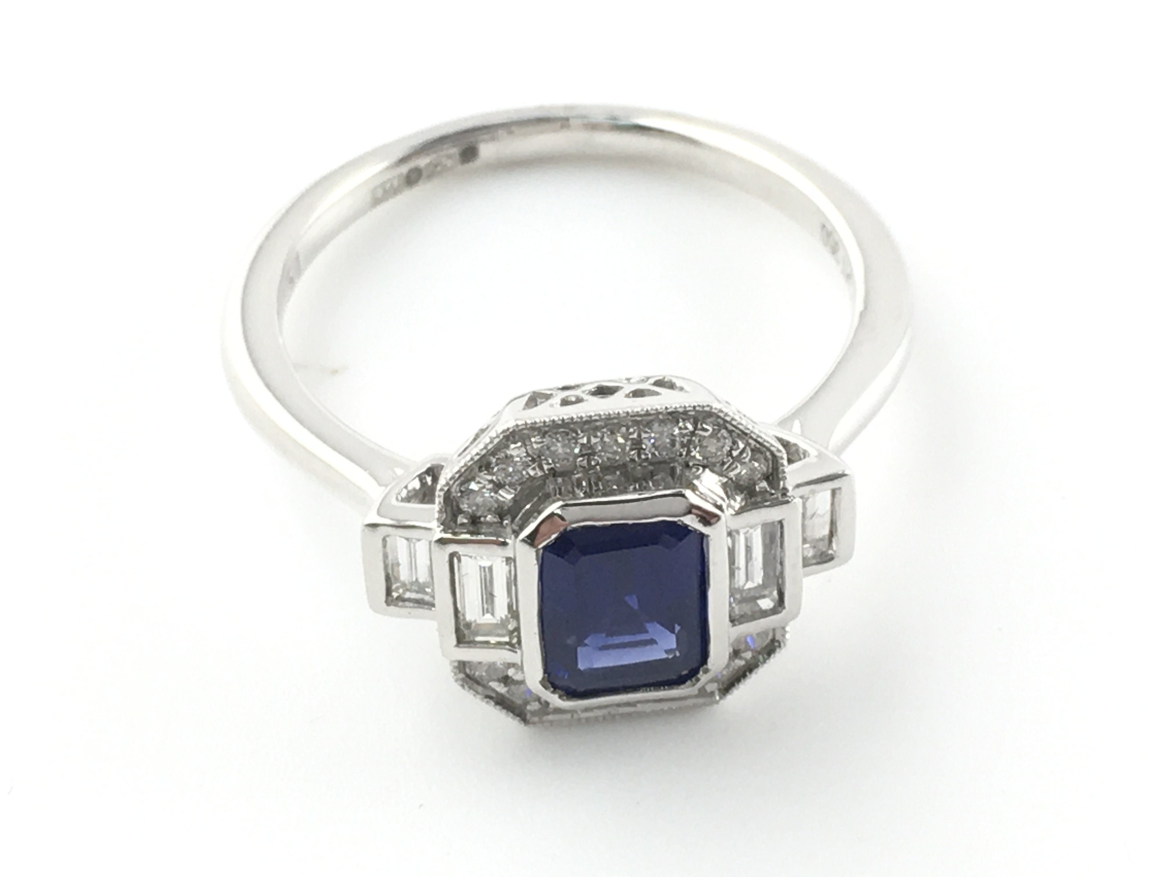 Platinum Art Deco style ring set with a step cut sapphire and round and baguette cut diamonds. Sapphire 1.15ct and diamonds 0.34ct. Size N 1/2. Postage A