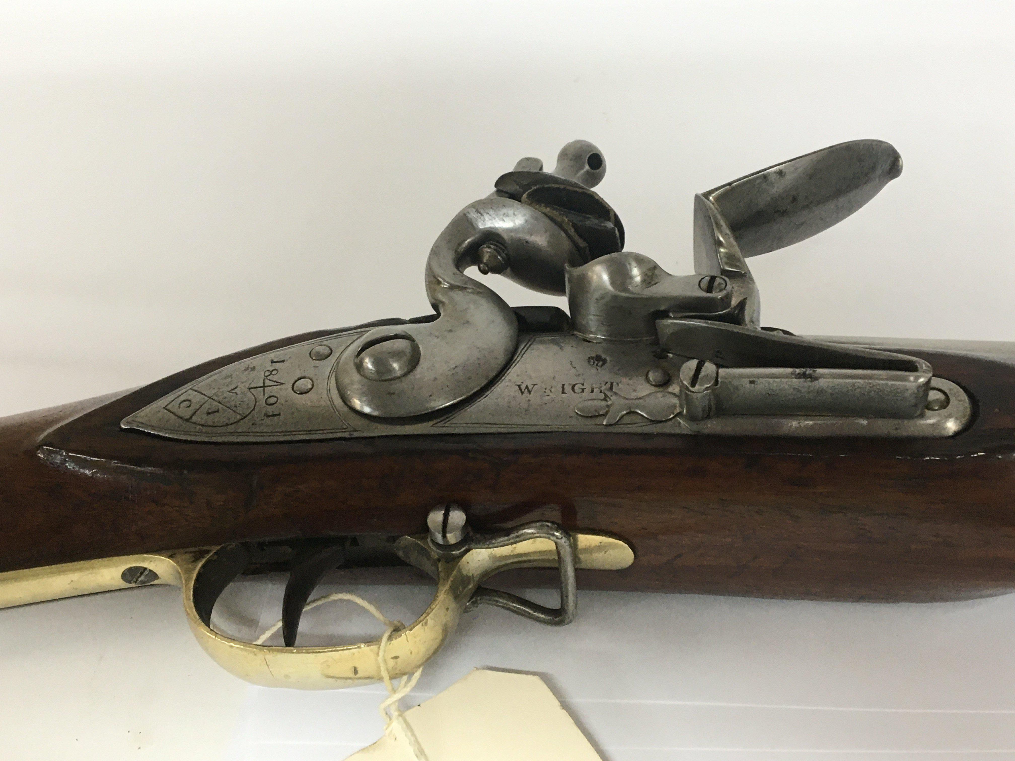 A Flint lock Brown Bess Musket circa 1801-08 believed to be the New land pattern steel barrel and mechanism the action with crown mark and stamped Wright with other interesting marks of the East India Company.Brass fittings a nice example.