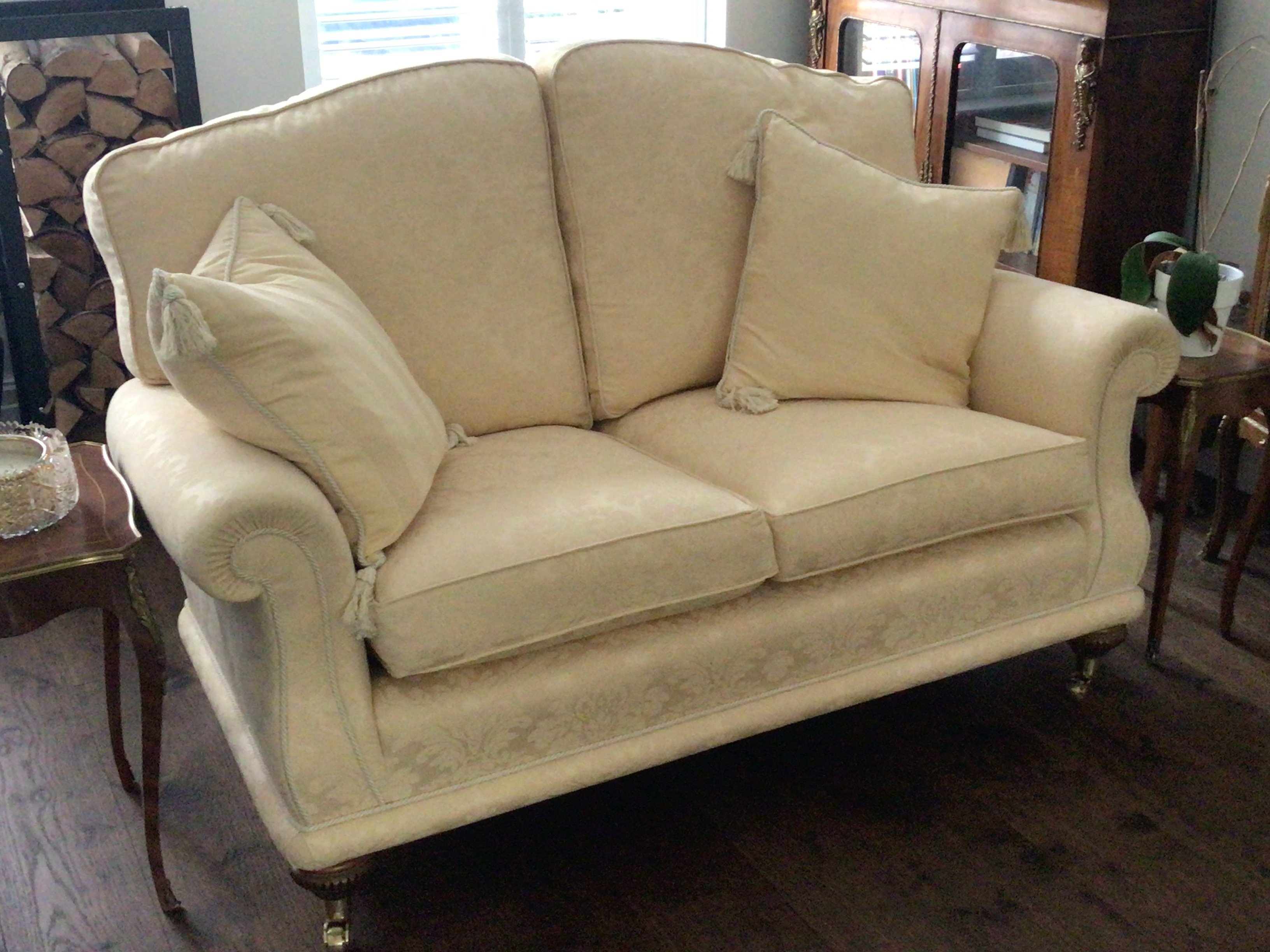 A fine quality two seater sofa upholstered in yellow floral fabric with two scatter cushions on mahogany legs terminating with brass caps and casters. (Sold in situ delivery arrangements by appointment)