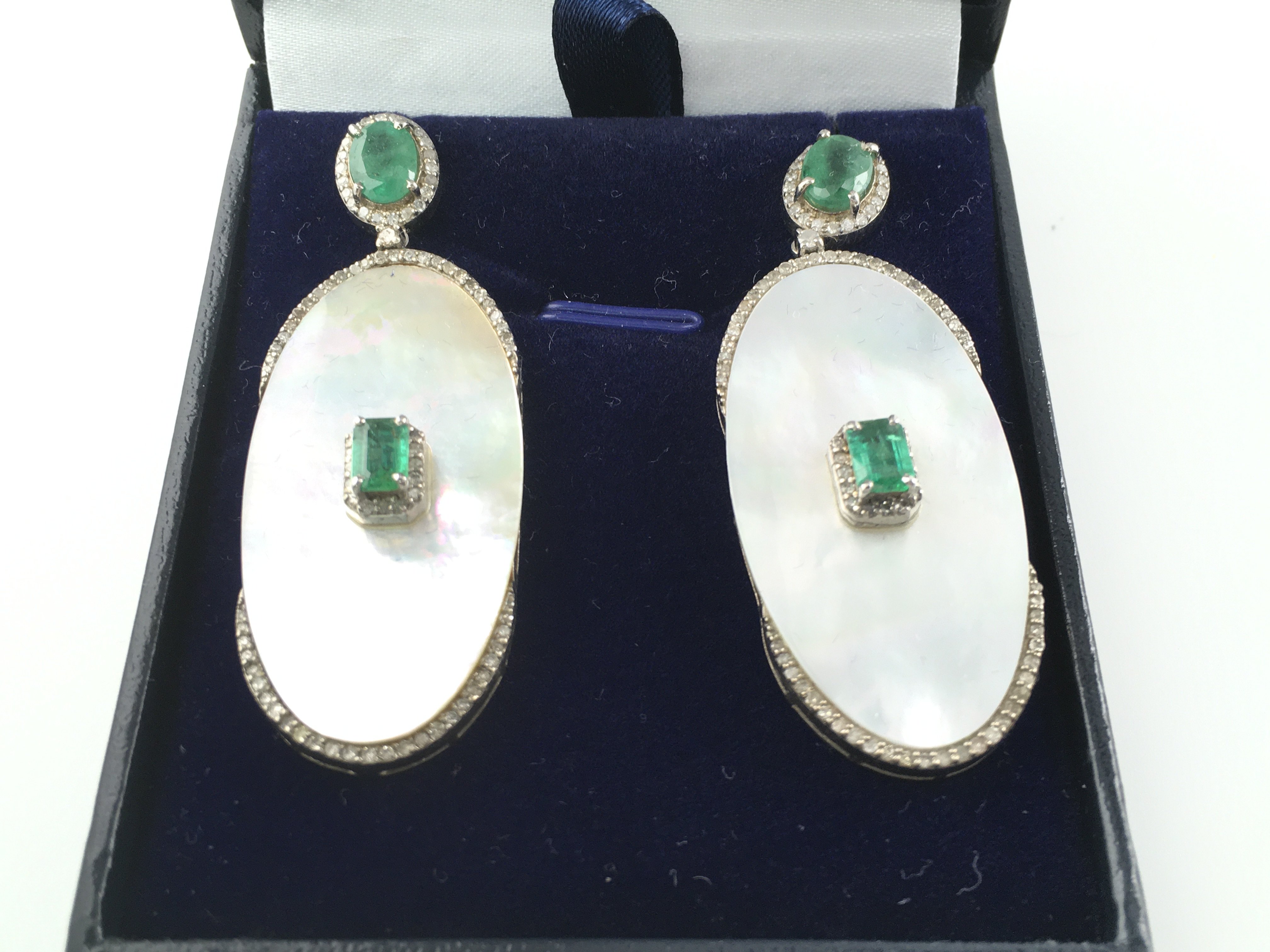 Pair of silver large drop earrings set with mother of pearl emeralds and diamonds. Mother of pearl 21.75ct emeralds 2.74ct and diamond 0.69ct.