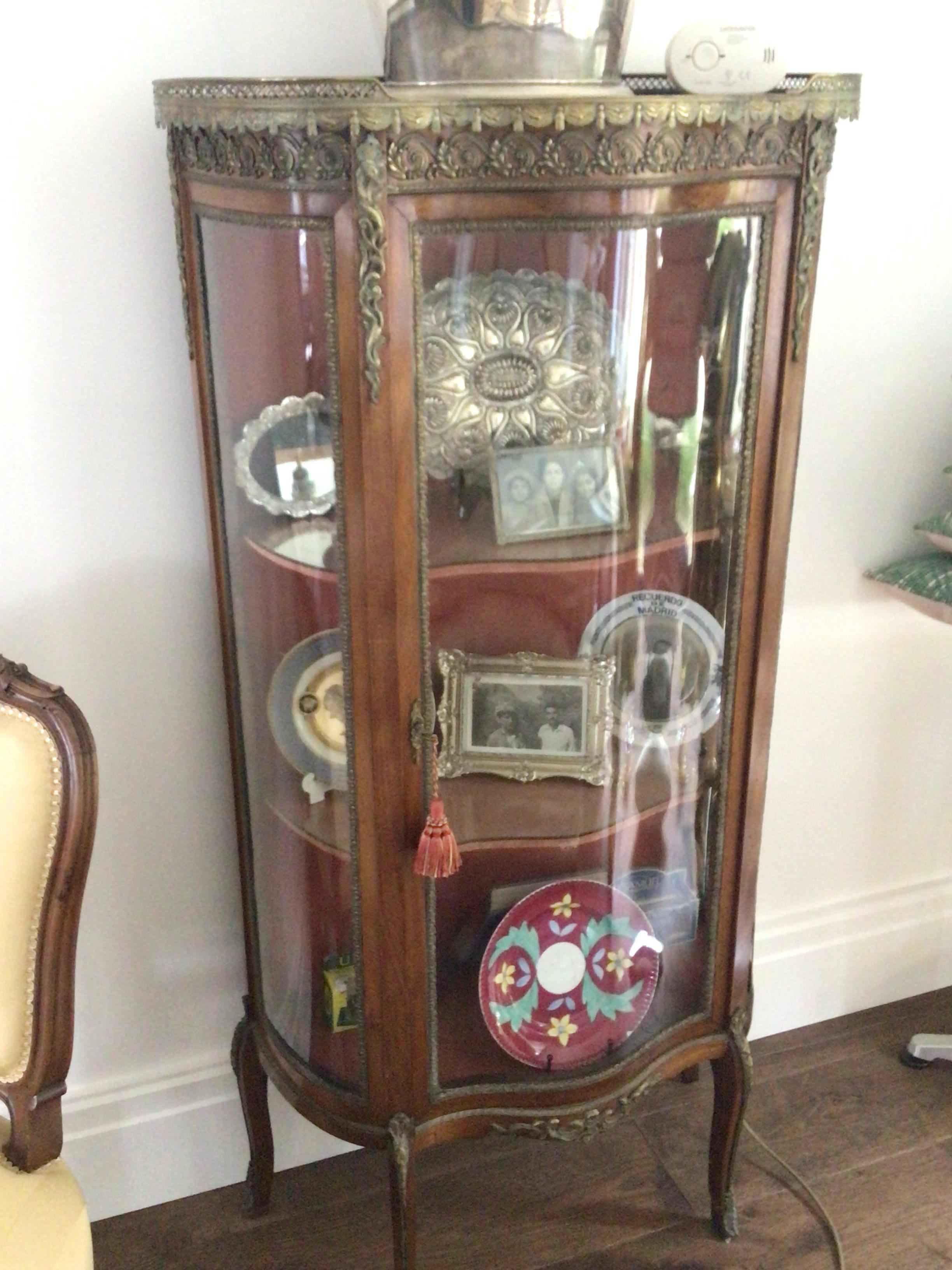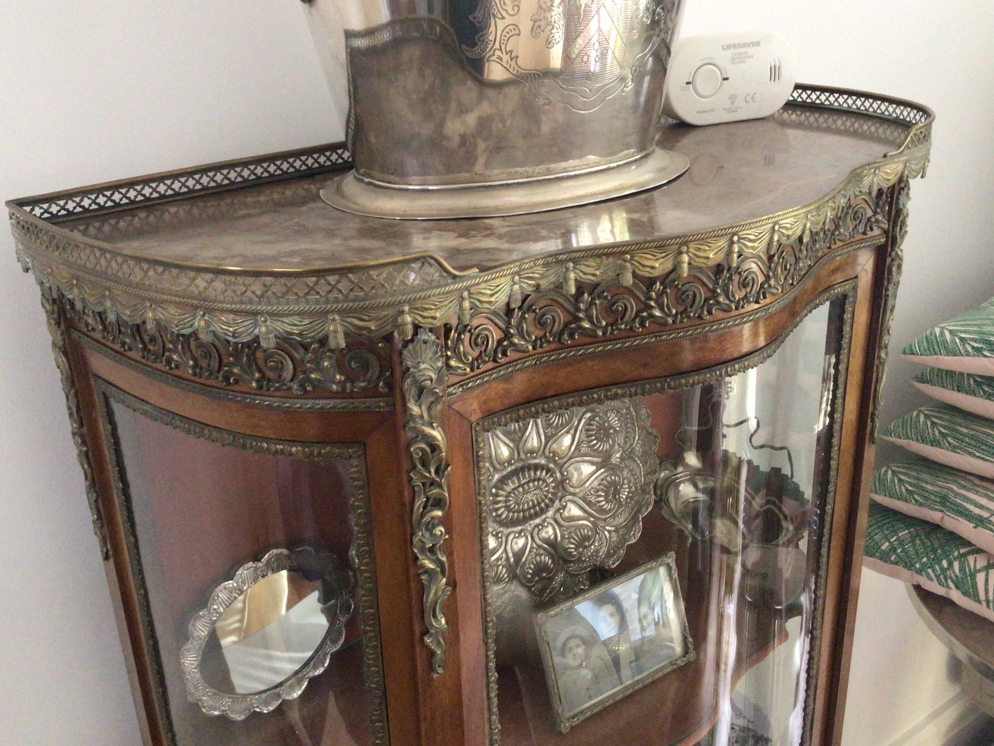 A French late 19th century walnut display cabinet with gilt metal mounts and serpentine glass door enclosing shelves.