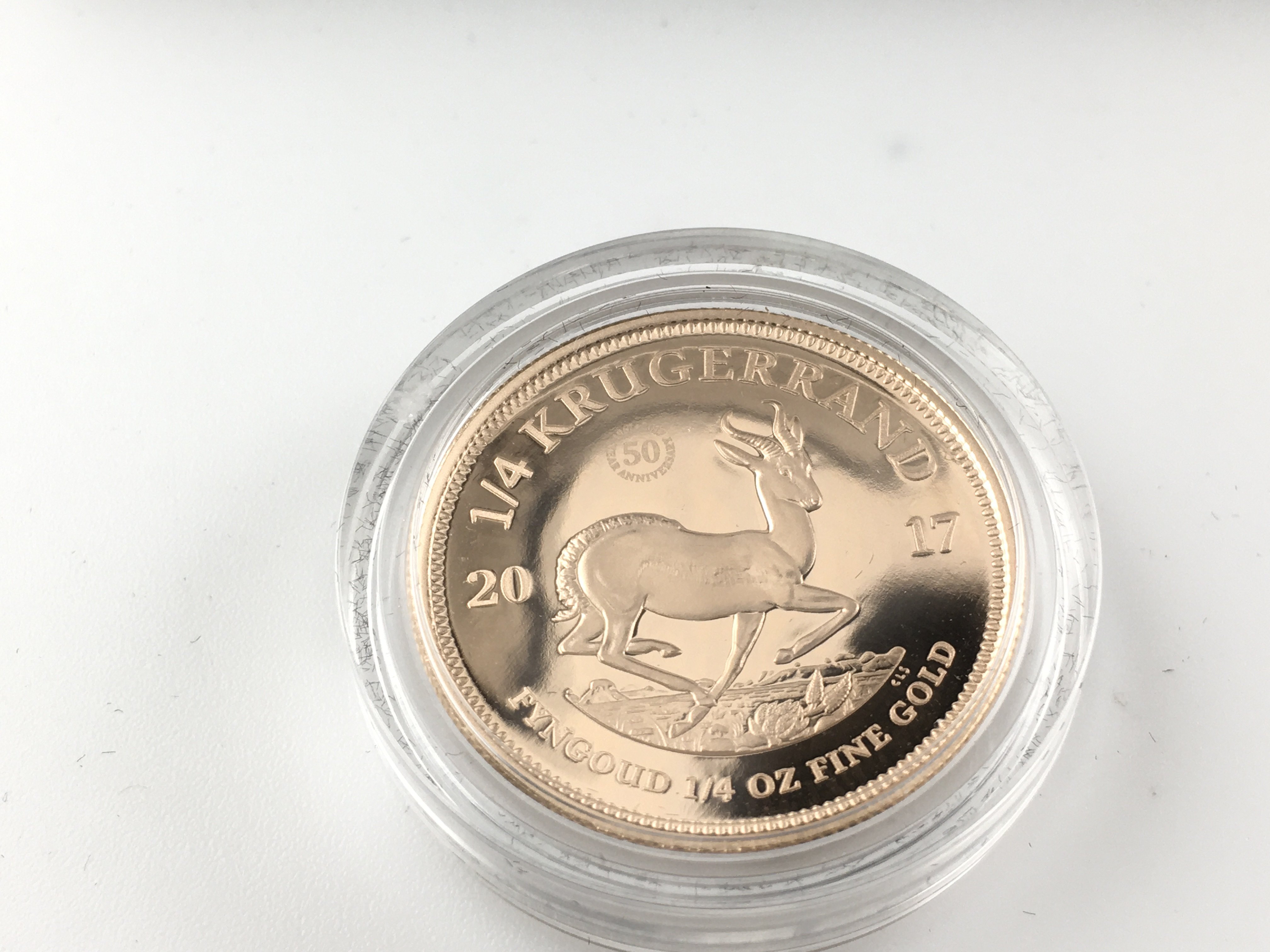 A 2017 50th anniversary 1/4 oz gold proof Krugerrand. Postage B