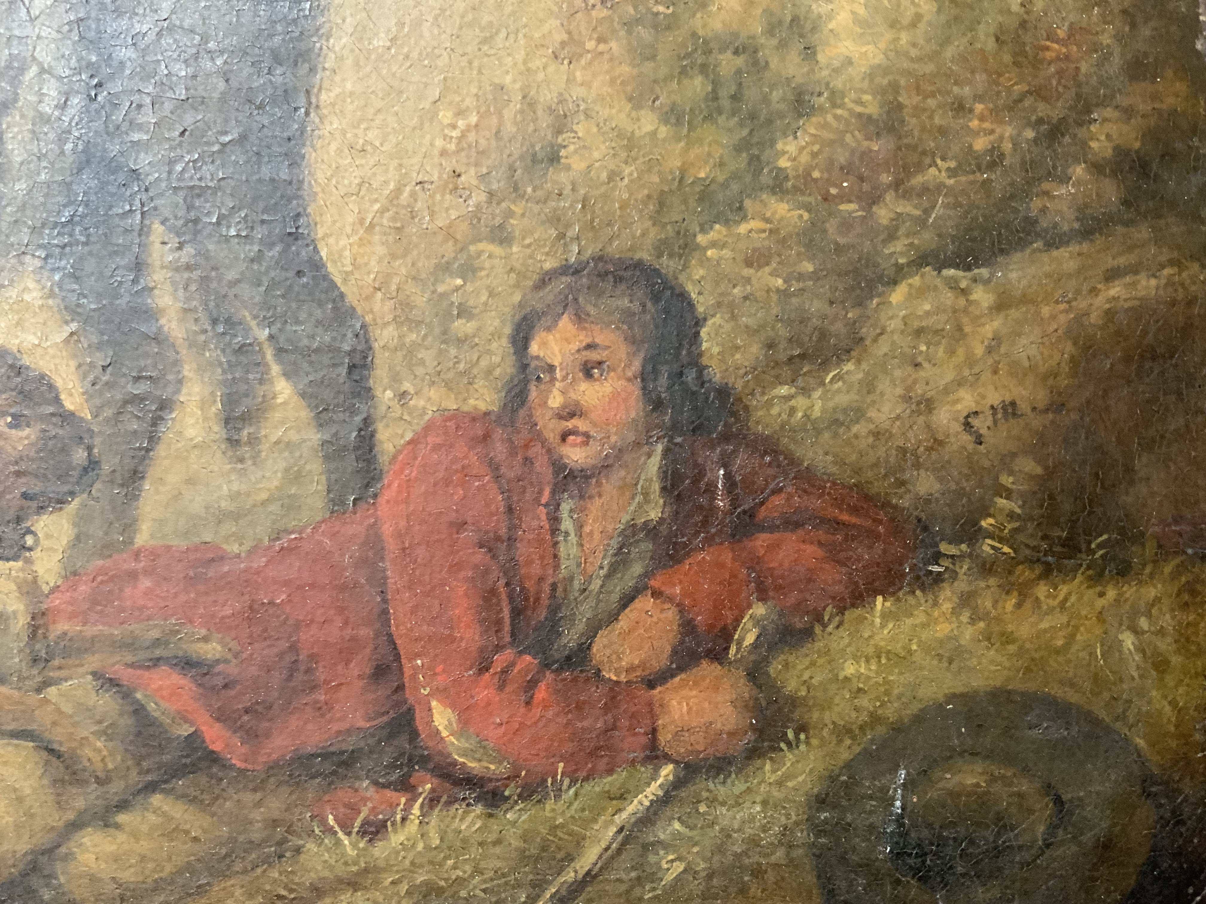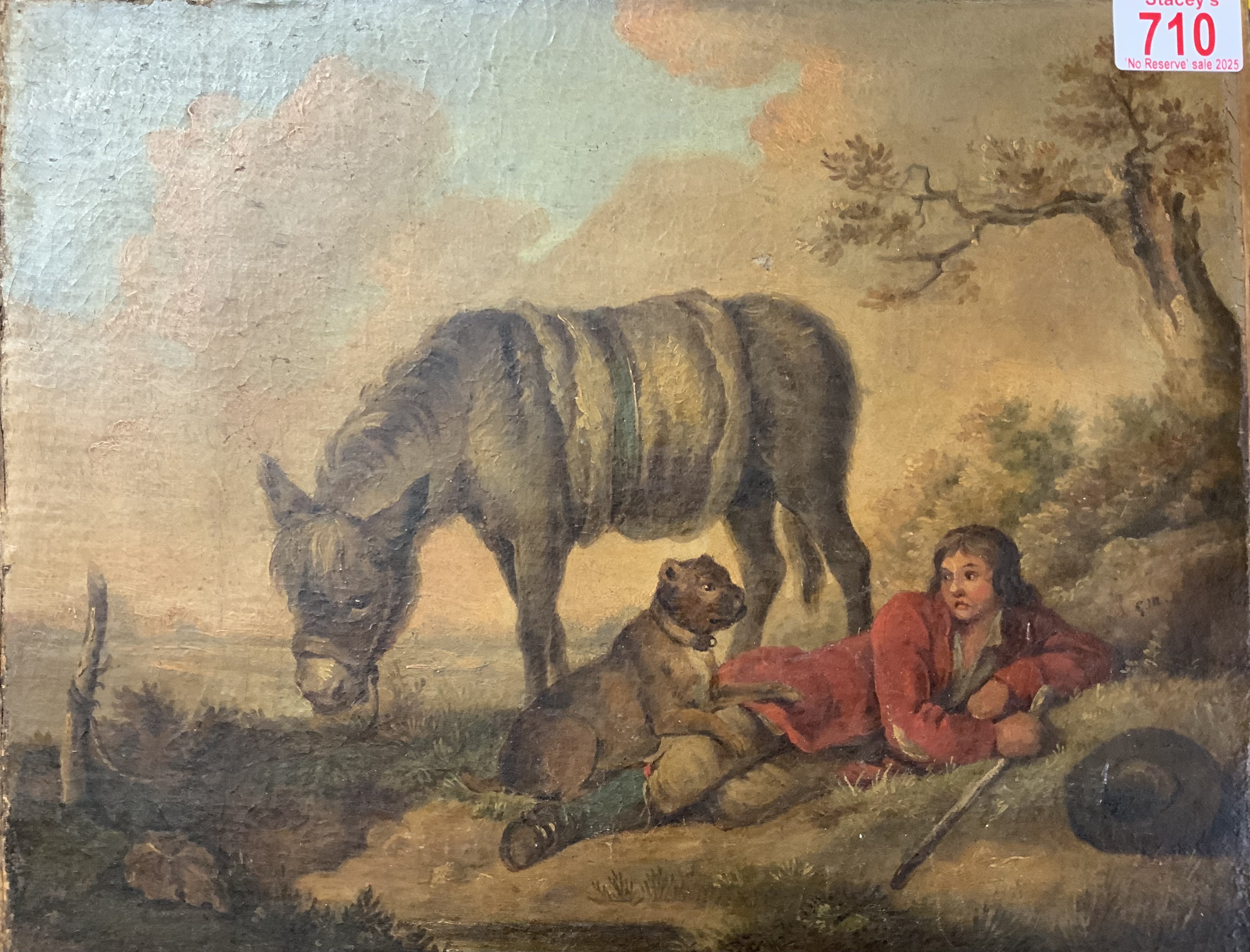 Attributed to George Morland (British, 1763-1804), saddled Donkey in a rural landscape, oil on canvas , unframed, 36cm x 28cm re-lined ,monogrammed initial G.M