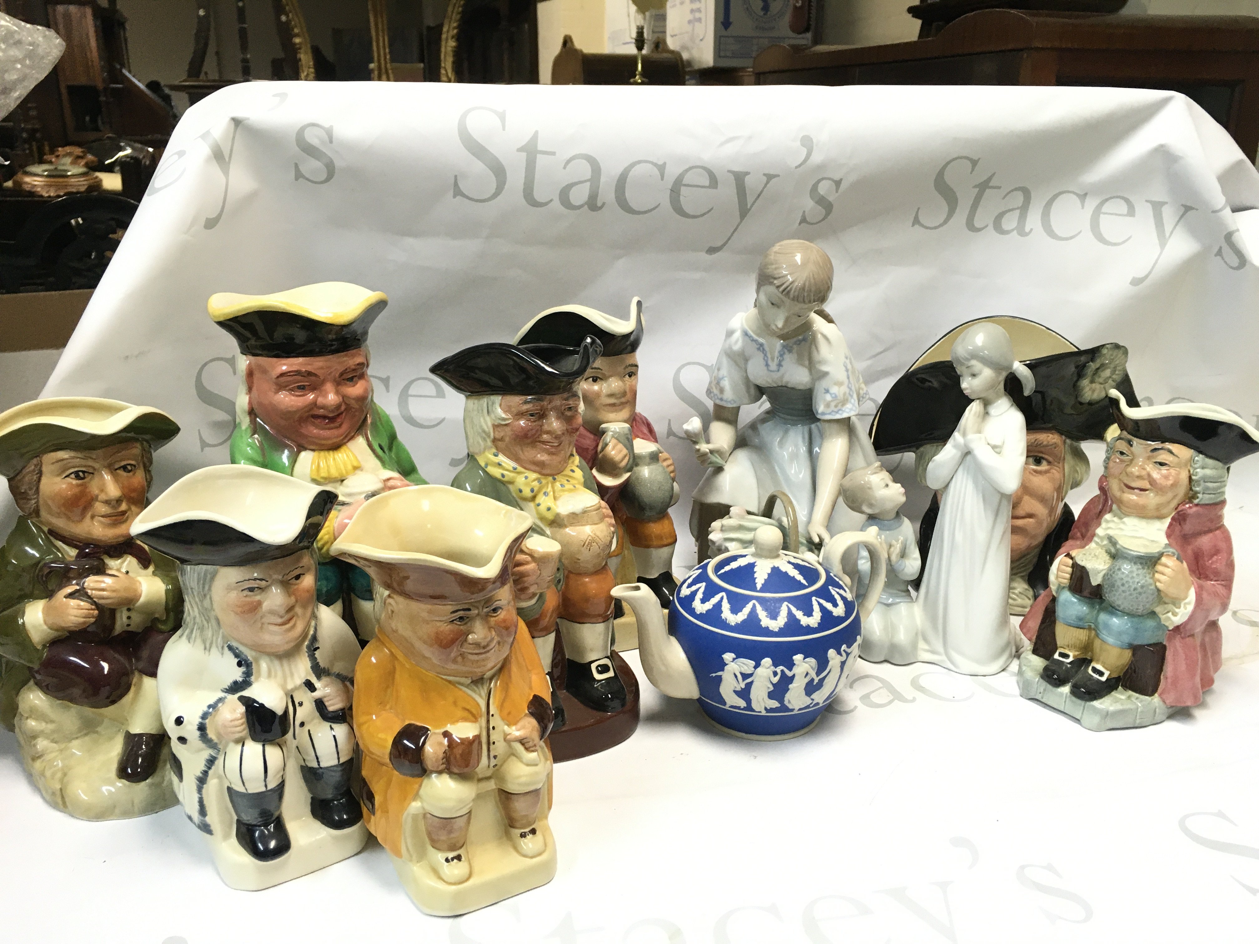 A Collection of ceramics including Toby jugs, Lladro figures, Wedgwood small tea jug, Doulton George Washington character jug