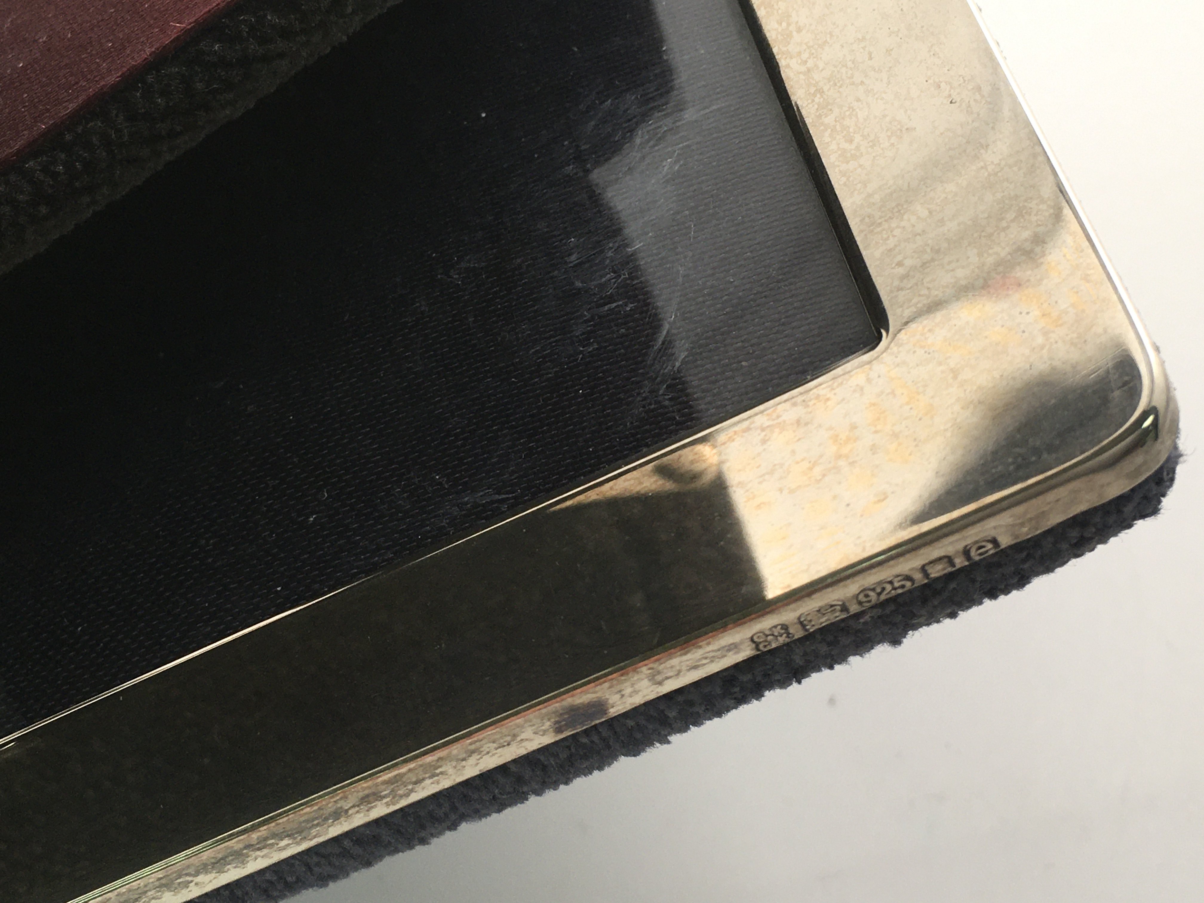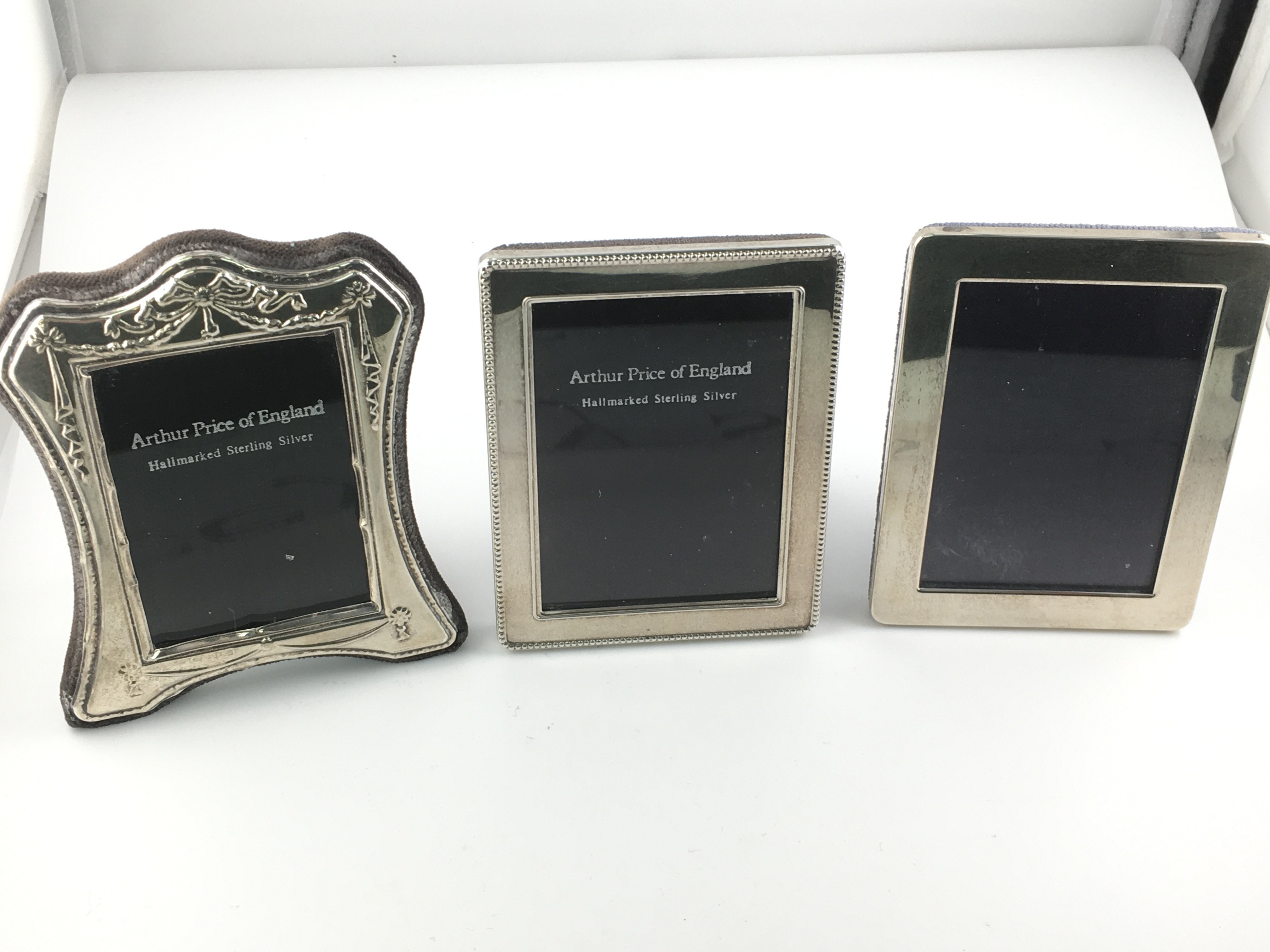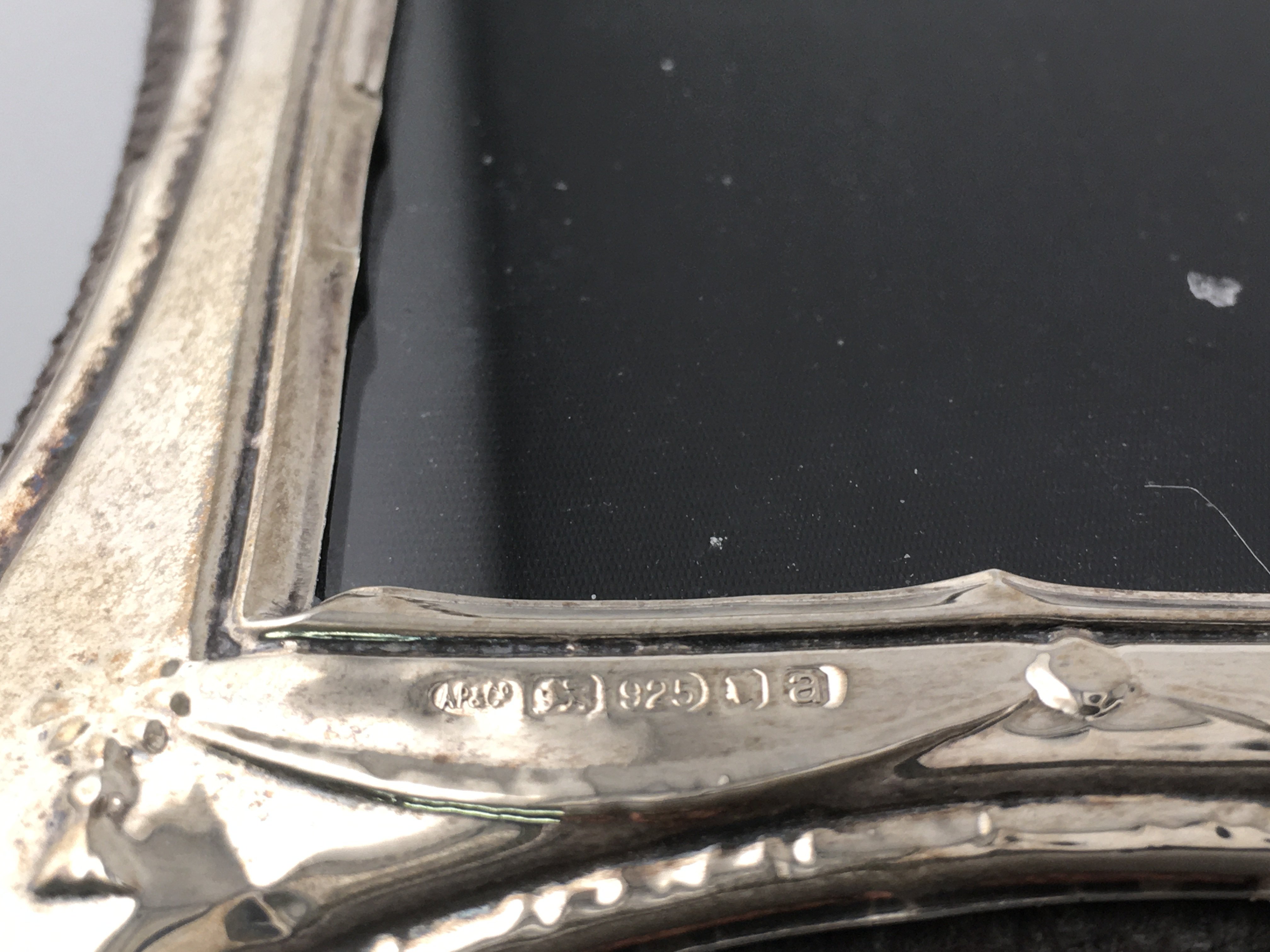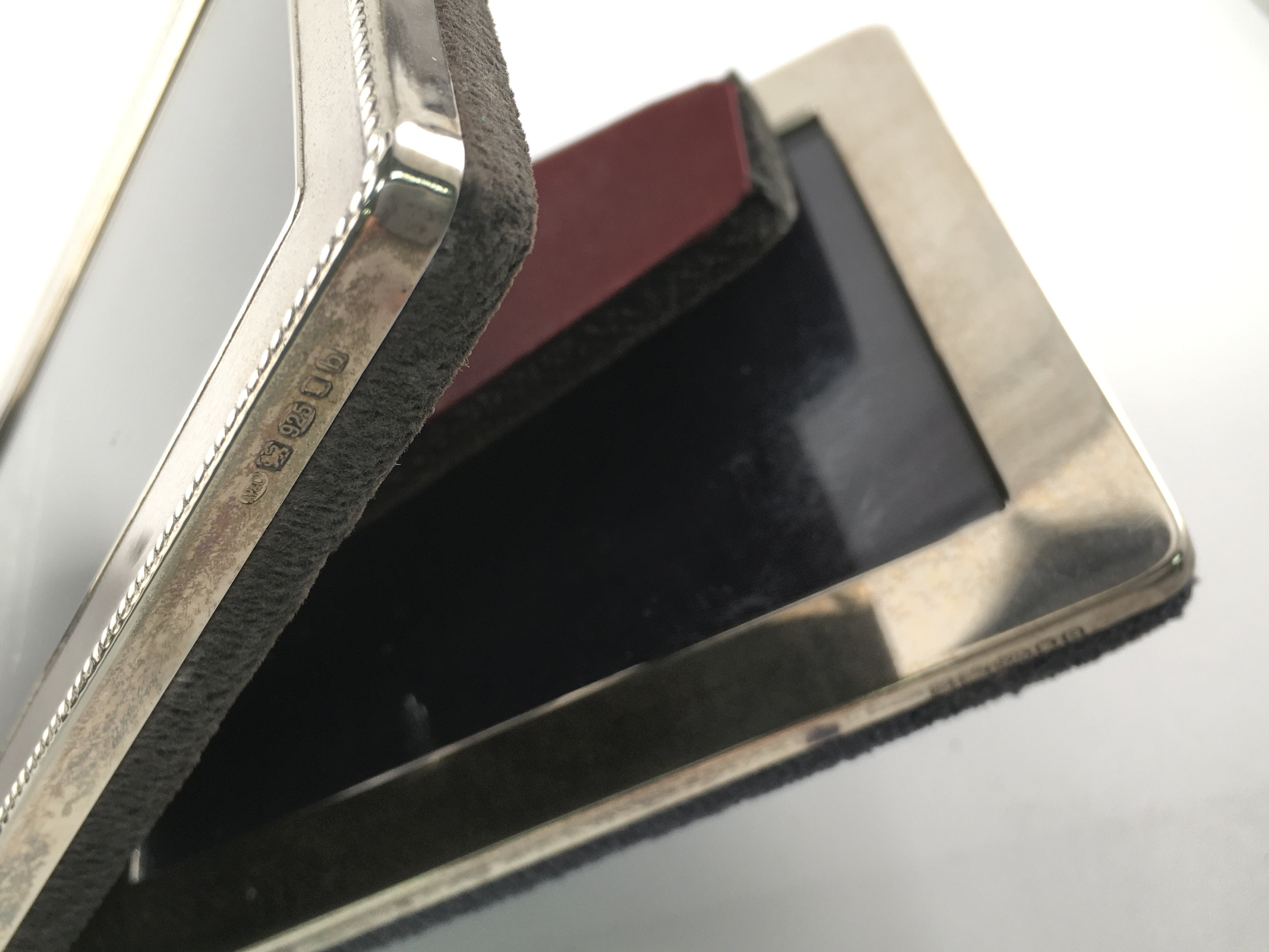 Three hallmarked silver photo frames. Approximately 8cm by 11cm.