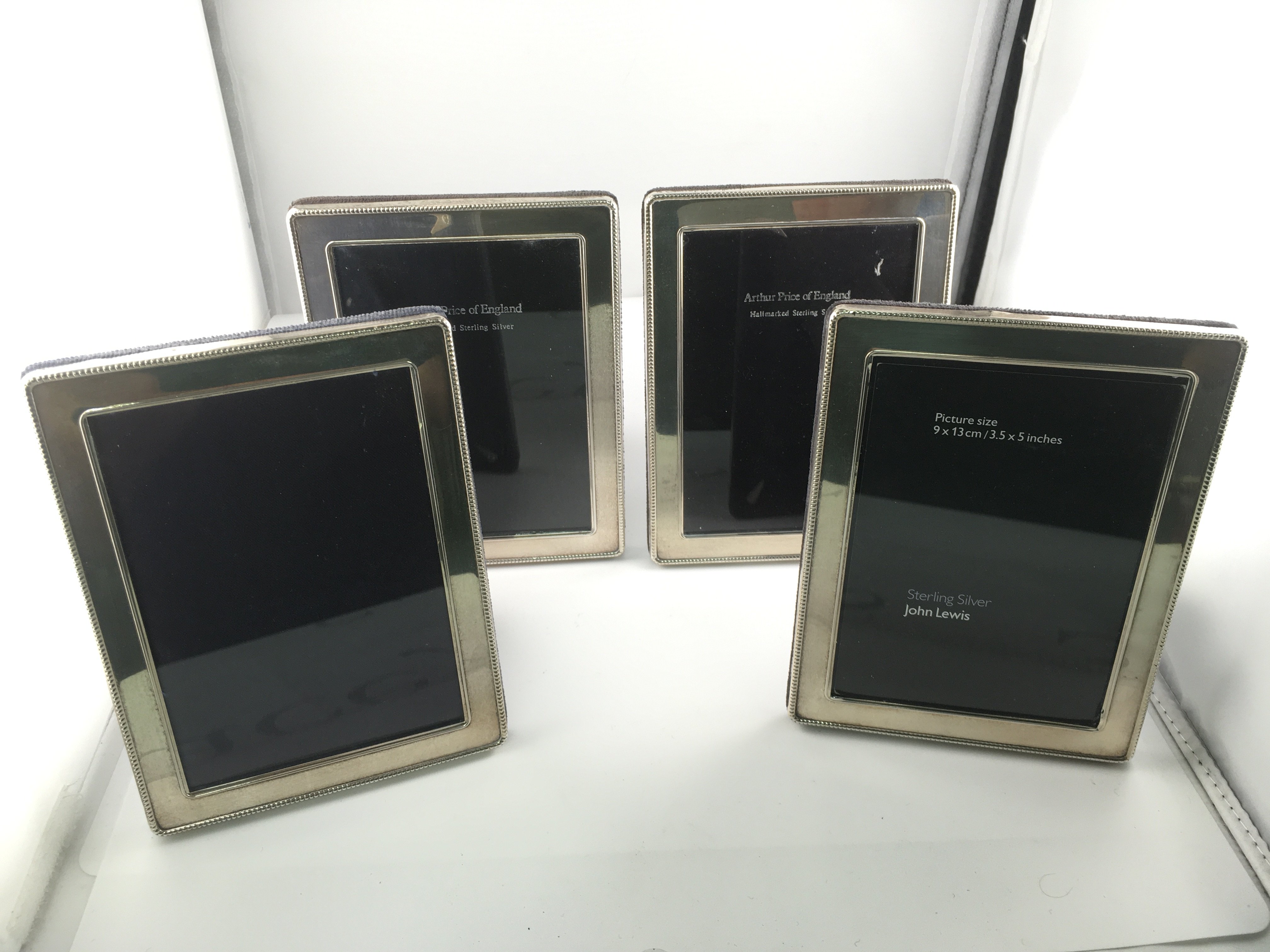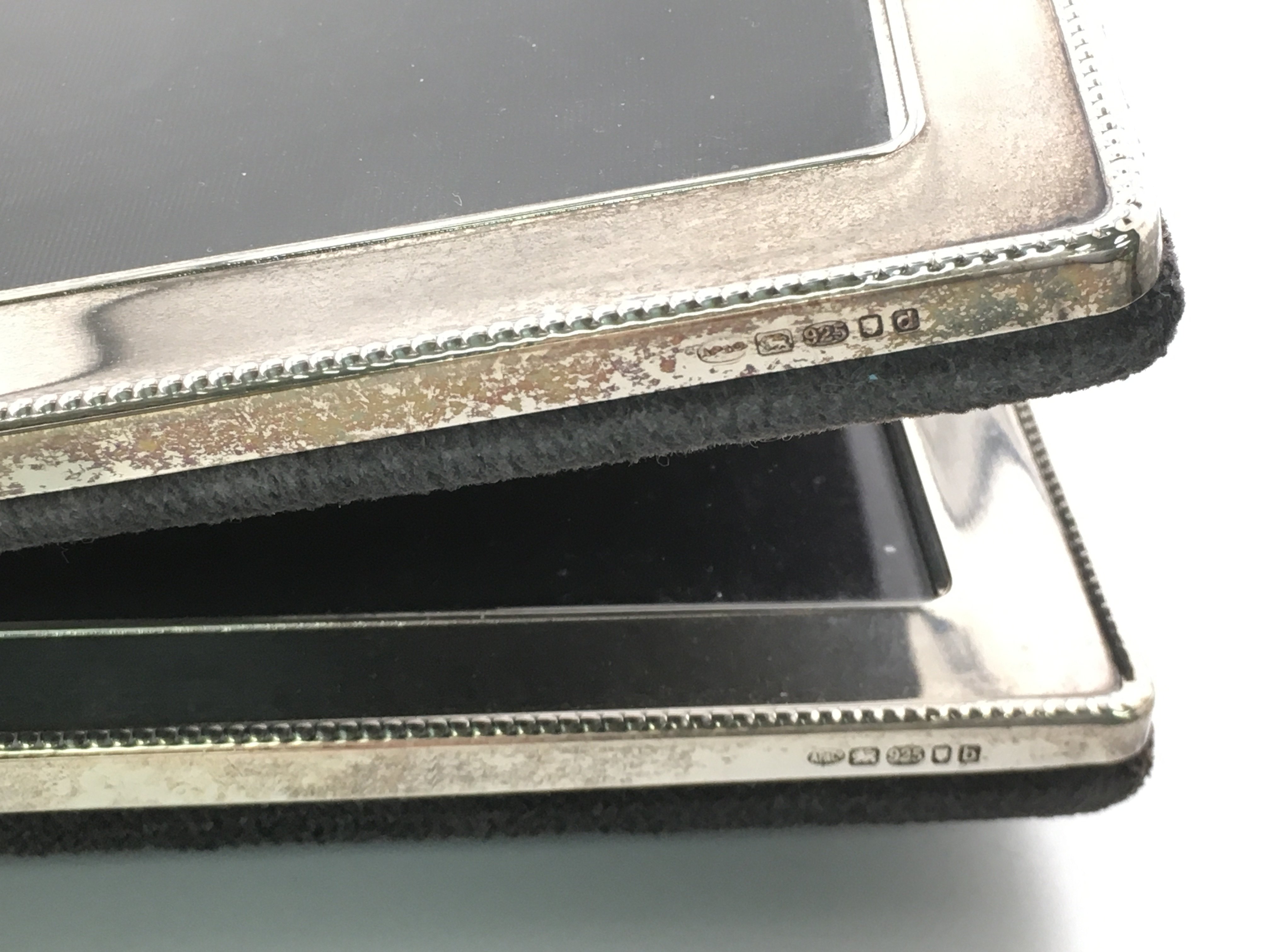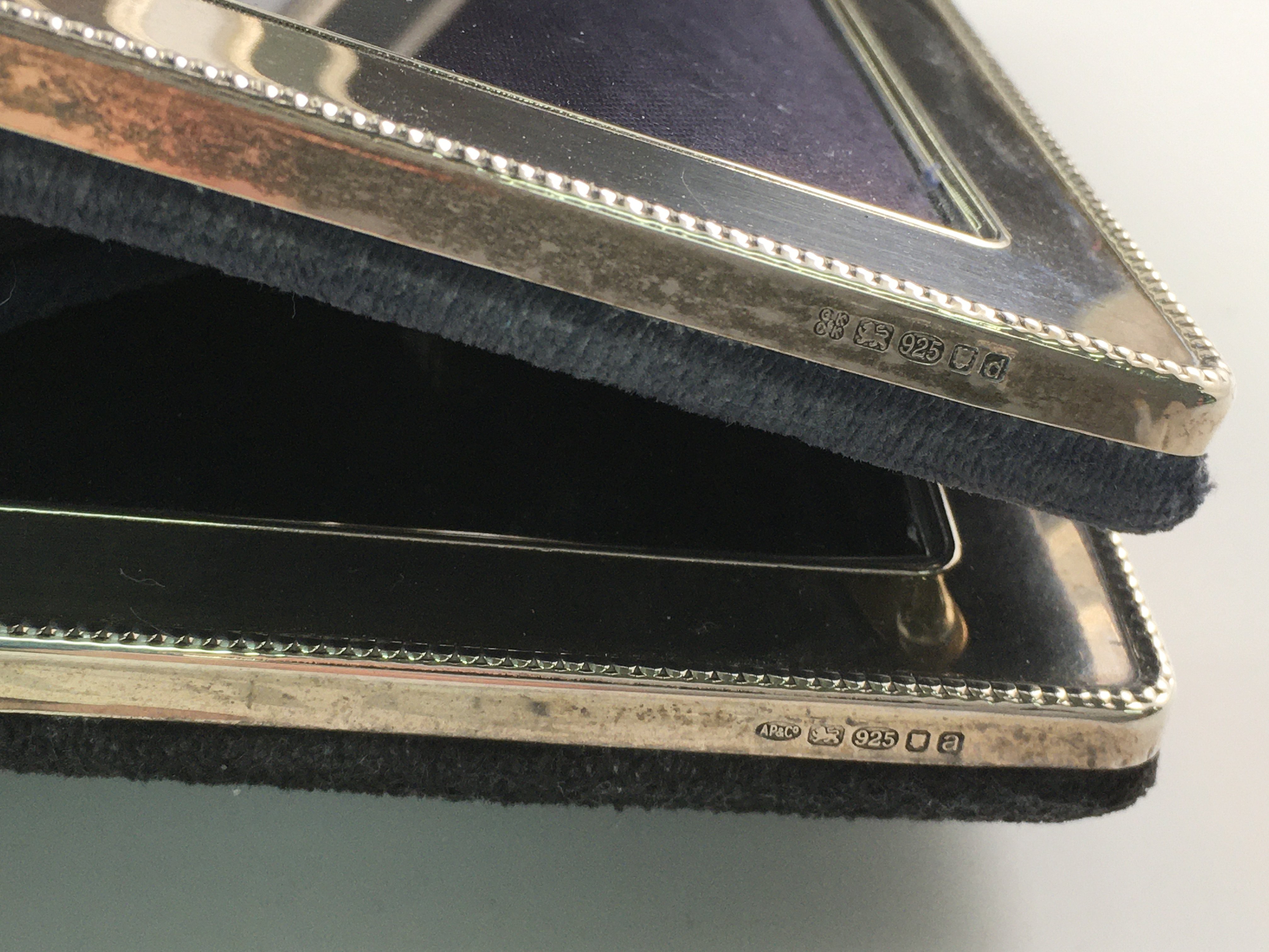 Four silver hallmarked photo frames. Approximately 12cm by 16cm.