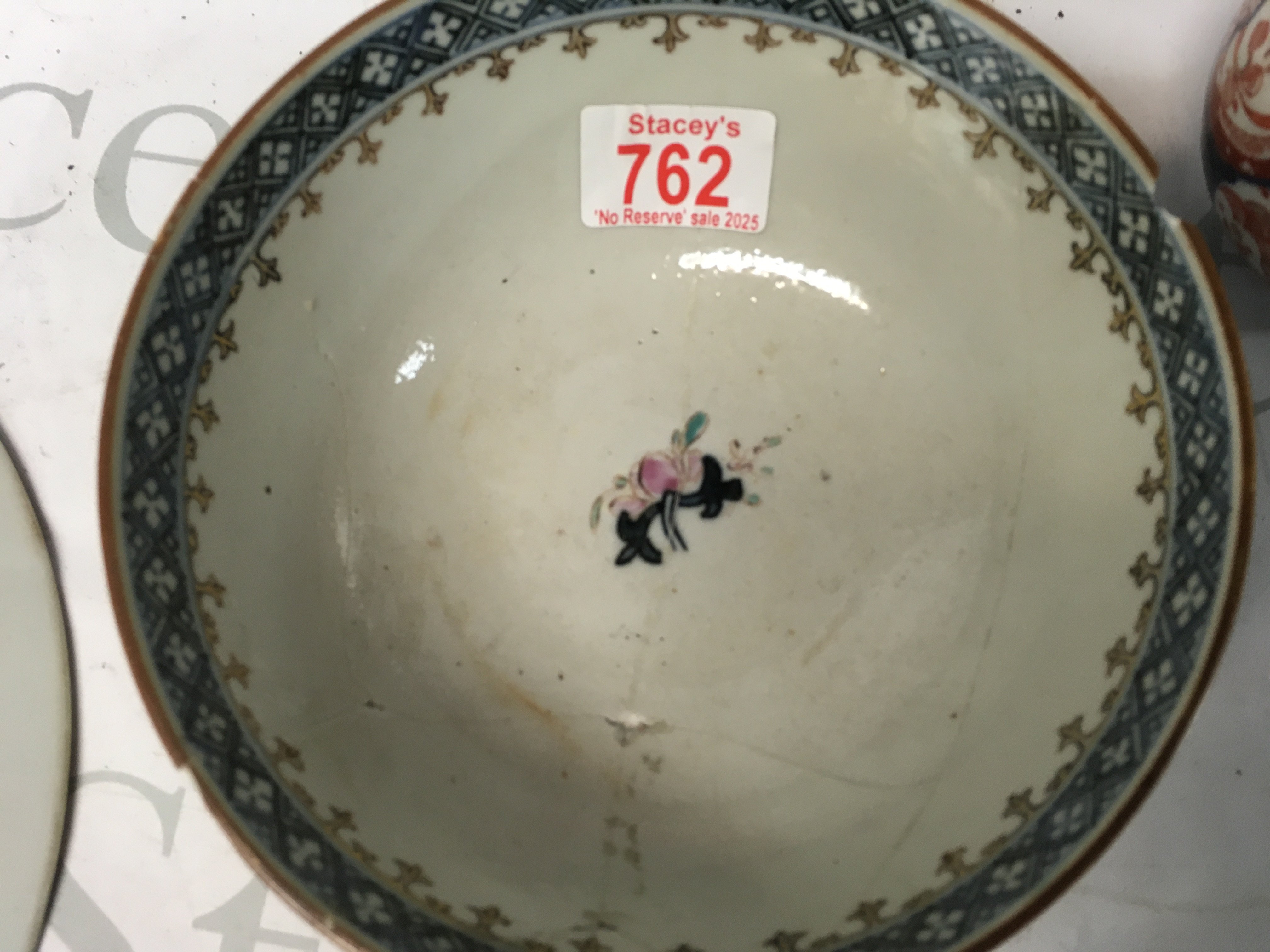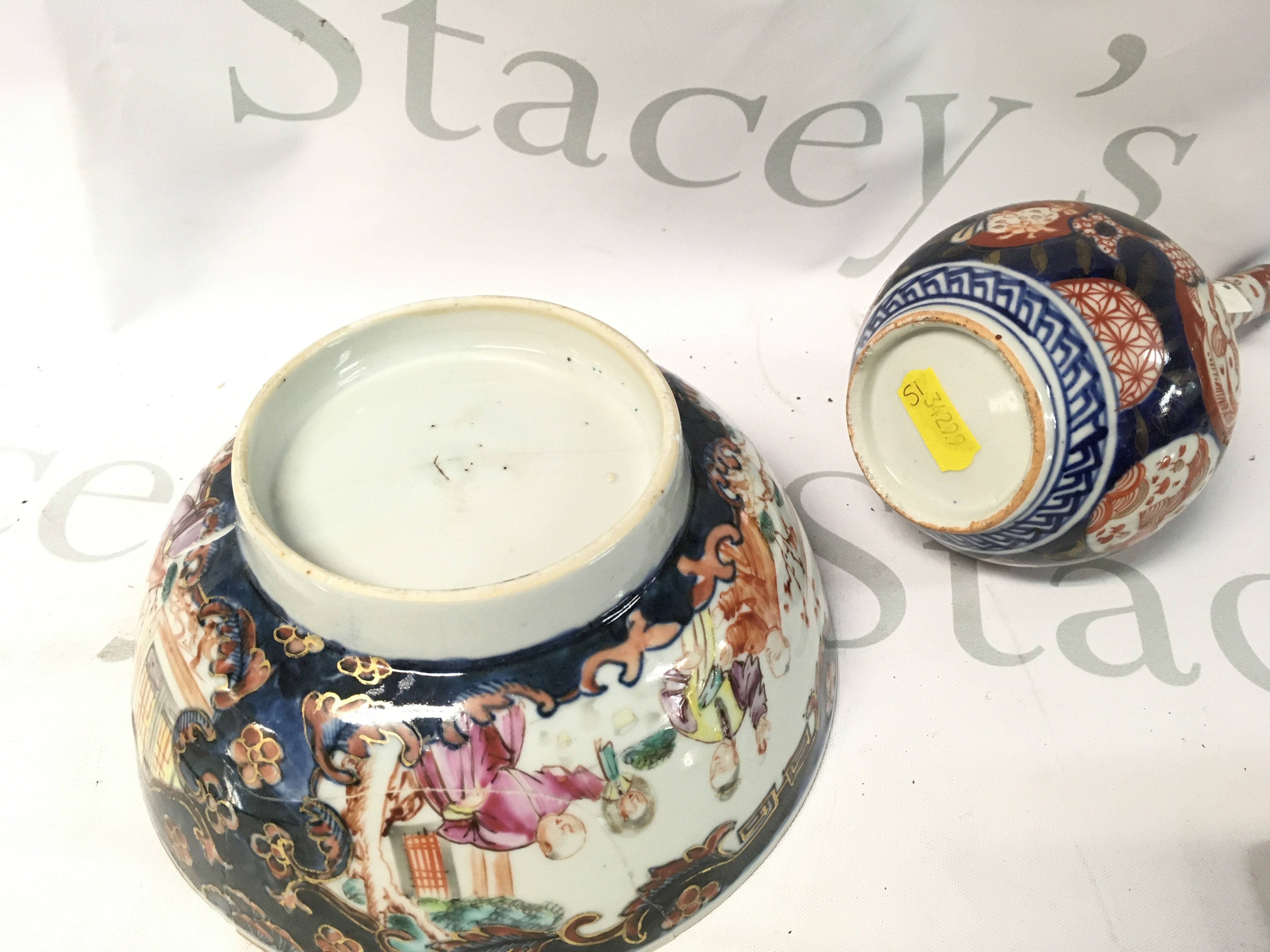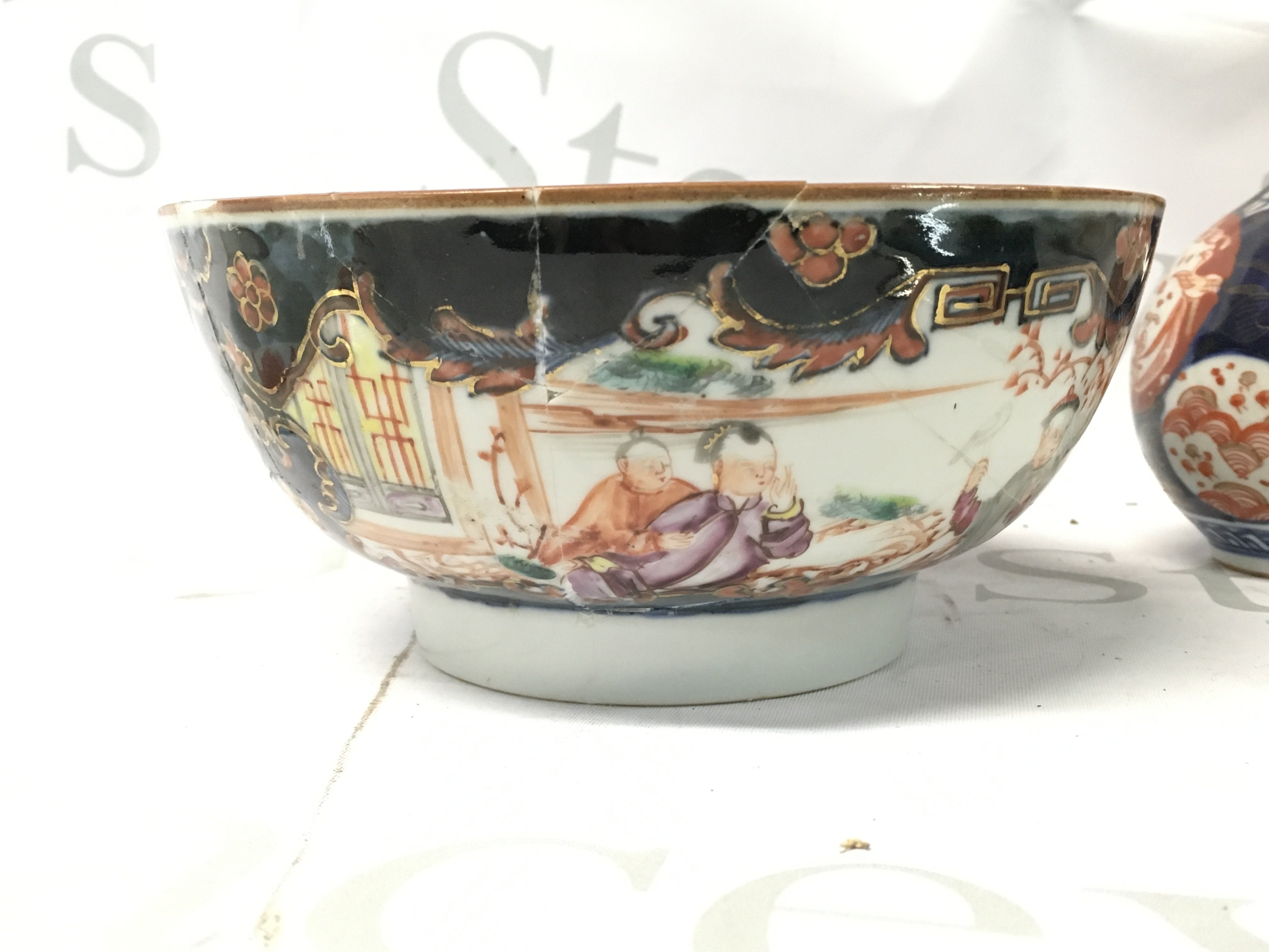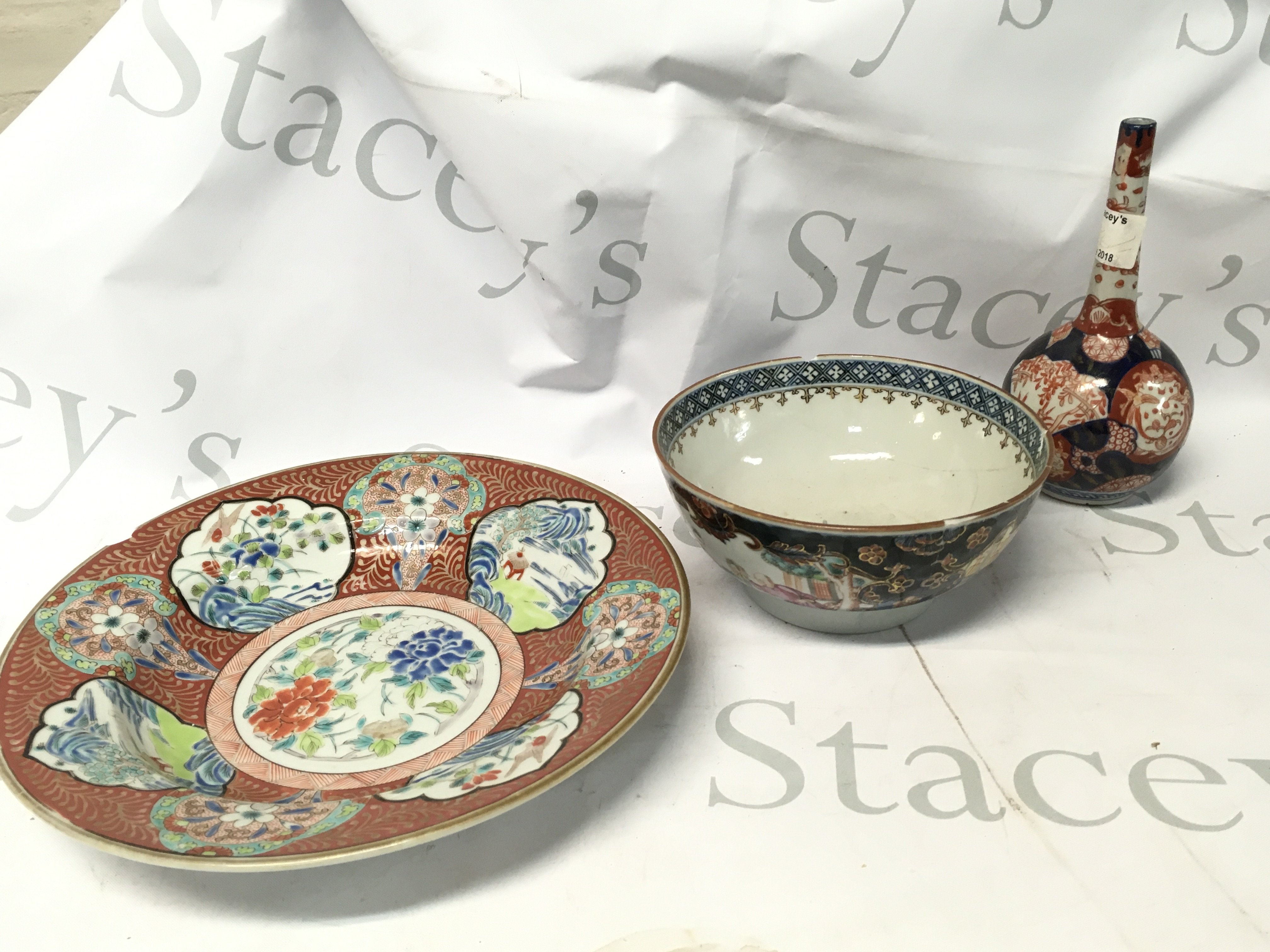 A Collection of Japanese ceramics including an Imari slim neck vase , Imari dish decorated with figures ( damaged and restored with large hairline cracks) and a Kutani dish