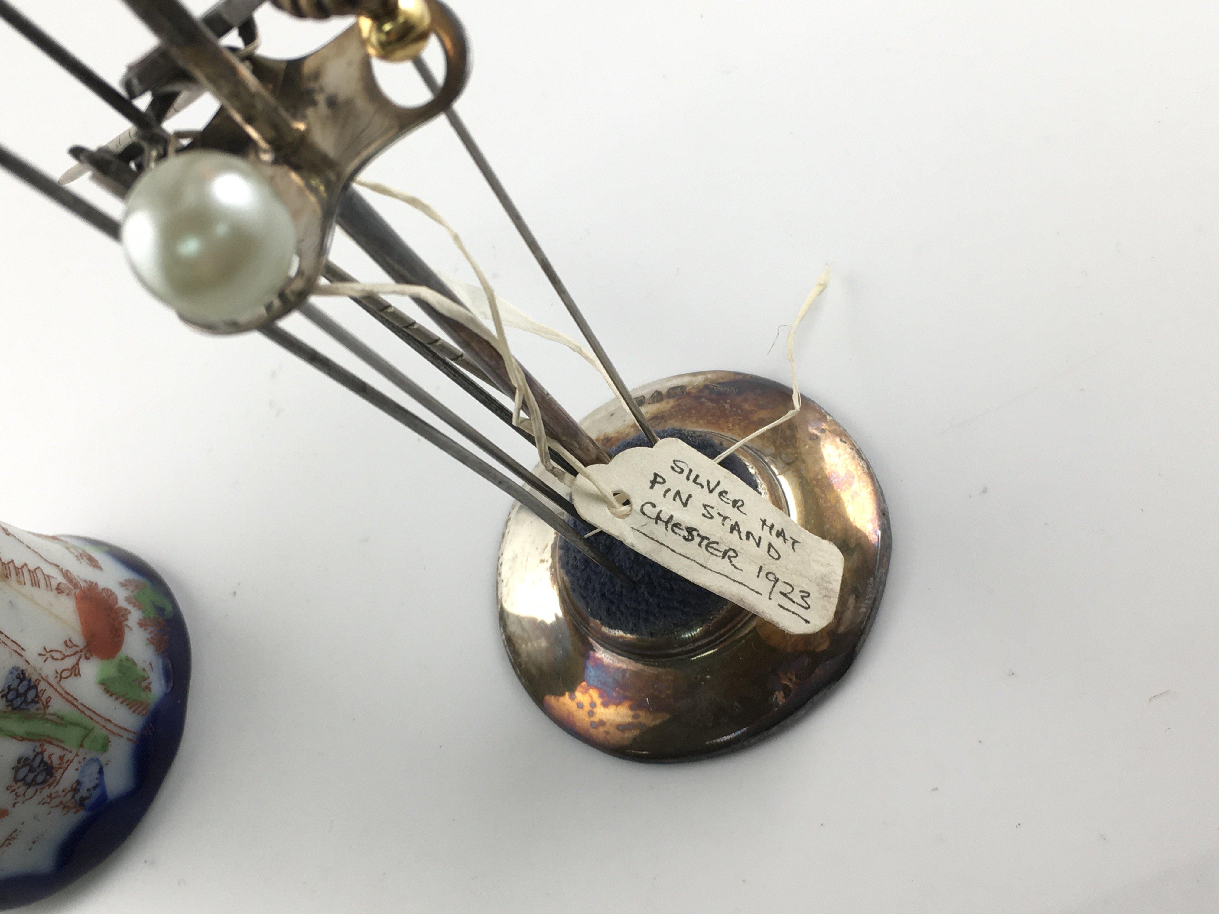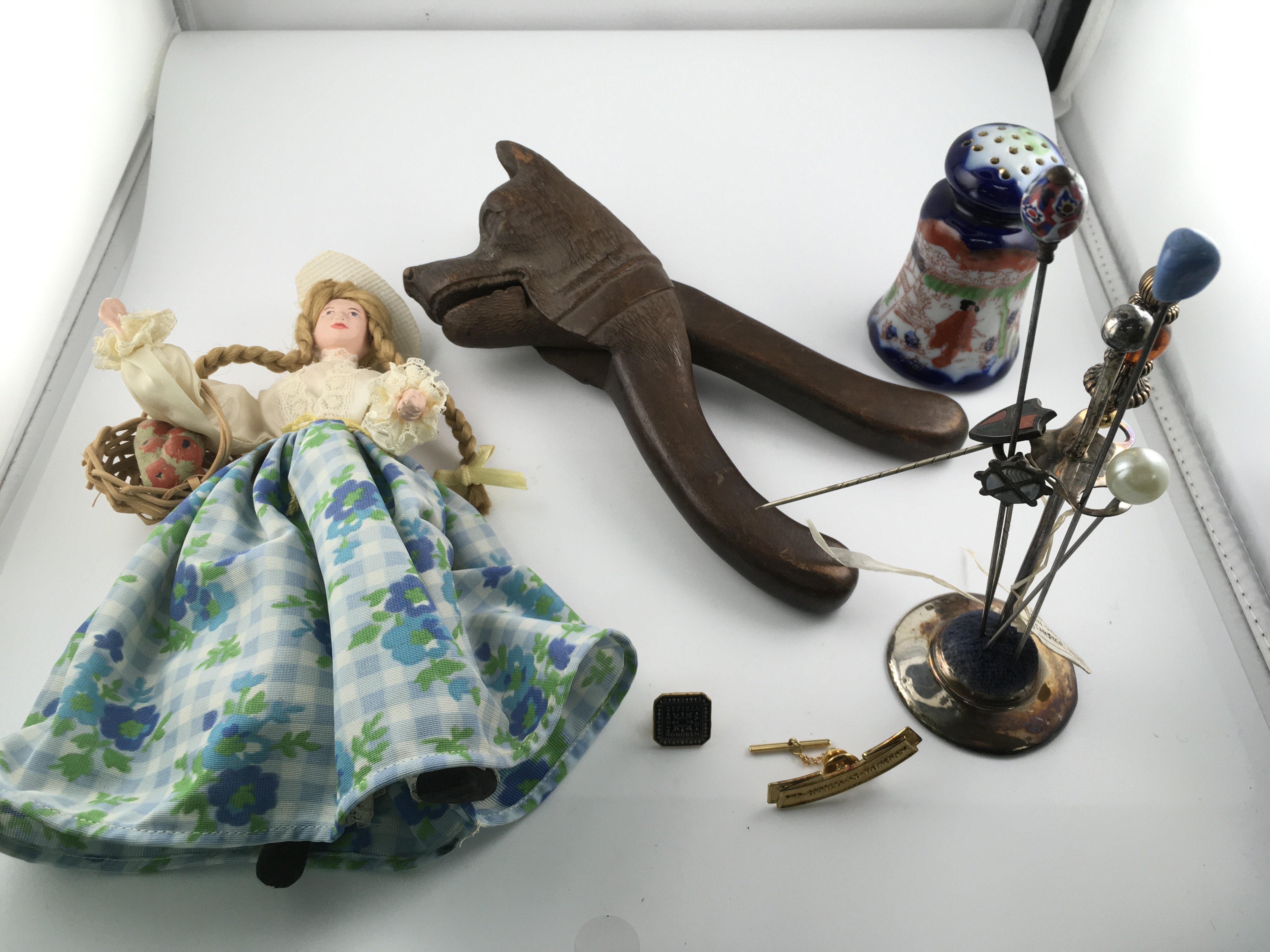 An assorted lot including silver hat pin stands and several hat pins vintage nut cracker dolls etc. Postage B