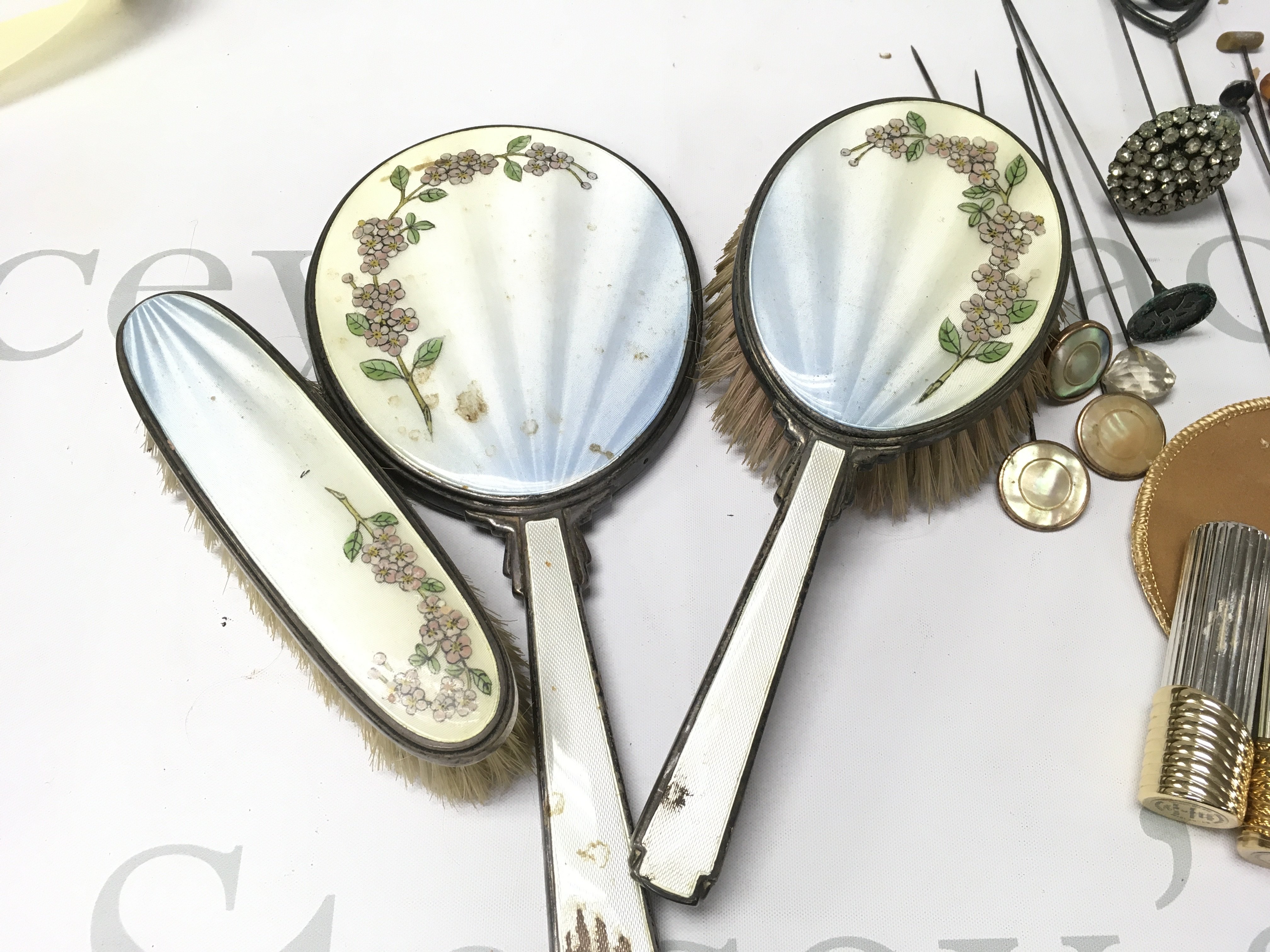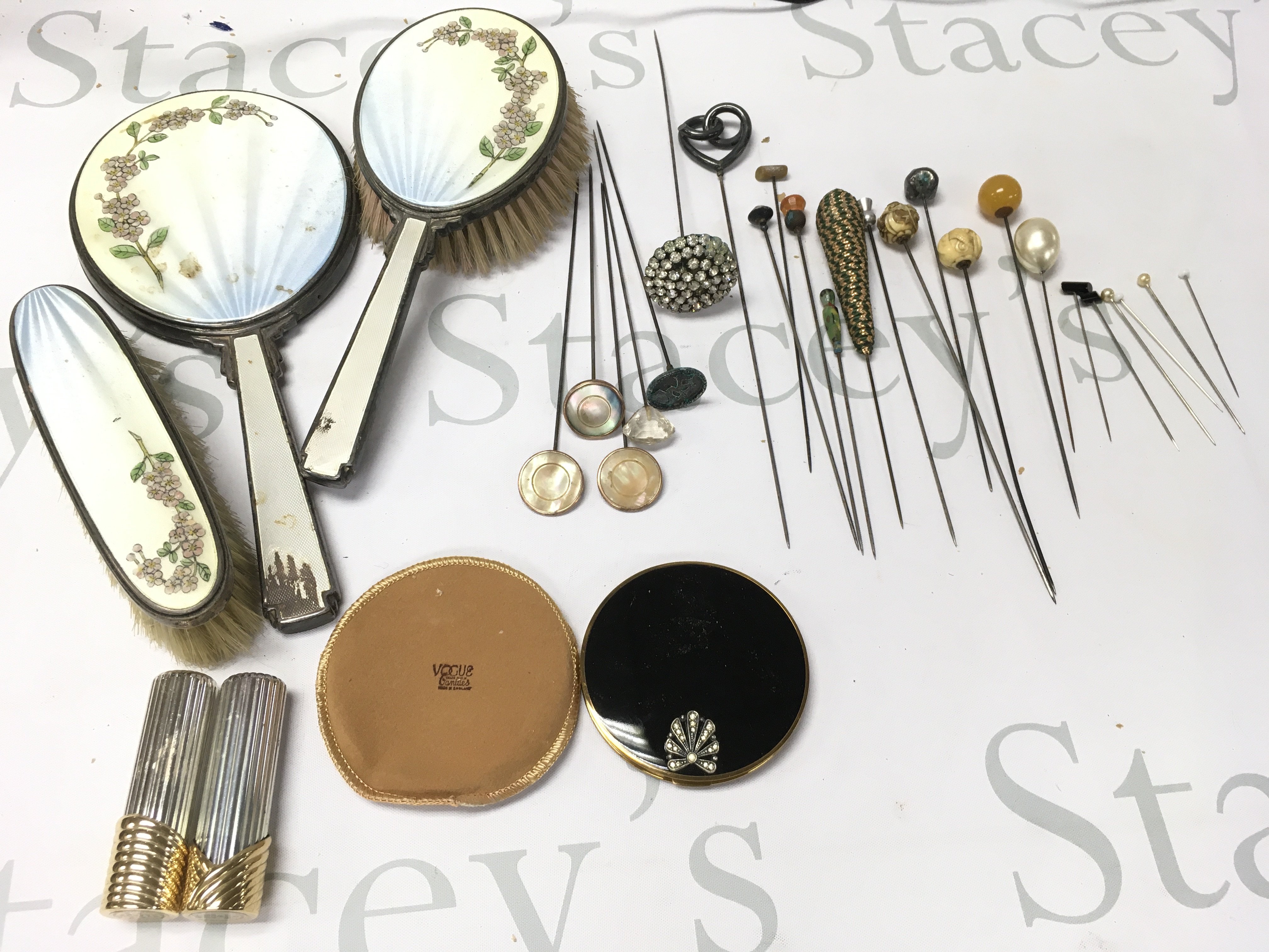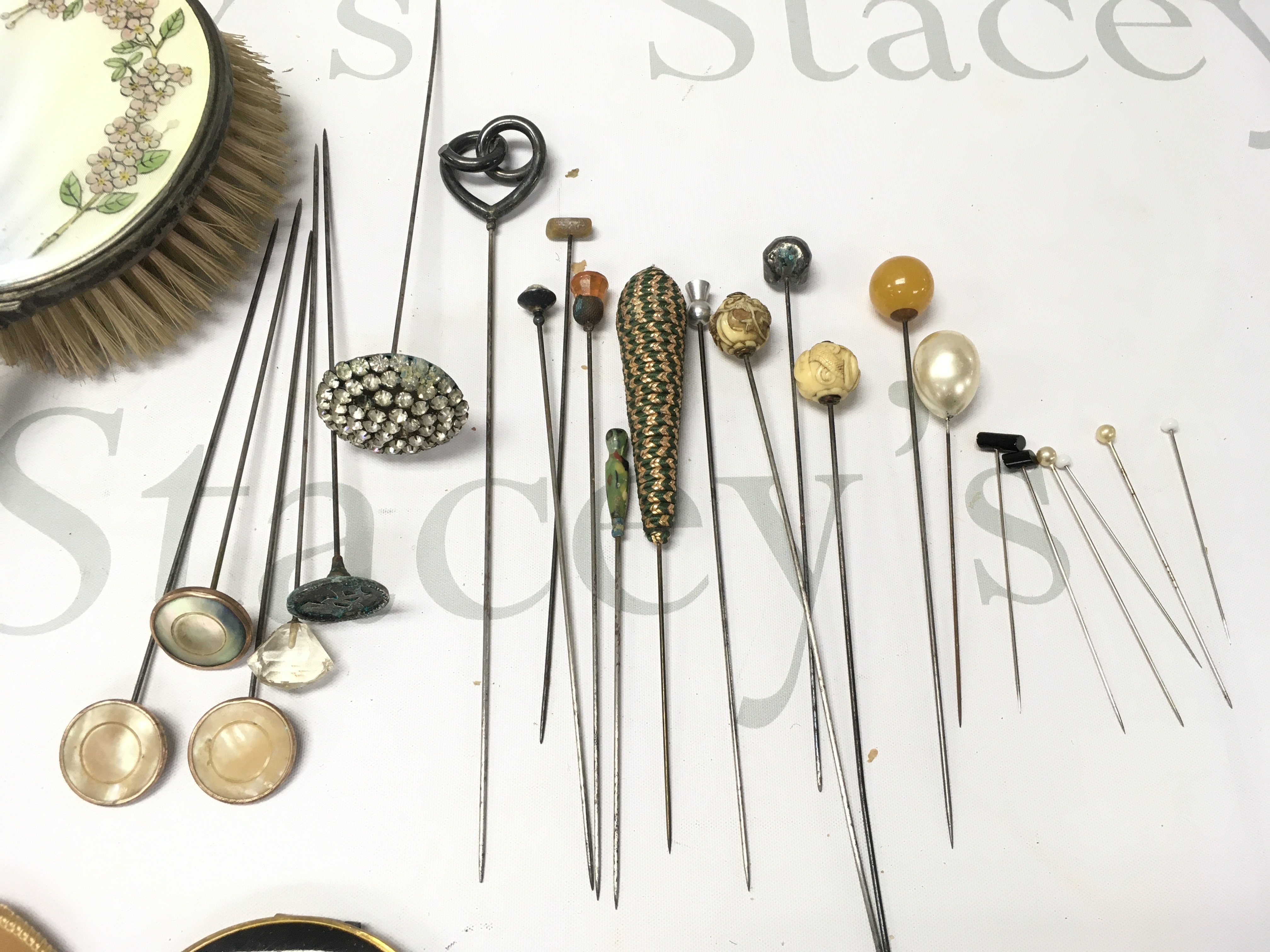 A dressing table set and several hat pins including a Charles Horner etc. Postage B