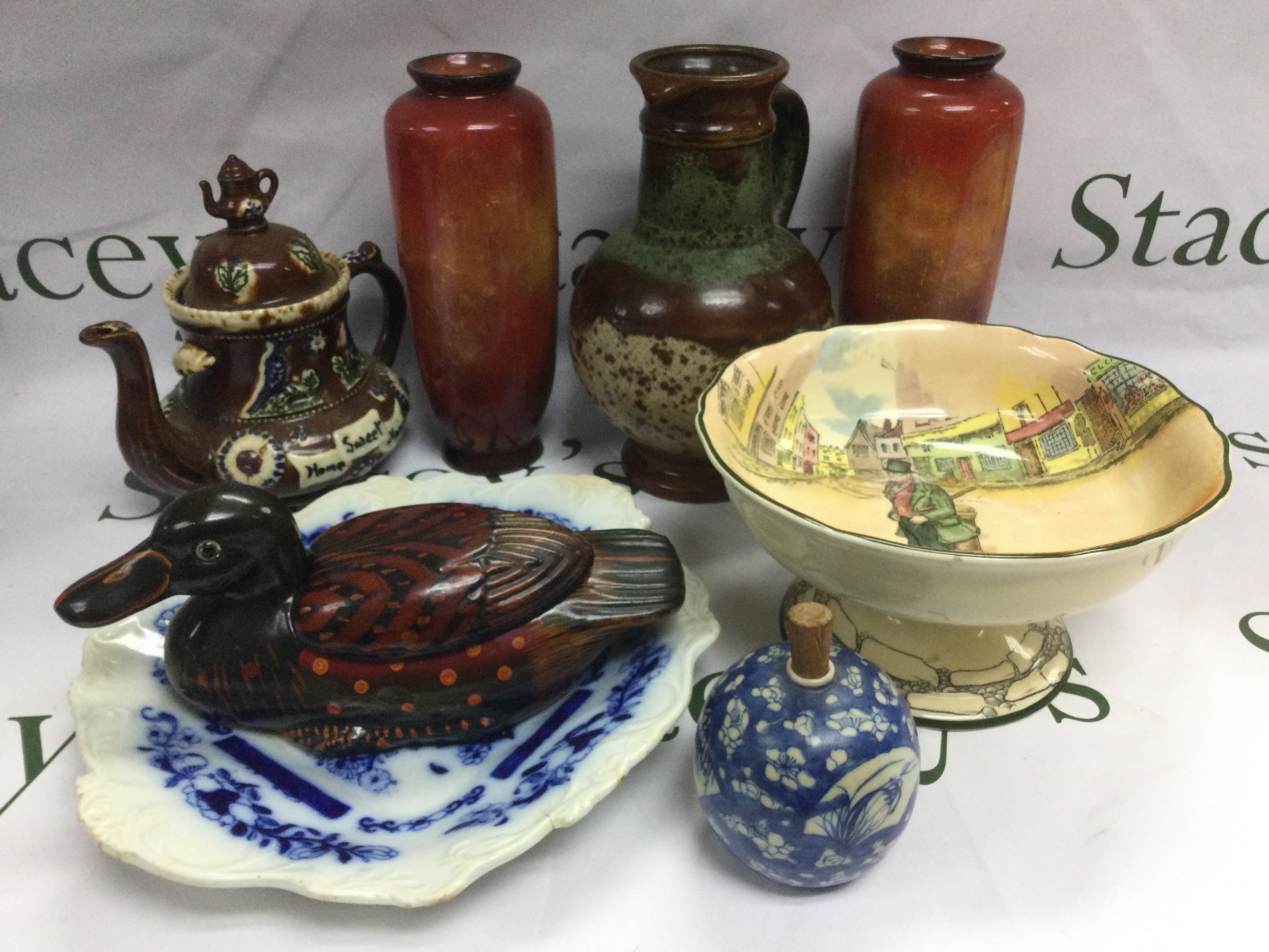 A box of ceramics including a Royal Doulton comport, bargeware teapot and other items. Shipping category D.