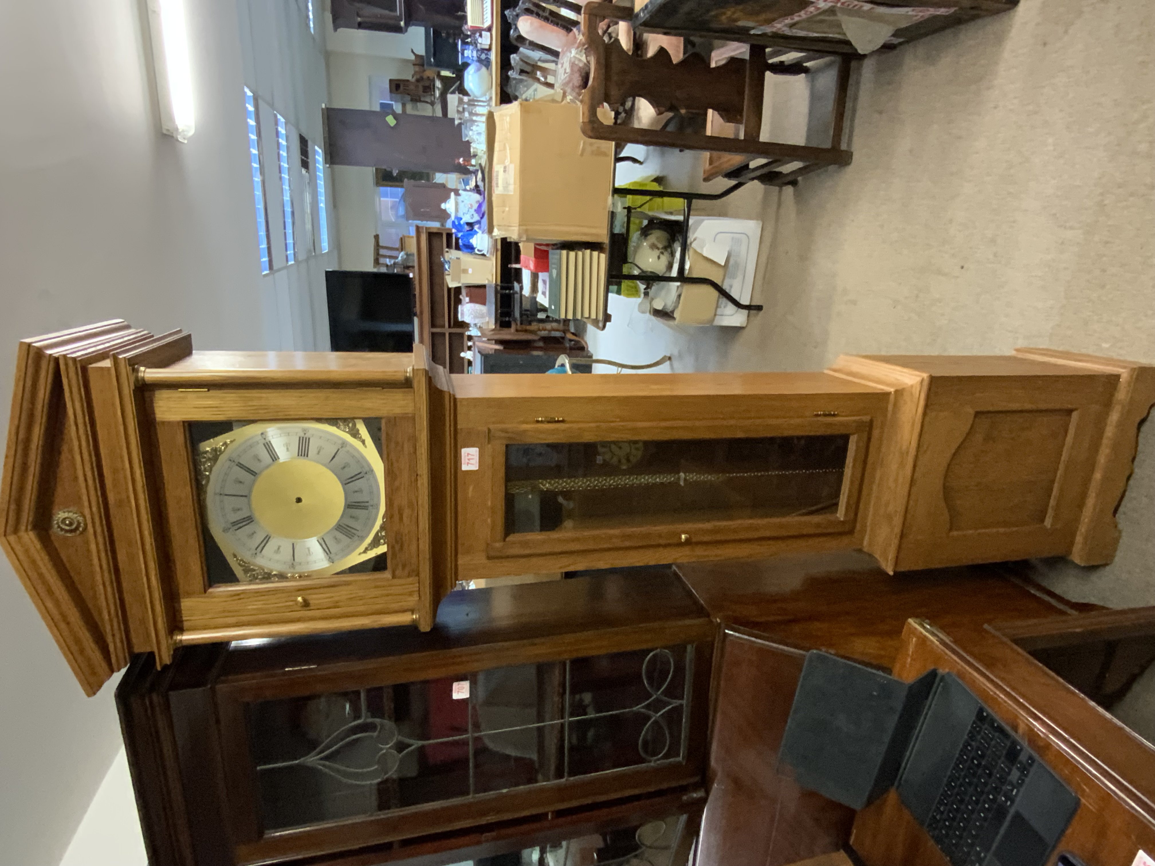 A classical style Oak grandfather clock in need of attention. 206cm (D)
