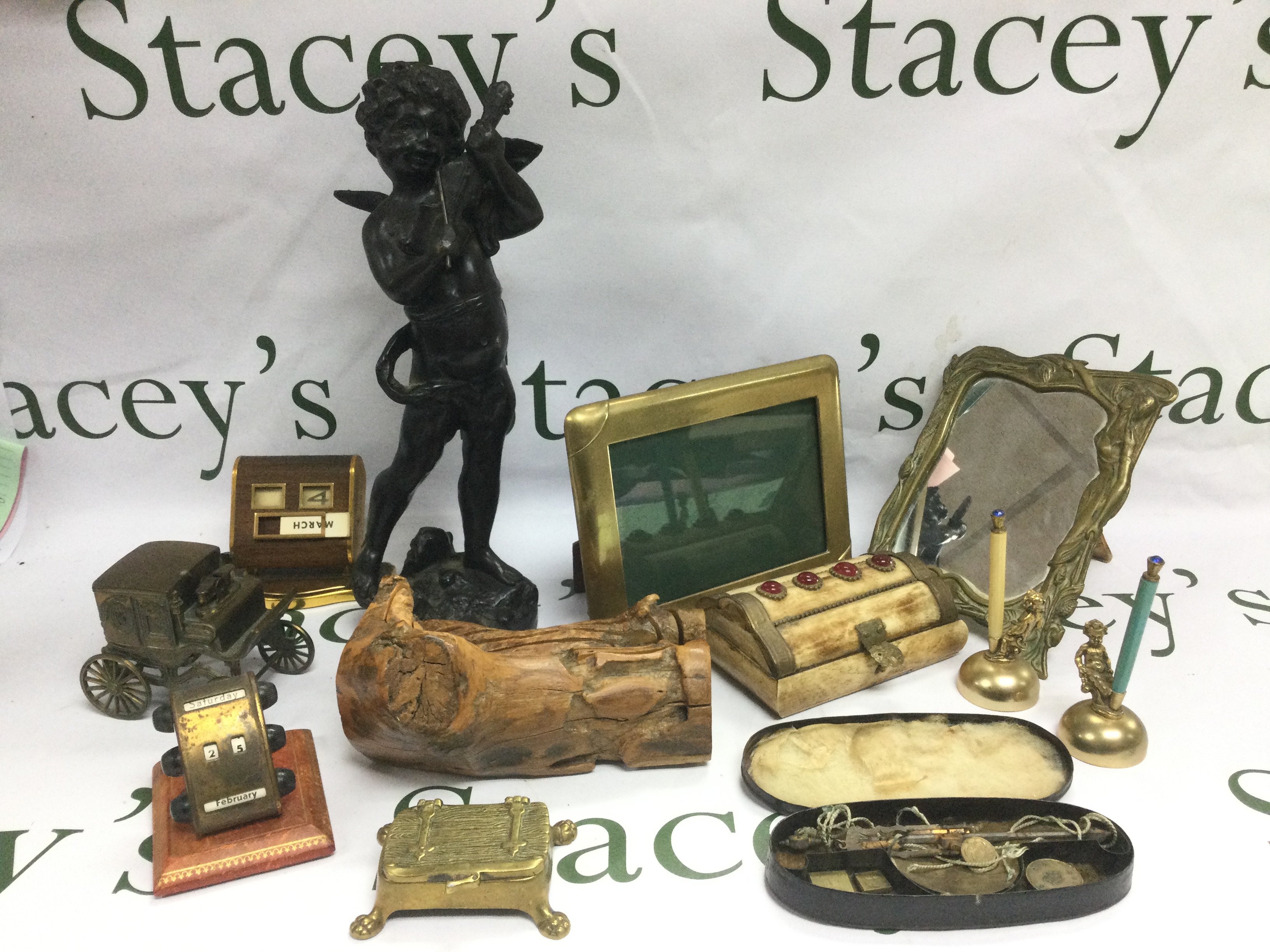 A collection of oddments comprising a bronzed figure of a cherub, brass desk items, scales and weights etc. Shipping category D.