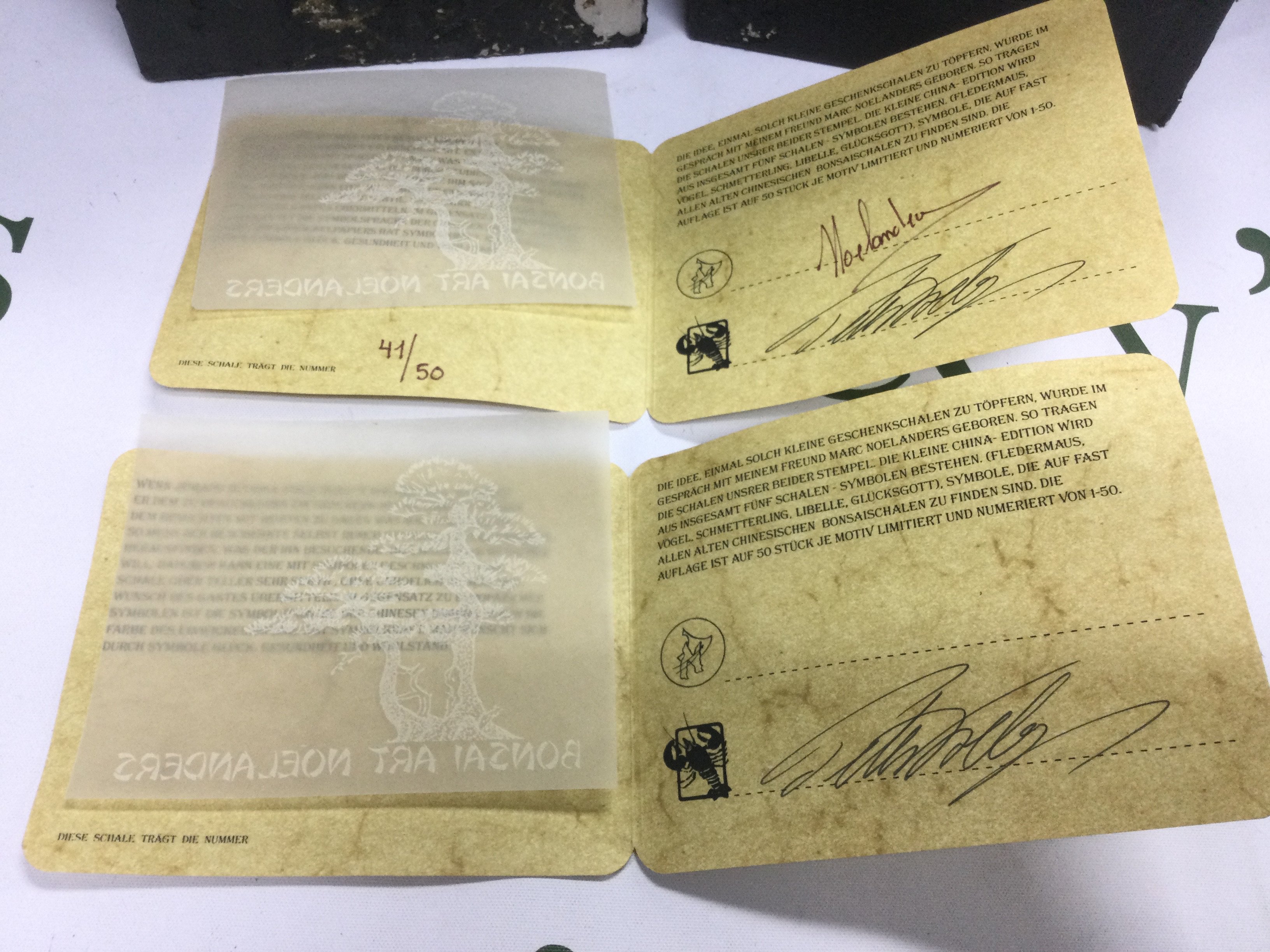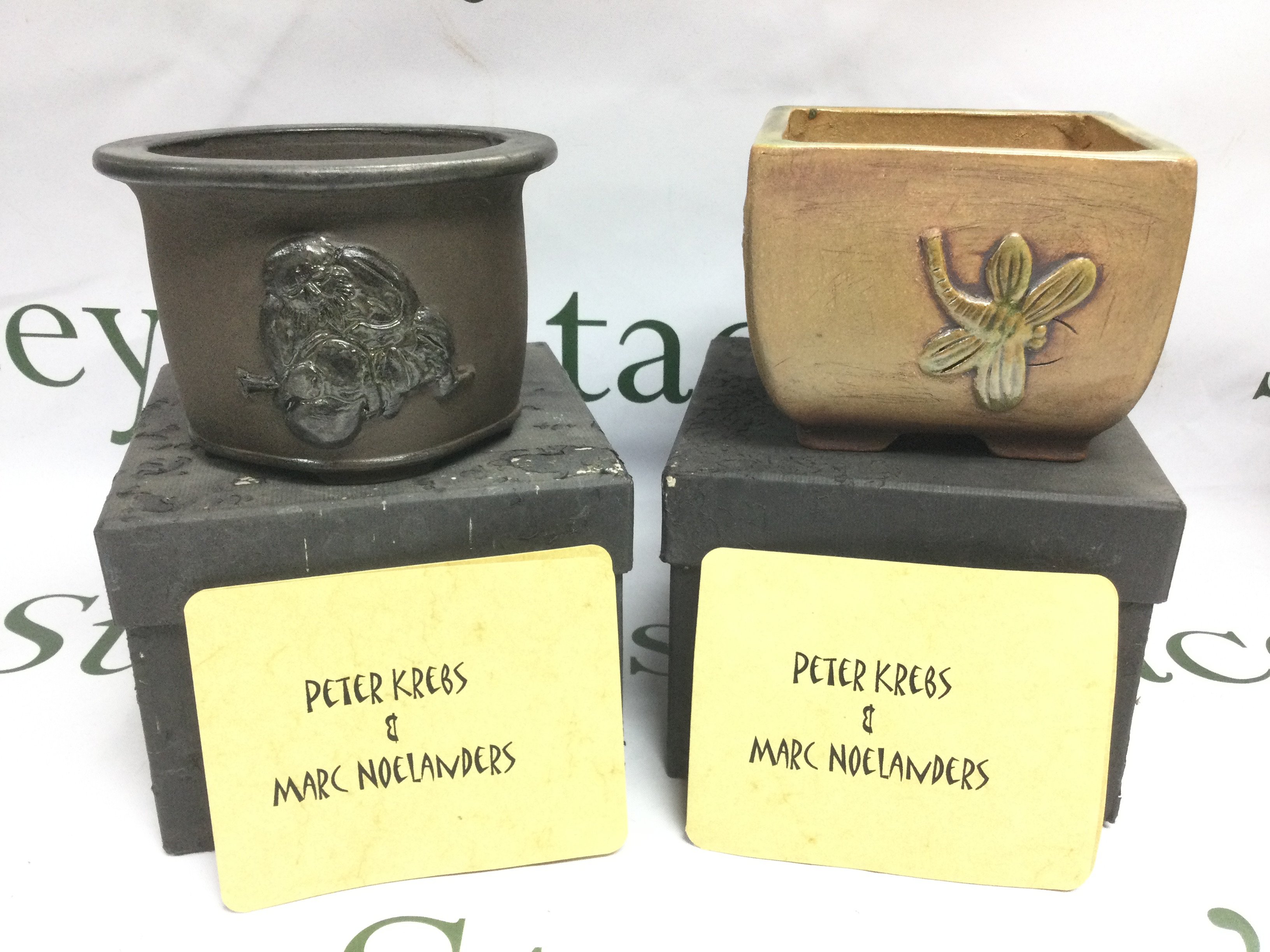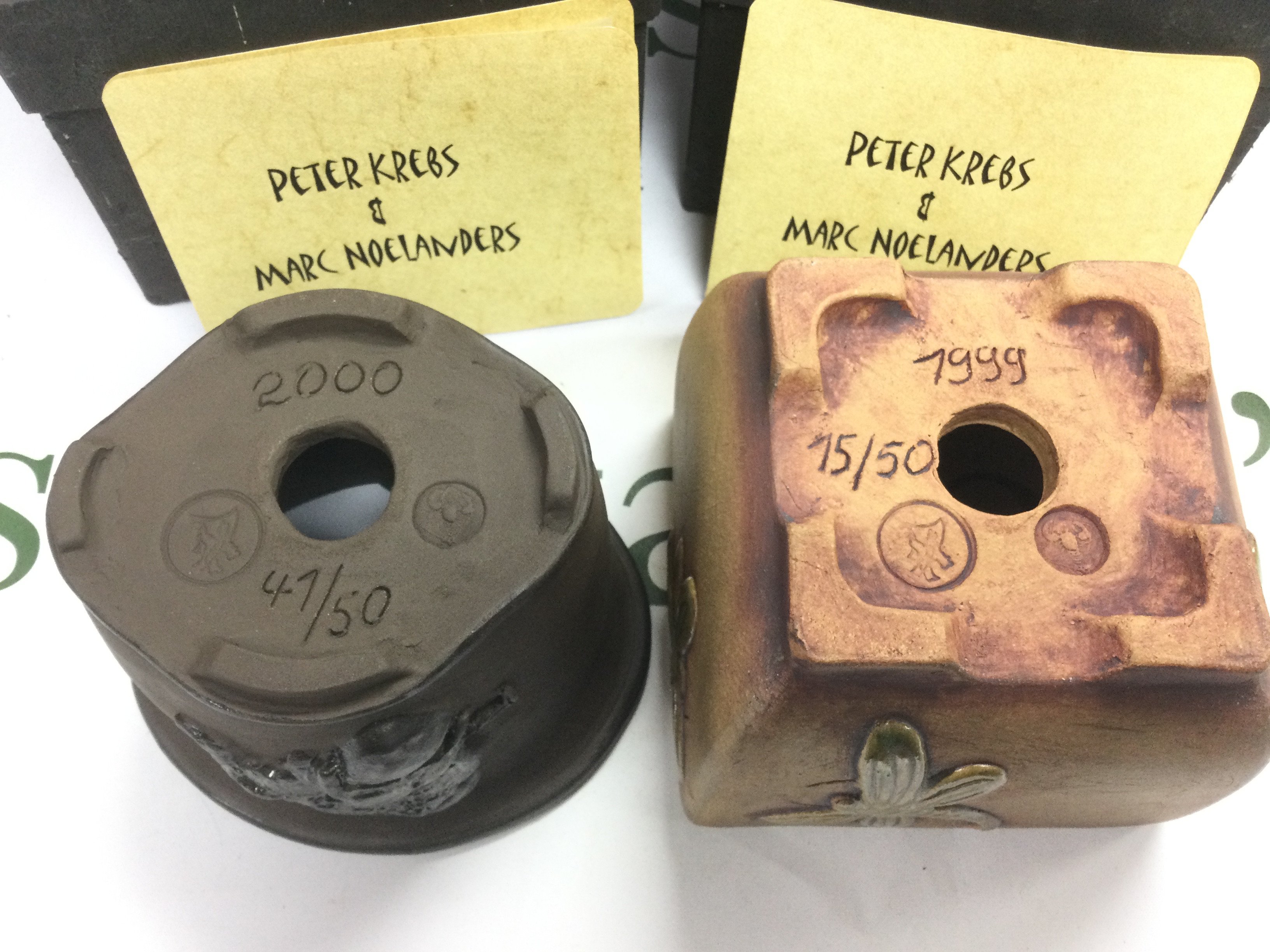 Two limited edition Peter Krebs & Marc Noelanders bonsai pots with signed COAs. Approx height 9cm. Shipping category D.